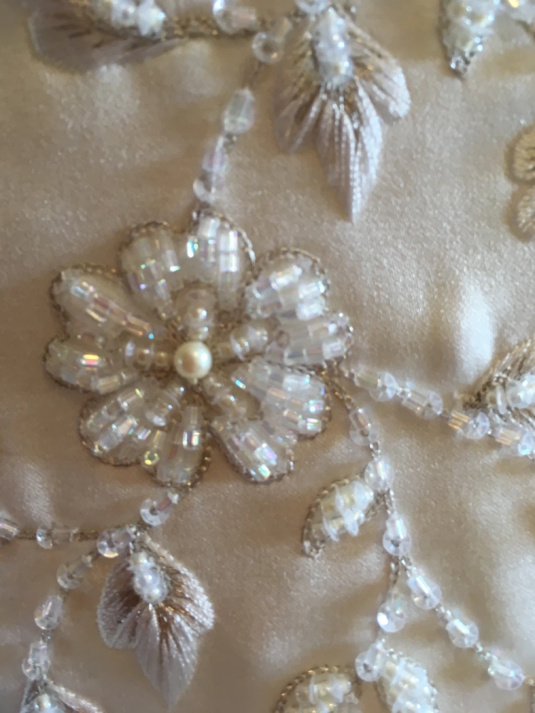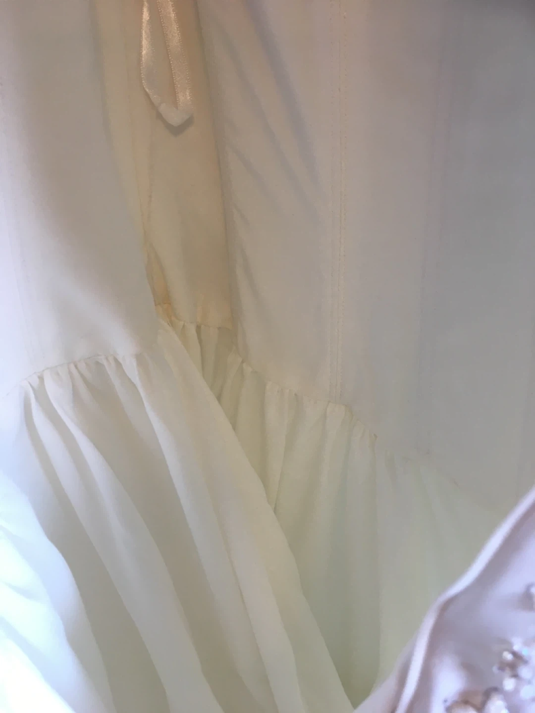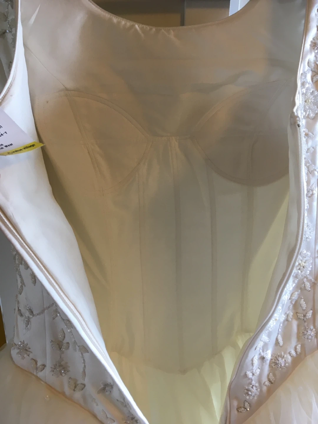 Beautiful sleeveless wedding dress with intricate beadwork on the bodice. It features a full tulle skirt with scattered pearl accents. This dress is ready for your special day!