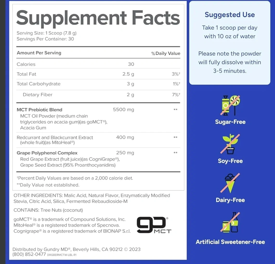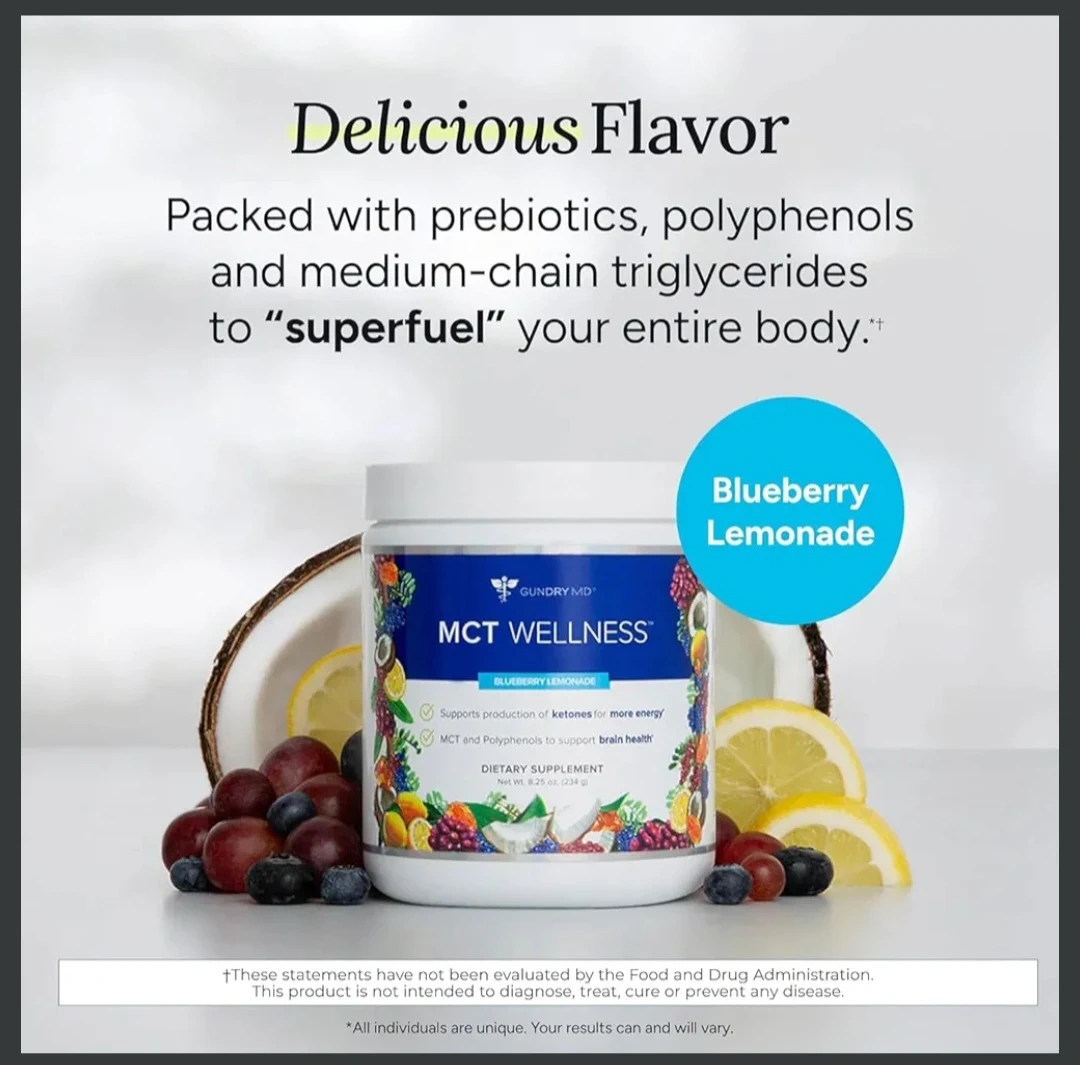 Dr. Gundry MD MCT Wellness in Blueberry Lemonade flavor. This dietary supplement contains C8 MCT powder and potent polyphenols. It's designed to support energy and brain health. Each container has 30 servings.