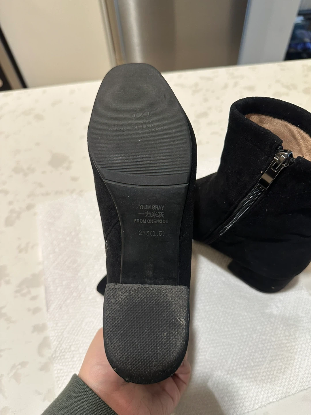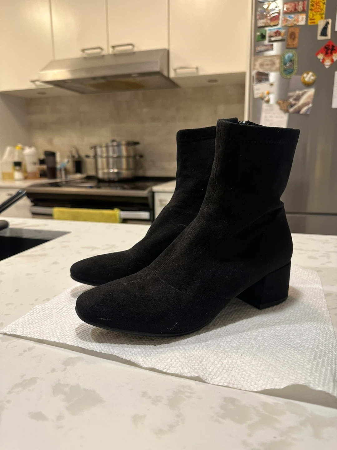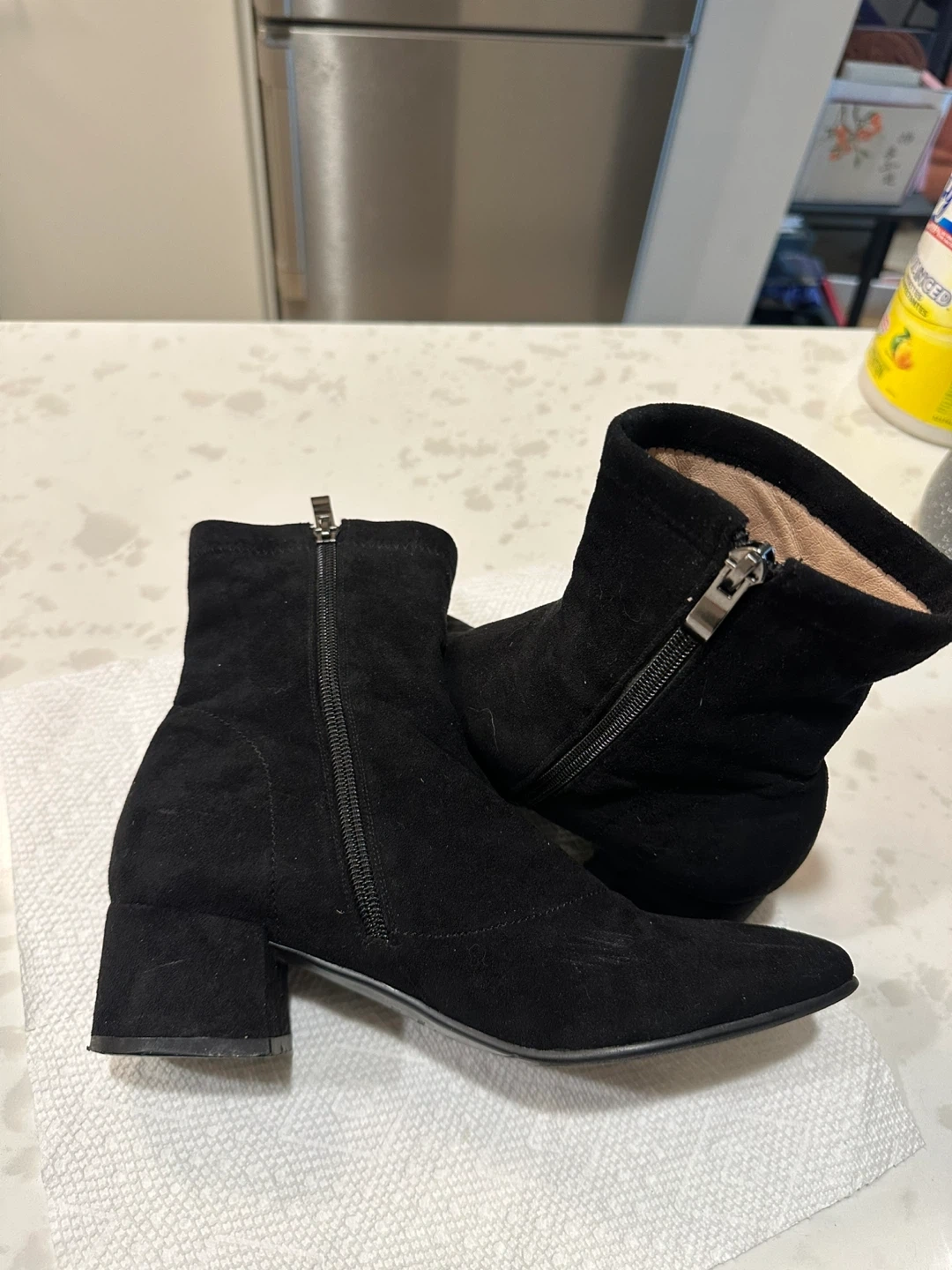 Black suede-like ankle boots with side zippers. They have a block heel and a pointed toe. Size is EU 37 (23.5 cm)(approx. 6.5 women's).