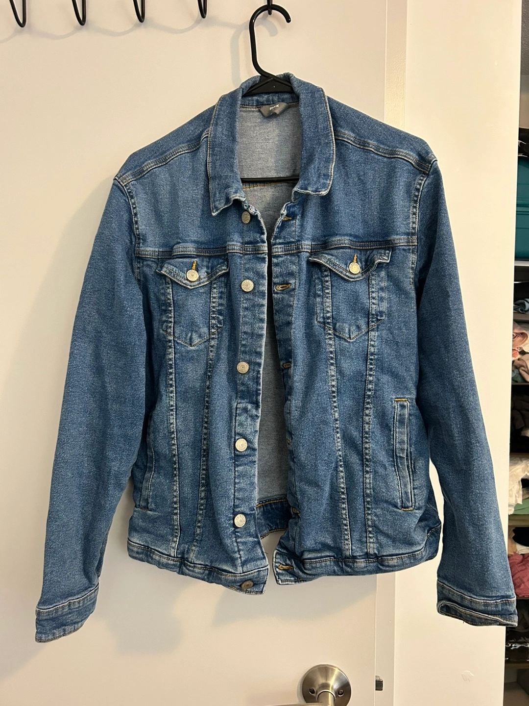 A blue denim jacket. Features button closures down the front. Has two chest pockets. Perfect for layering during the fall season, providing you with just the right amount of warmth.