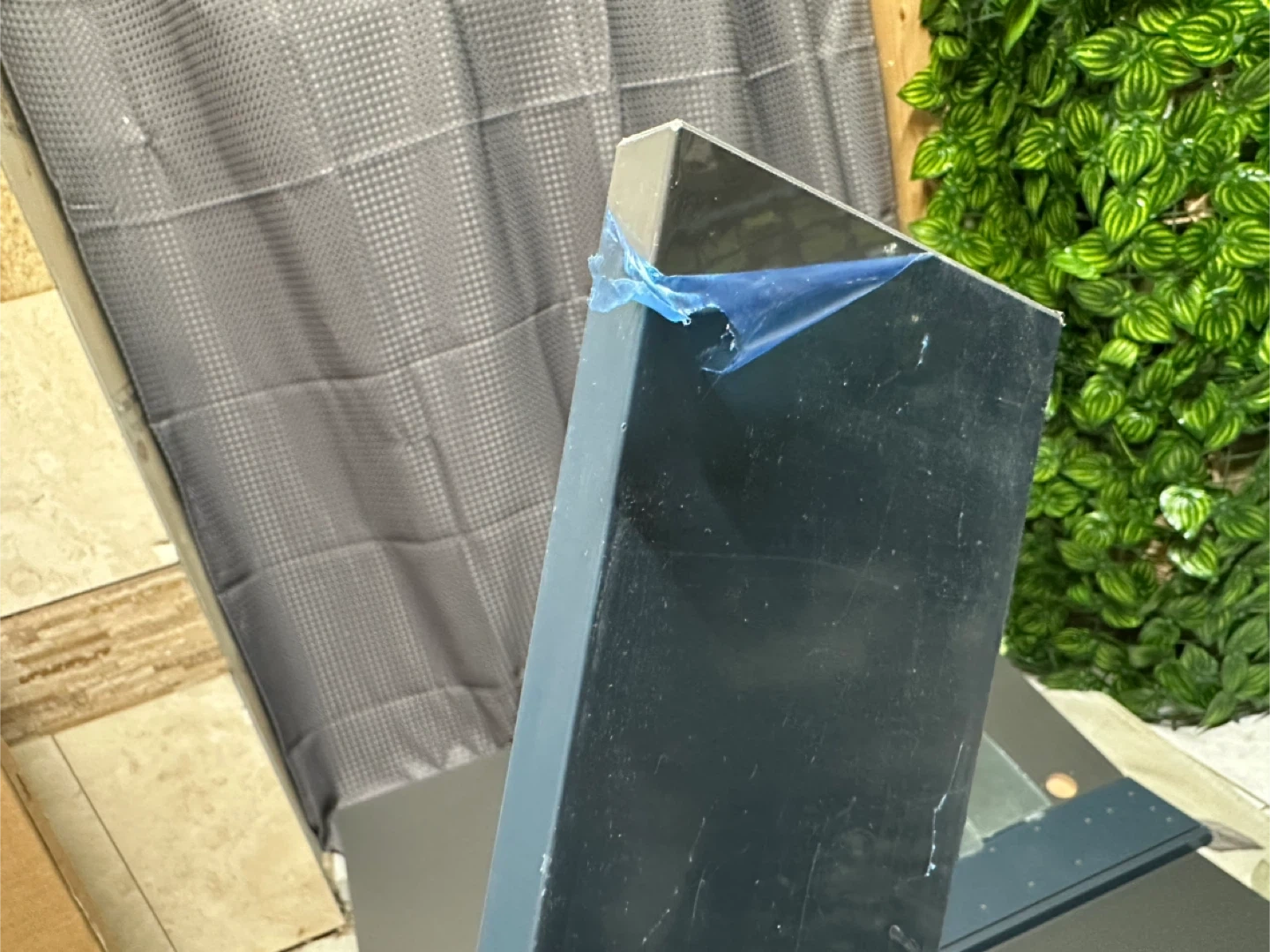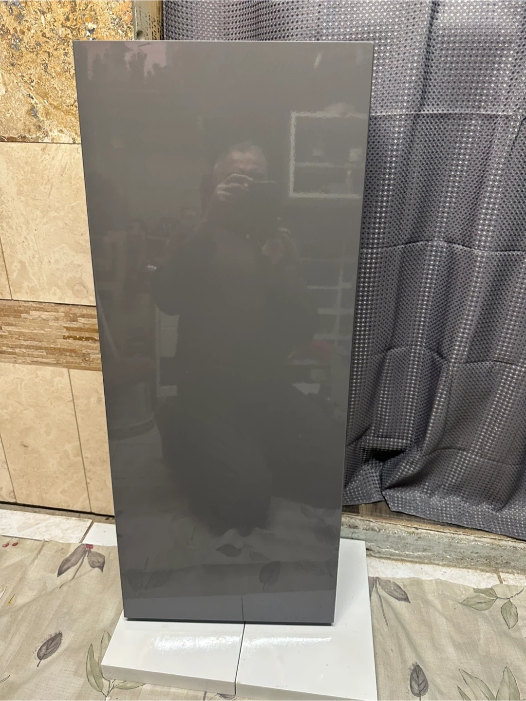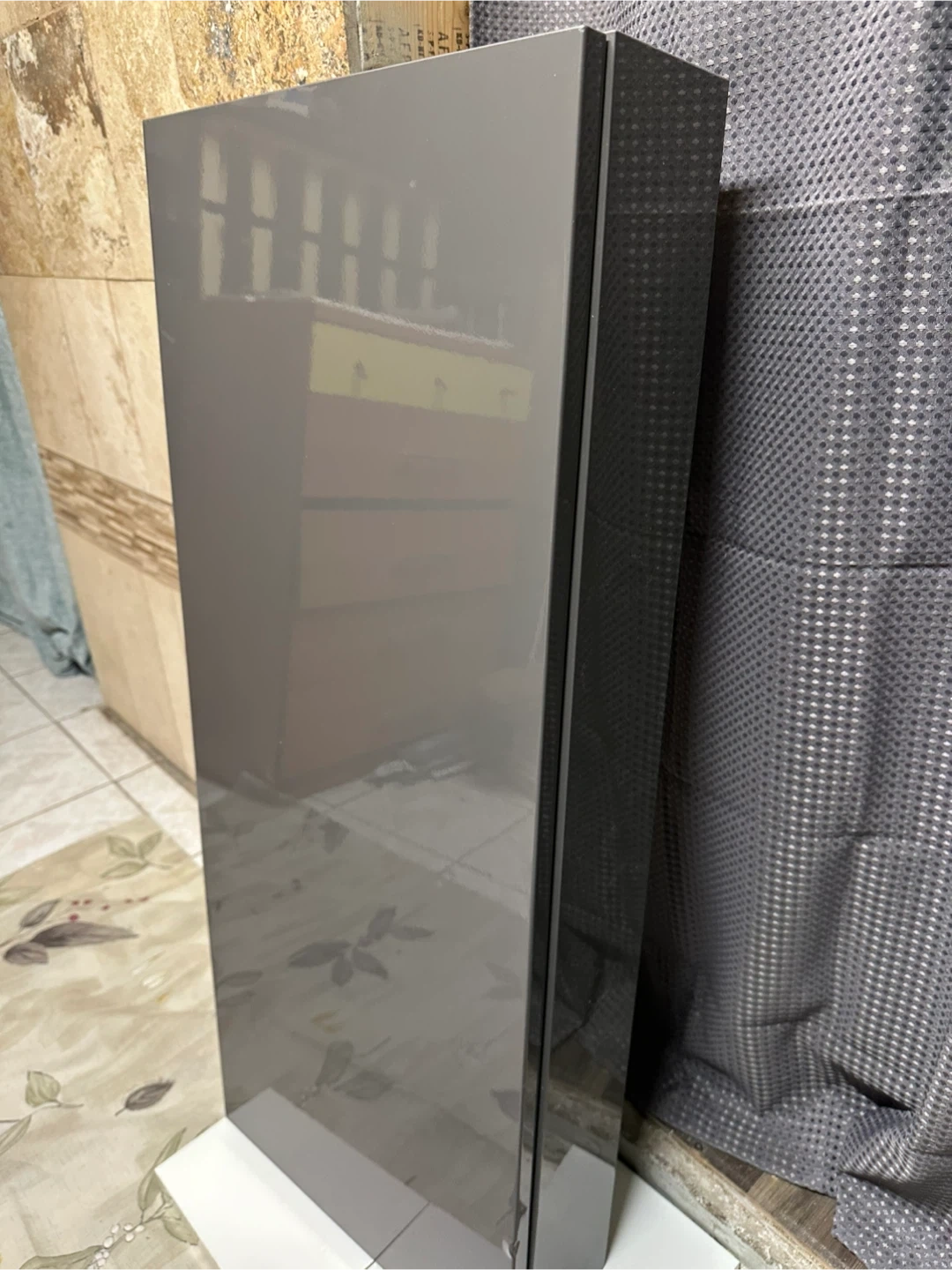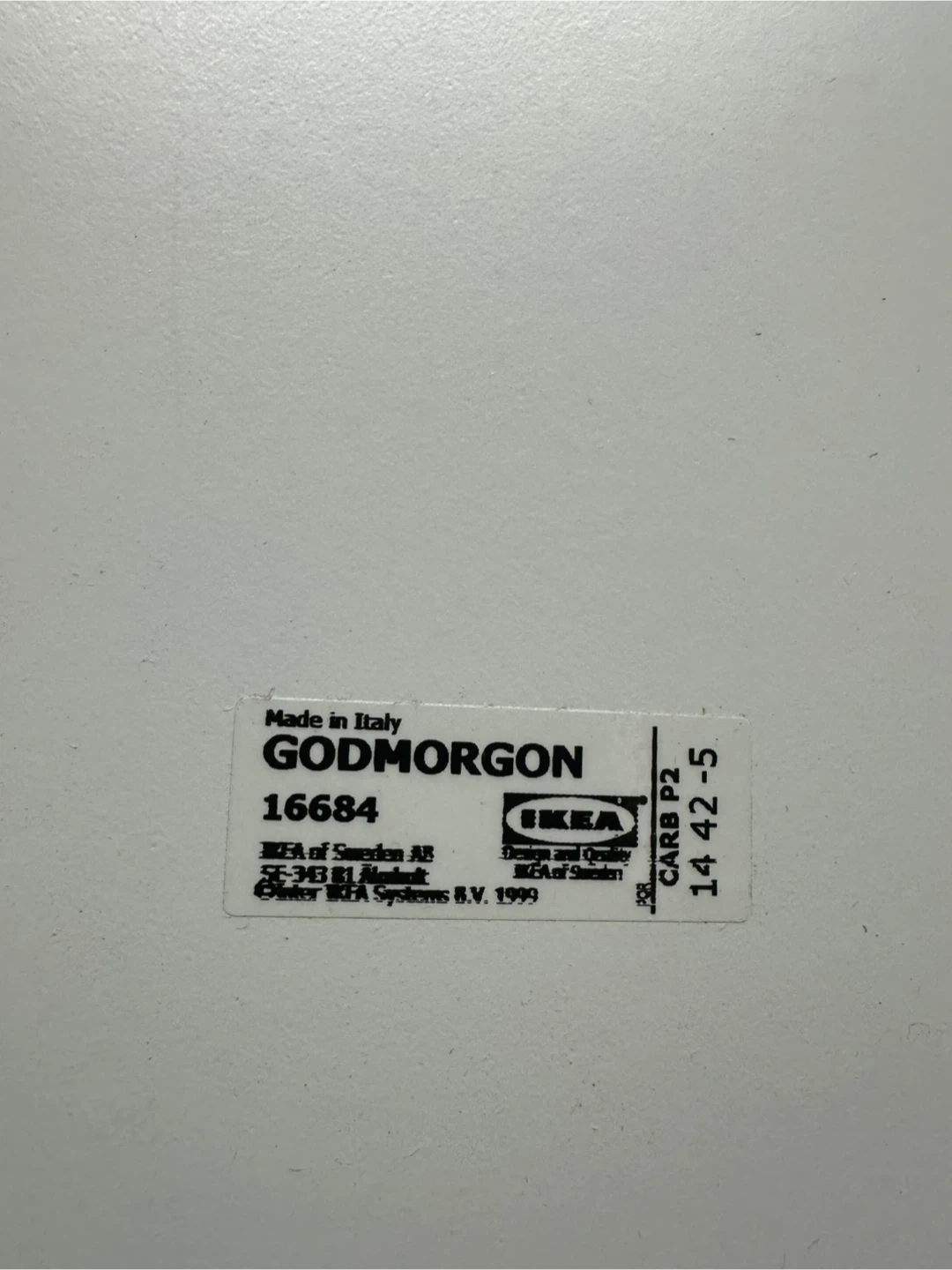This IKEA GODMORGON wall cabinet features a high gloss grey finish. It comes with adjustable glass shelves for storage. Made in Italy.