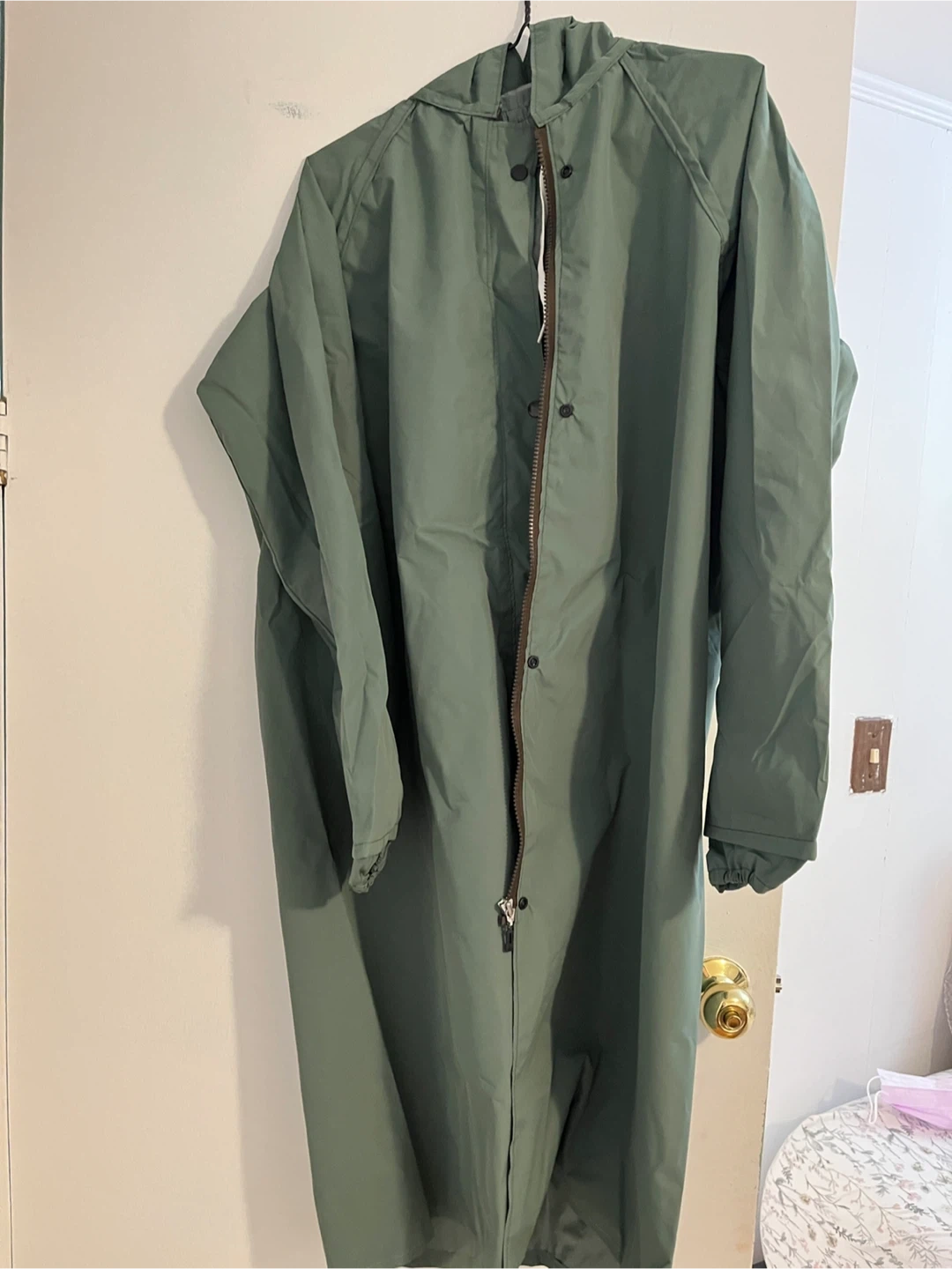 This is a green, hooded raincoat with a zipper and snap closure. It's made of a water-resistant material. This coat would be useful for staying dry on rainy days!