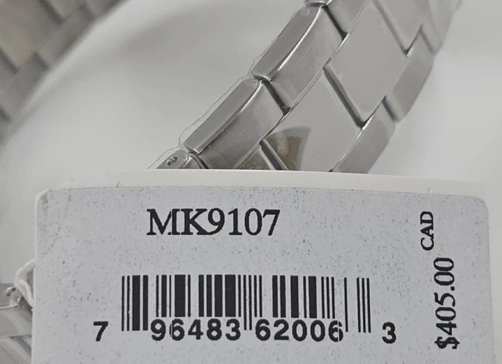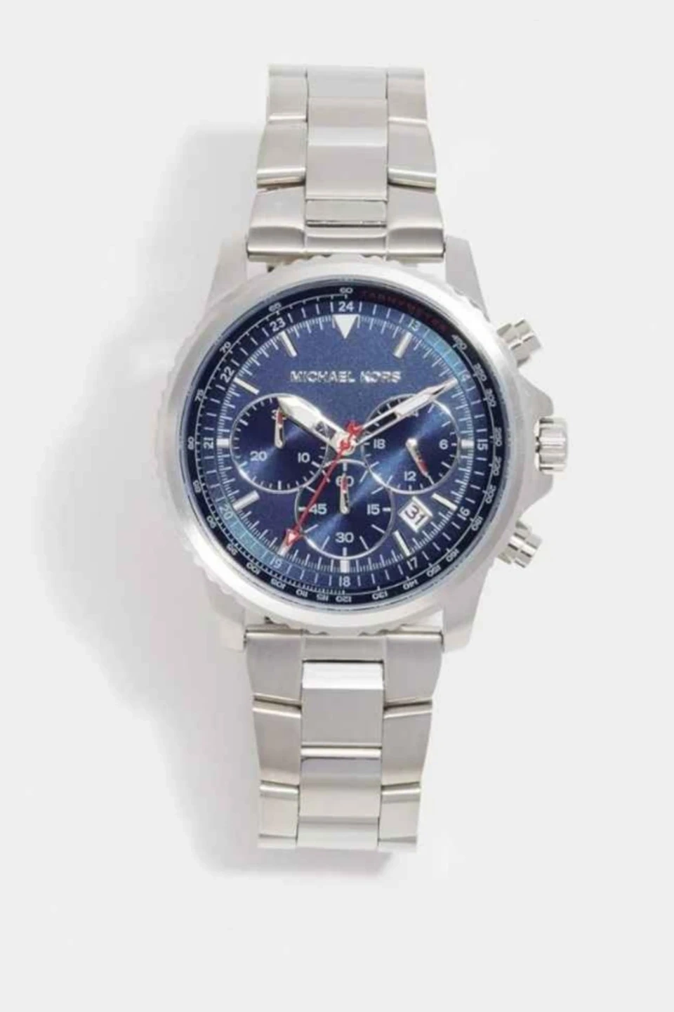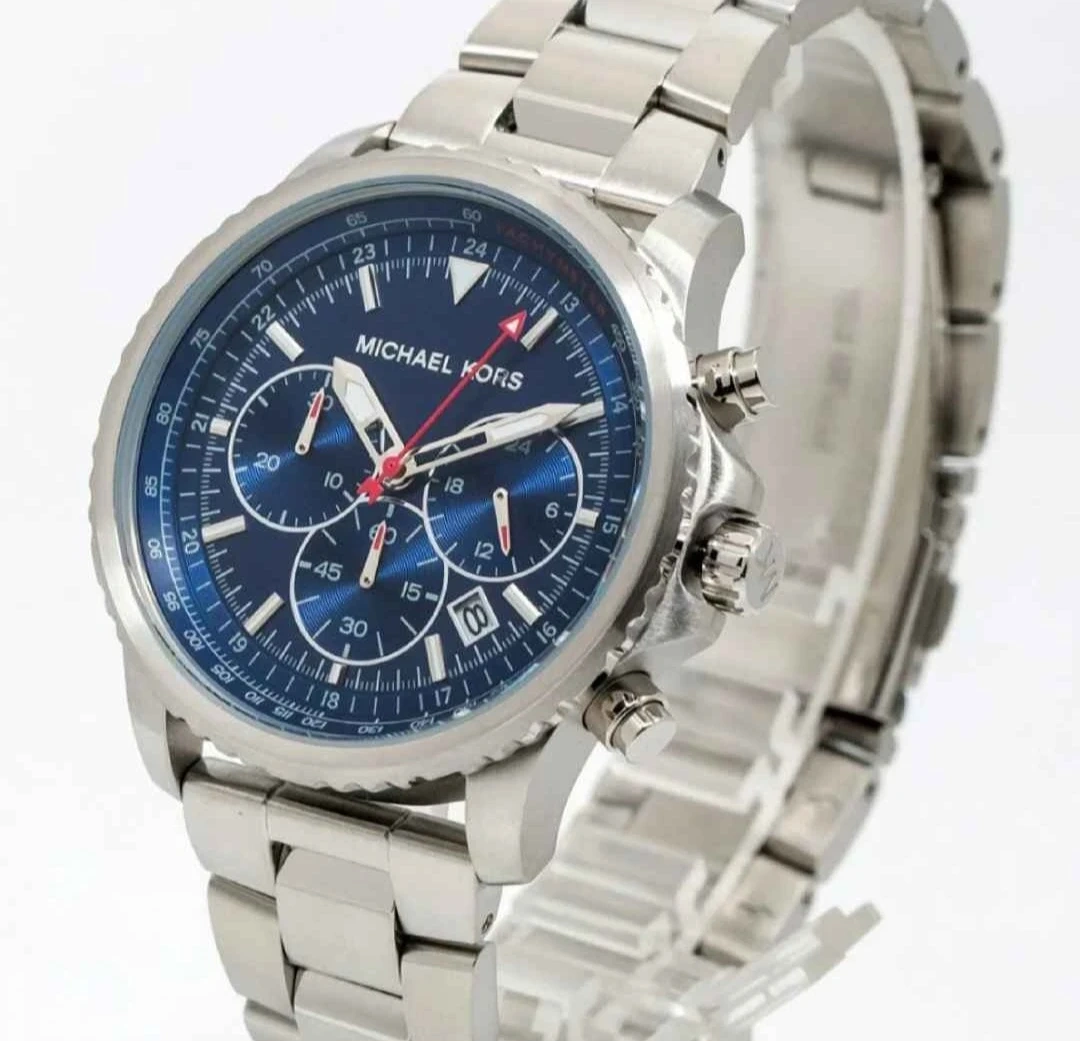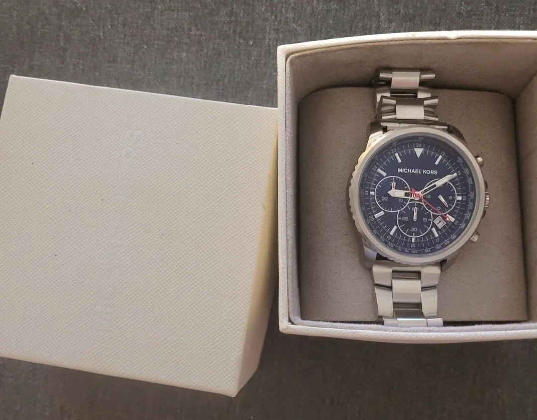 This is a Michael Kors men's chronograph watch with a blue dial and stainless steel band. It includes the original box and has a model number of MK9107. This watch comes with a date display and multiple subdials.