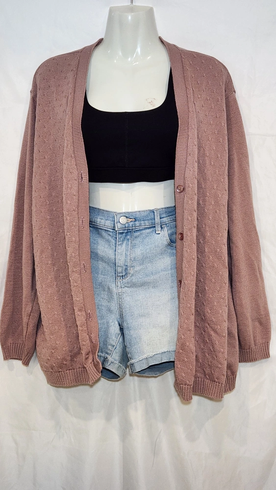 Long-sleeved cardigan with a button-up front. It is a blush pink/old rose colour with a textured knit design. Good condition.
