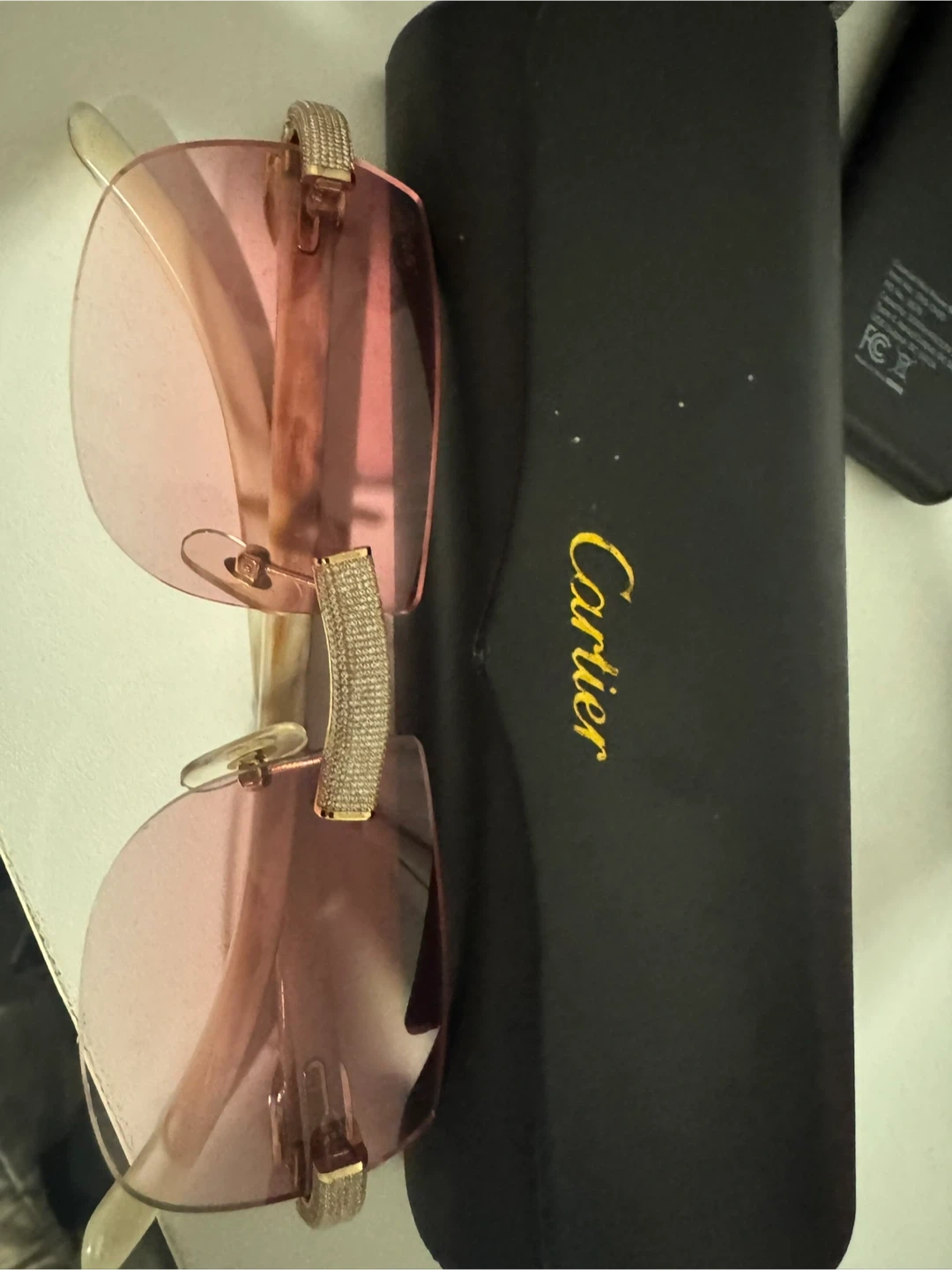 Selling a pair of Cartier sunglasses that are in great condition! They come with their original case for safekeeping. The sunglasses have a light pink tint and the frames have some bling. Perfect for sunny days! Their Moissanite diamonds. The right wing on it is also a little faulty.