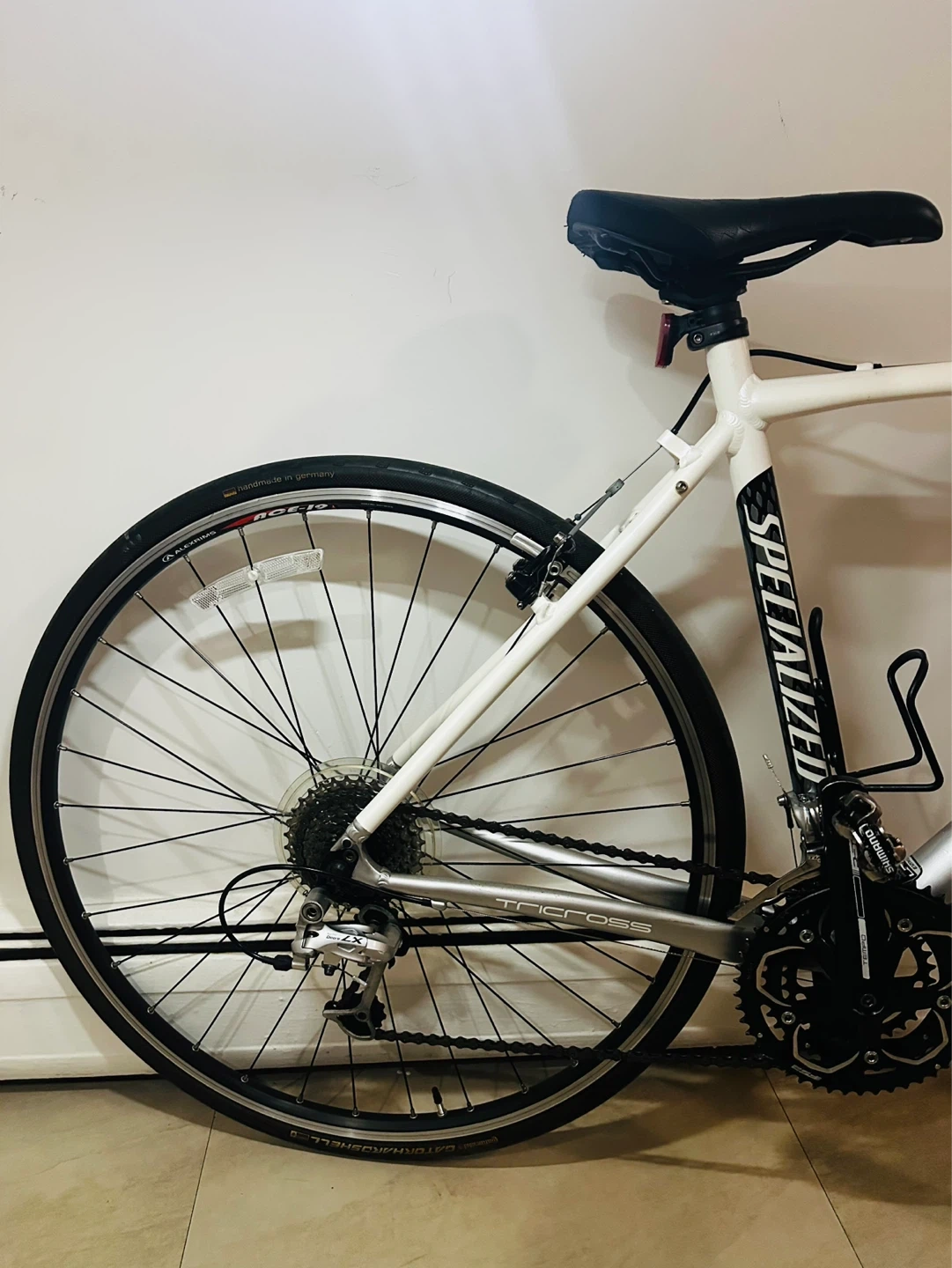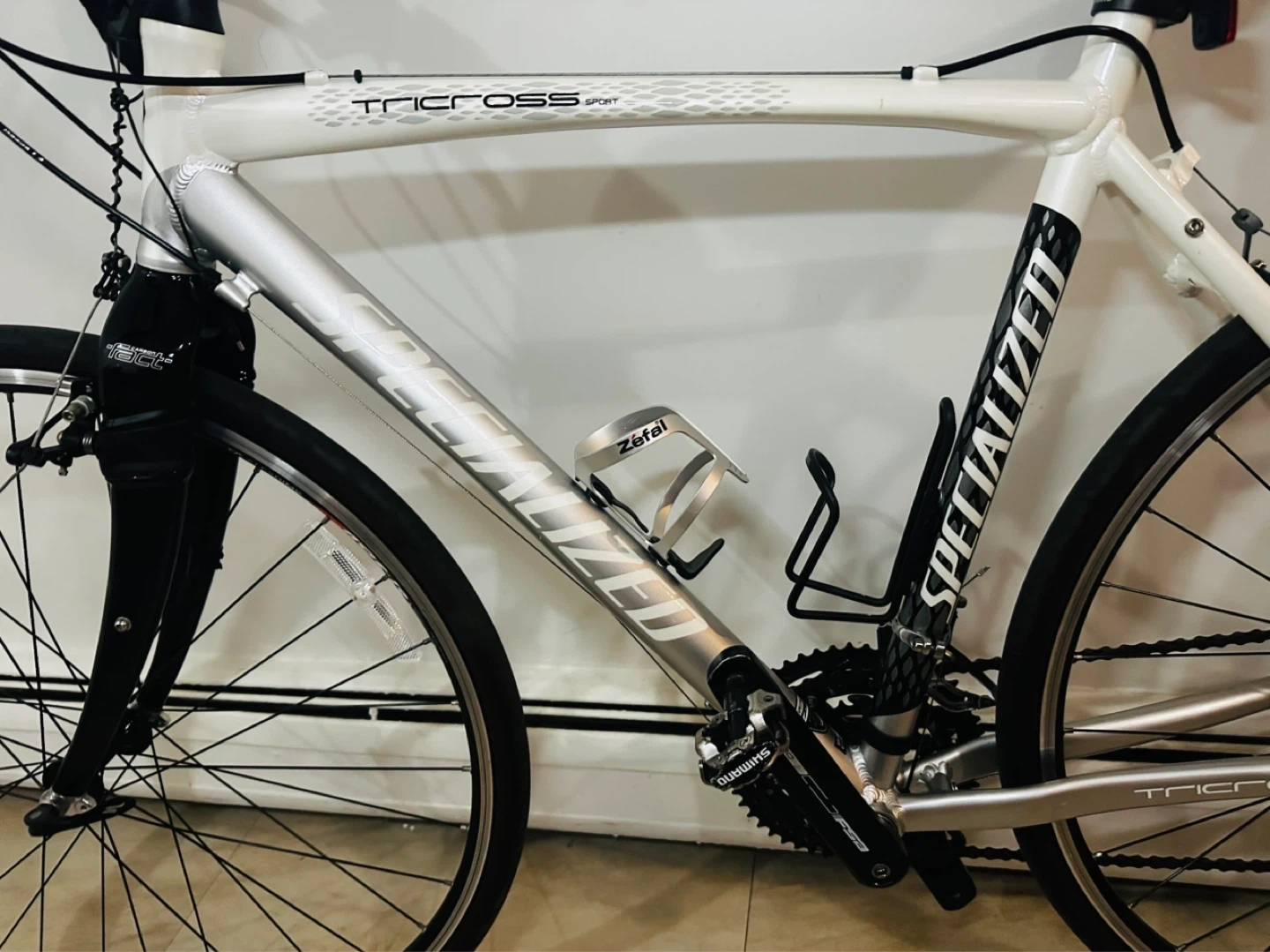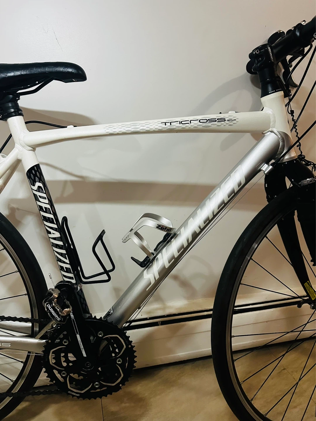 This is a Specialized Tricross Sport Disc hybrid bike. It features a lightweight aluminum frame and disc brakes for reliable stopping power. Tires are Specialized All Condition Sport 700x28C. Comes with a water bottle cage.