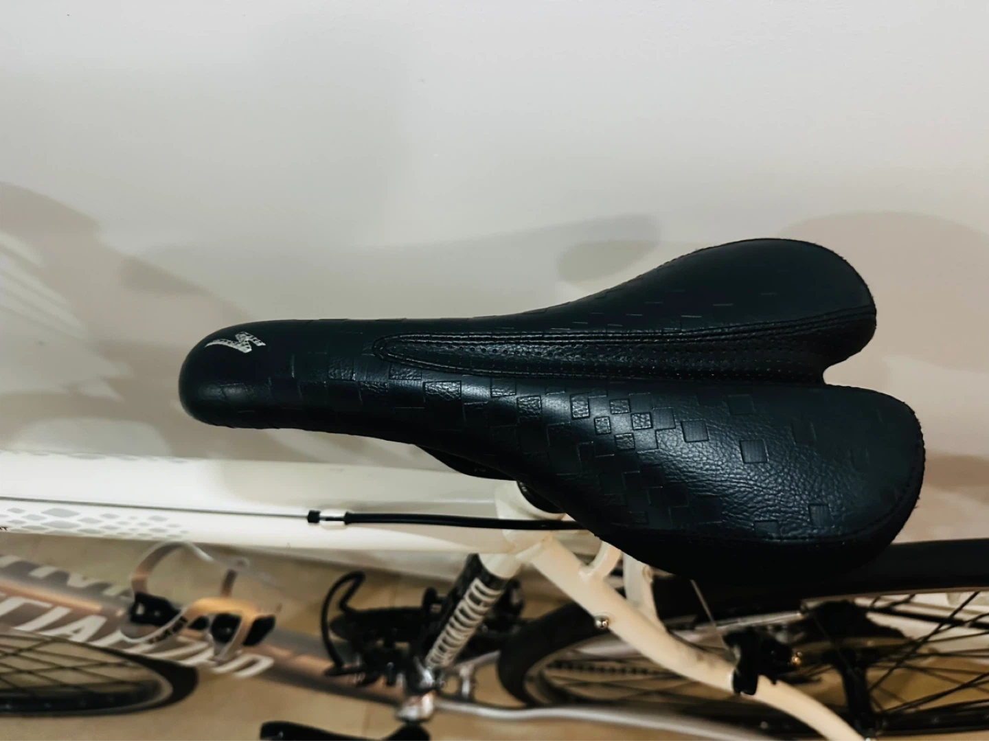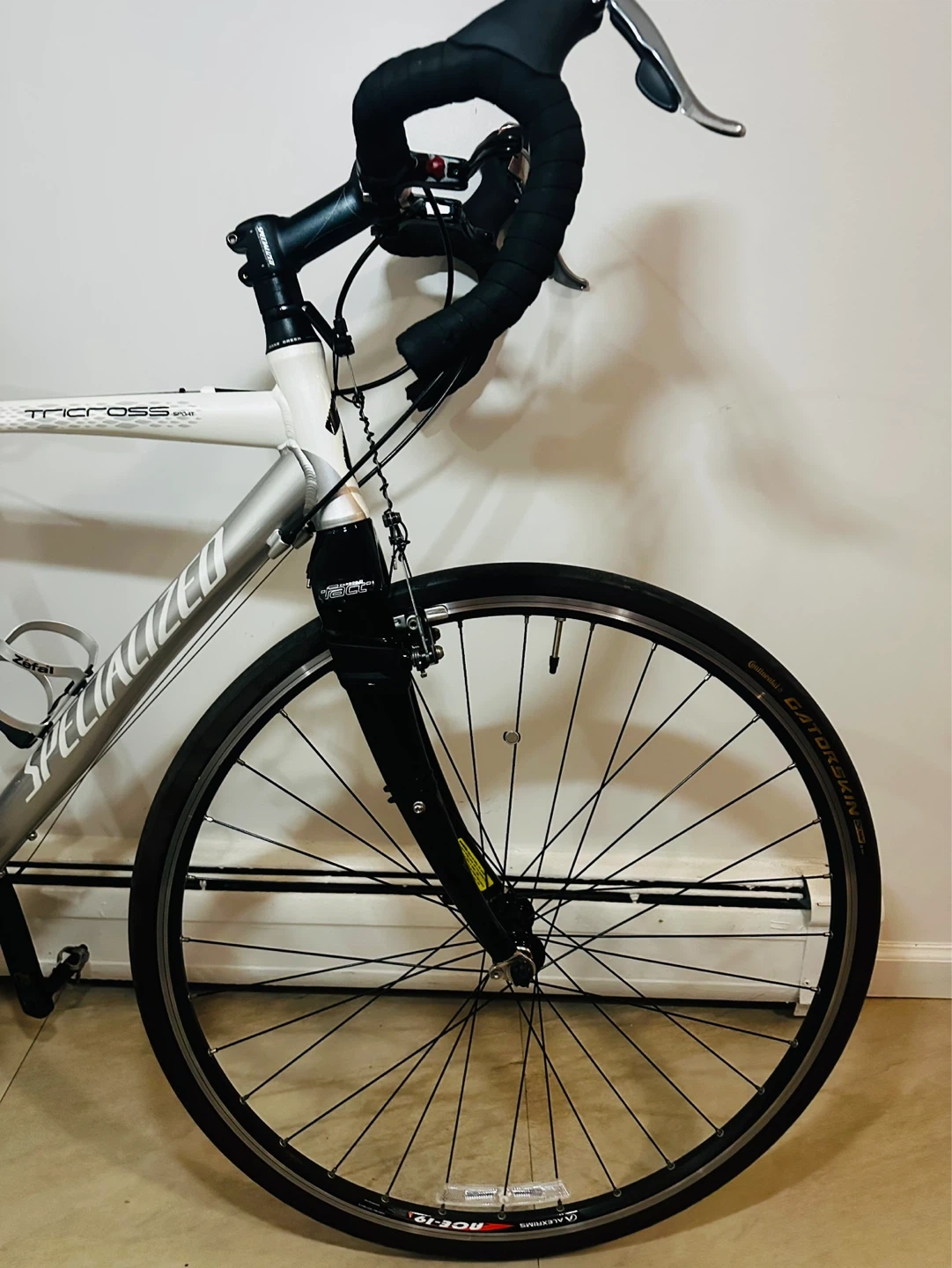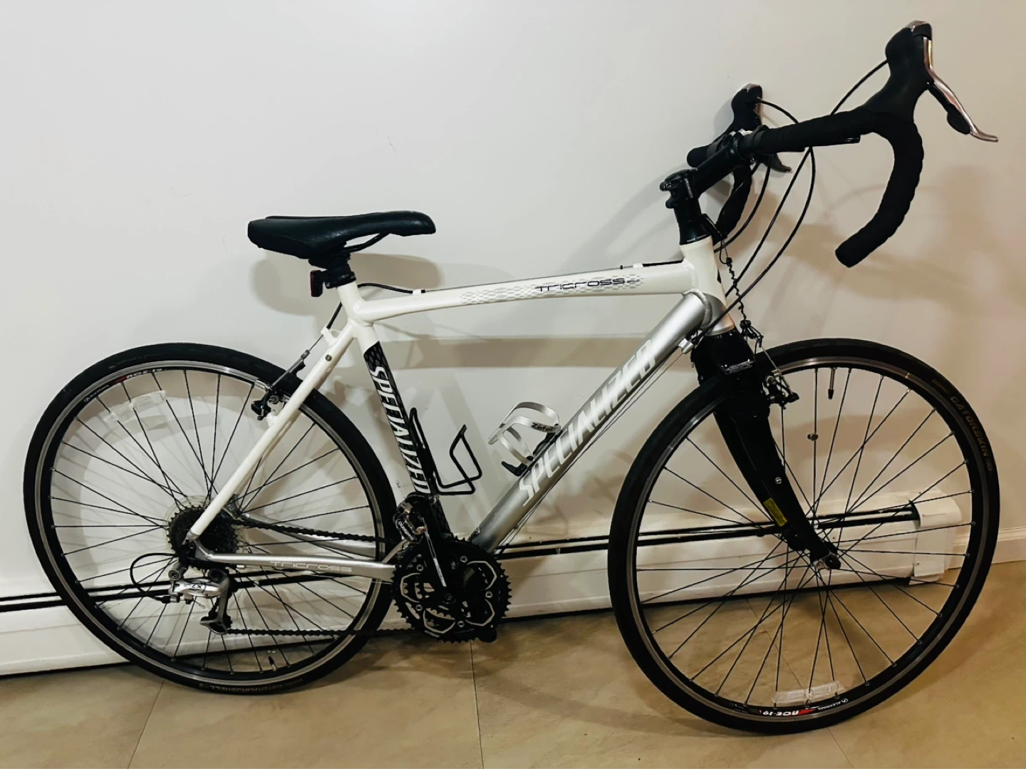This is a Specialized Tricross Sport Disc hybrid bike. It features a lightweight aluminum frame and disc brakes for reliable stopping power. Tires are Specialized All Condition Sport 700x28C. Comes with a water bottle cage.