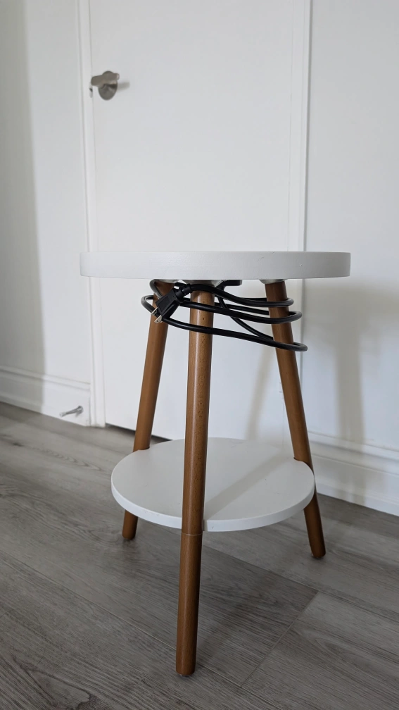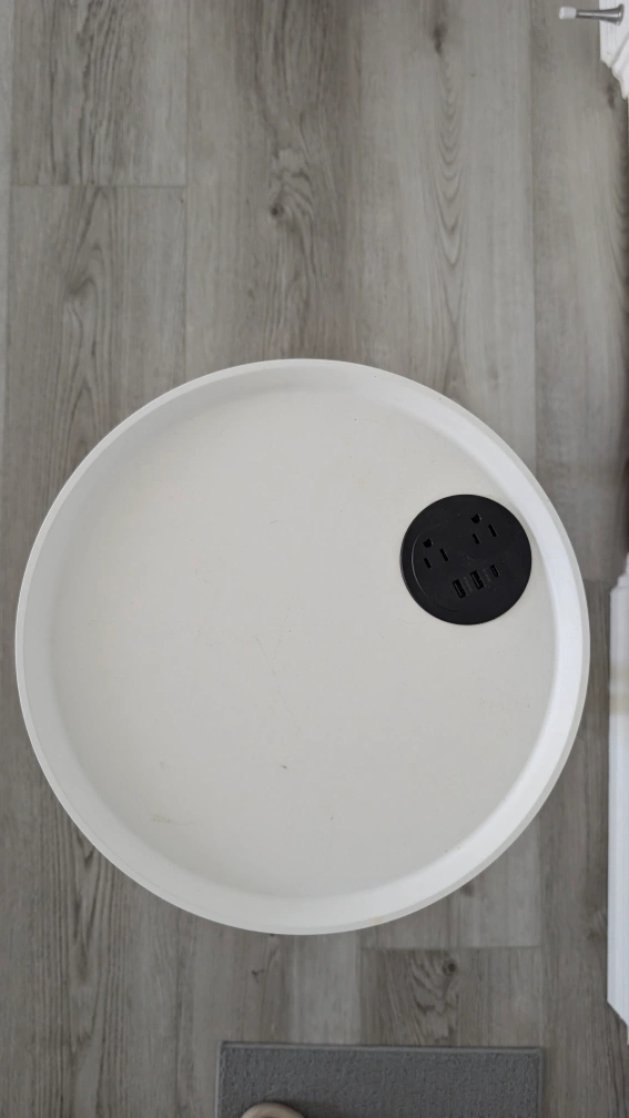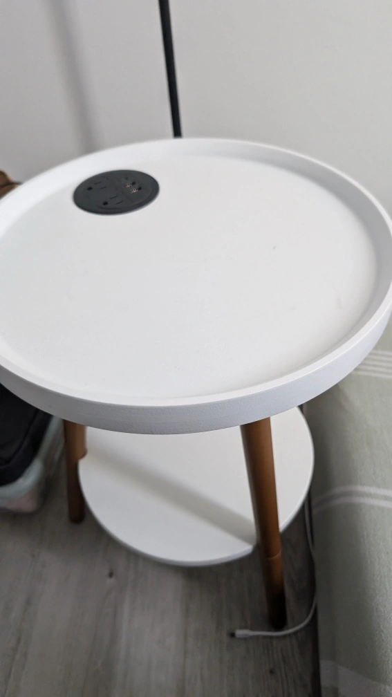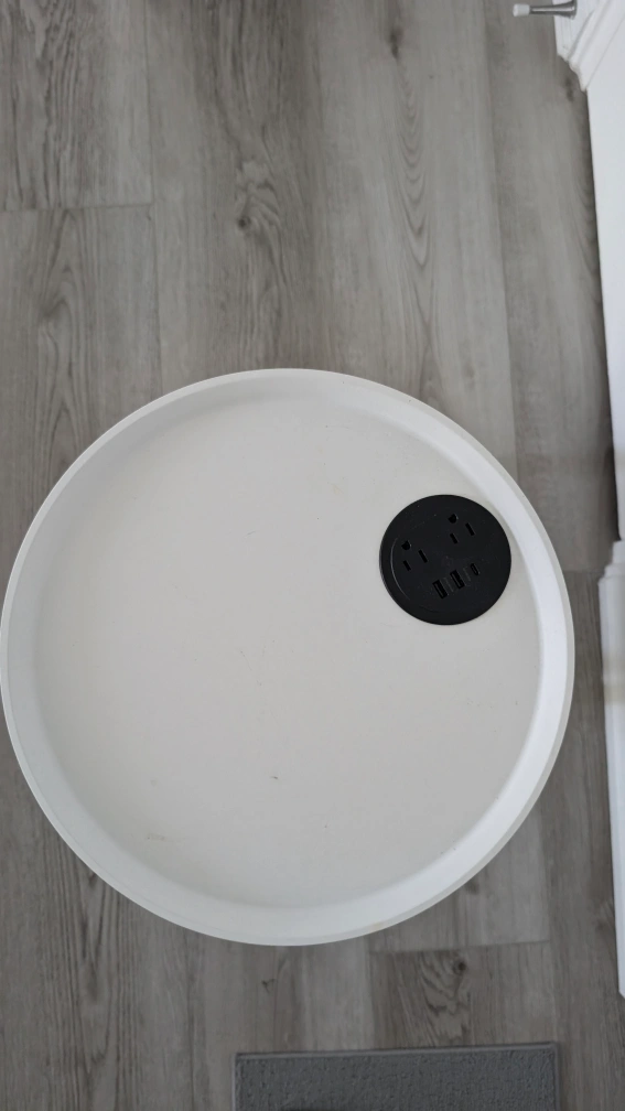 Round end table with built-in power outlet and USB ports. Wooden legs. White top.Round Small Coffee Table, Creative Wooden Load-Bearing Non-deform
