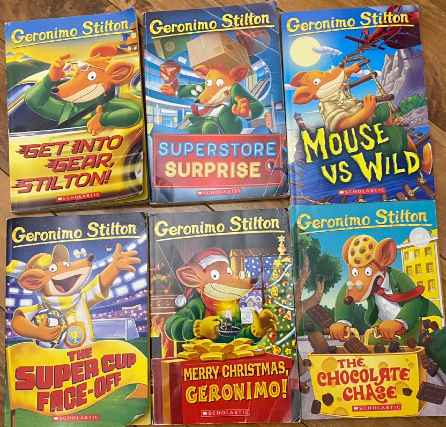 Collection of six Scholastic Geronimo Stilton books. Titles include: Get Into Gear, Stilton!, Superstore Surprise, Mouse vs Wild, The Super Cup Face-Off, Merry Christmas, Geronimo!, and The Chocolate Chase.
