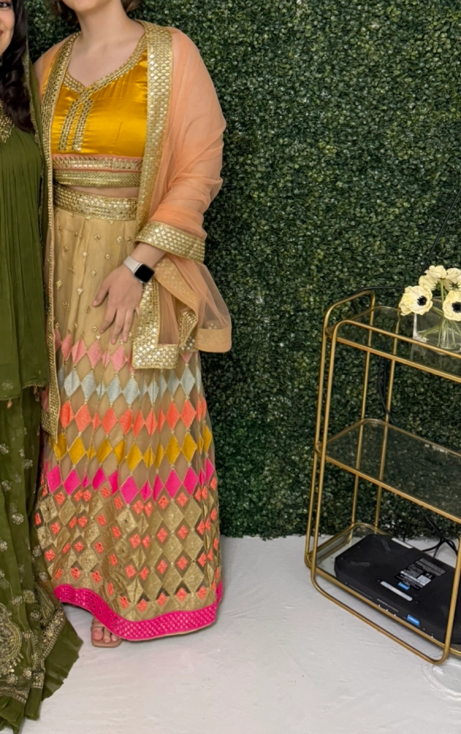Beautiful two-piece bridal lehenga choli. Yellow crop top, beige skirt with colorful embroidery. Includes a sheer peach dupatta. Perfect for weddings or special occasions. Worn once.