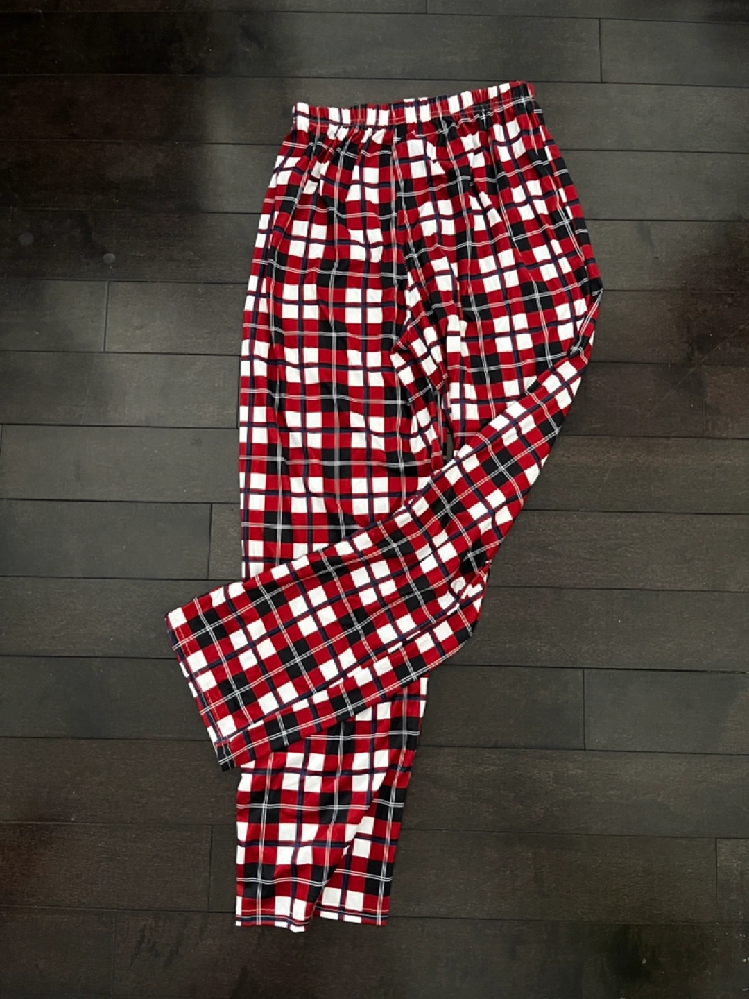 Cozy Christmas pajama set. Features a black reindeer graphic tee and red and white plaid pajama pants. Elastic waistband. Perfect for a festive night in.