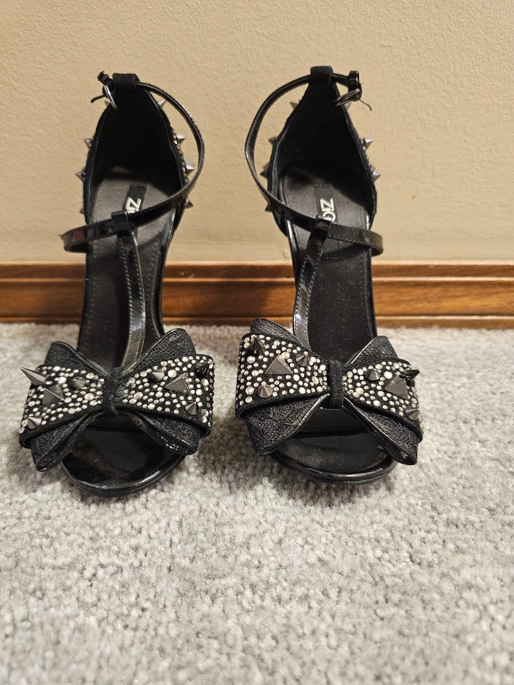 Elegant black high heels. Features a delicate bow detail and studded accents. Ankle strap closure. Perfect for a night out.