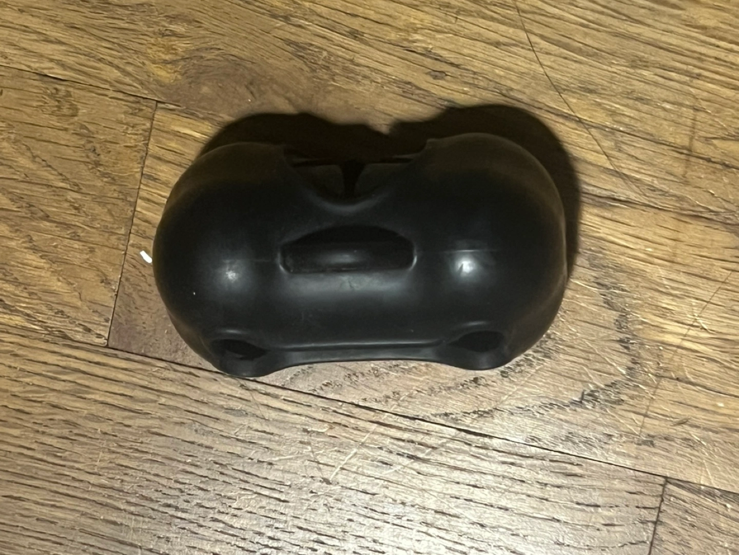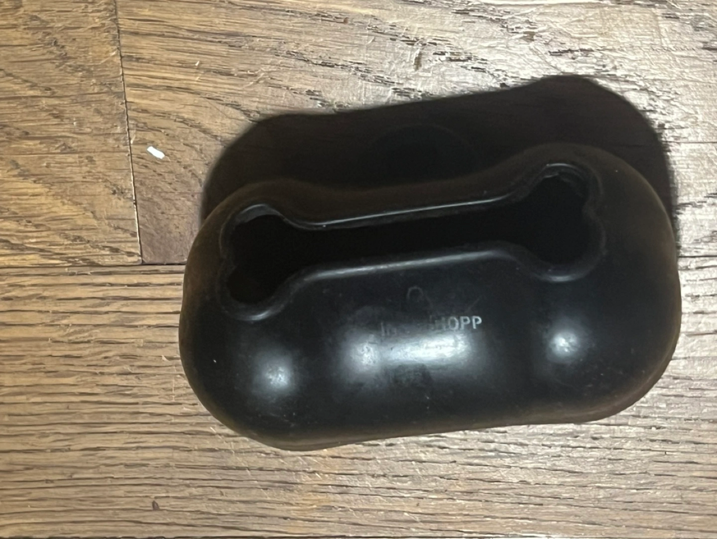 Black plastic dog waste bag dispenser. Features a star-shaped cutout. Small and lightweight. Clip to leash or bag.
