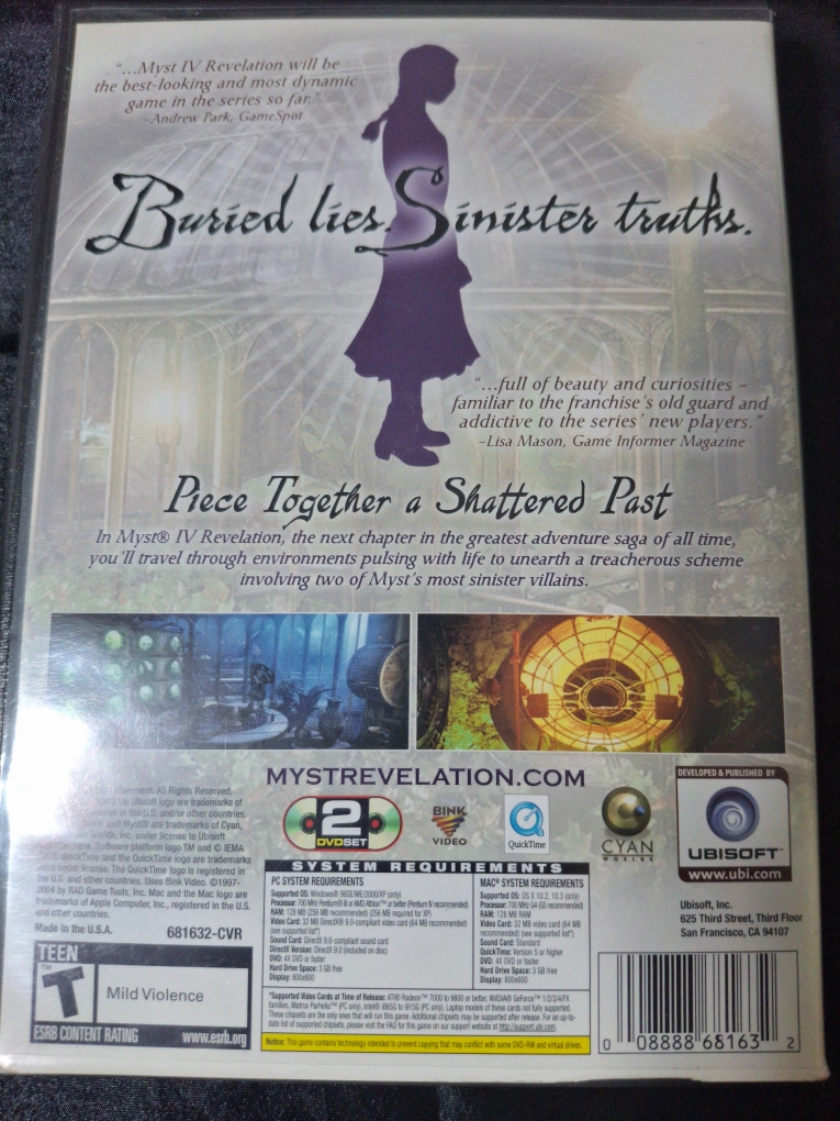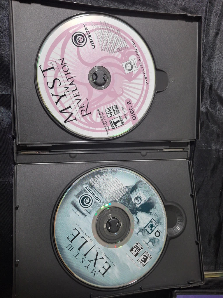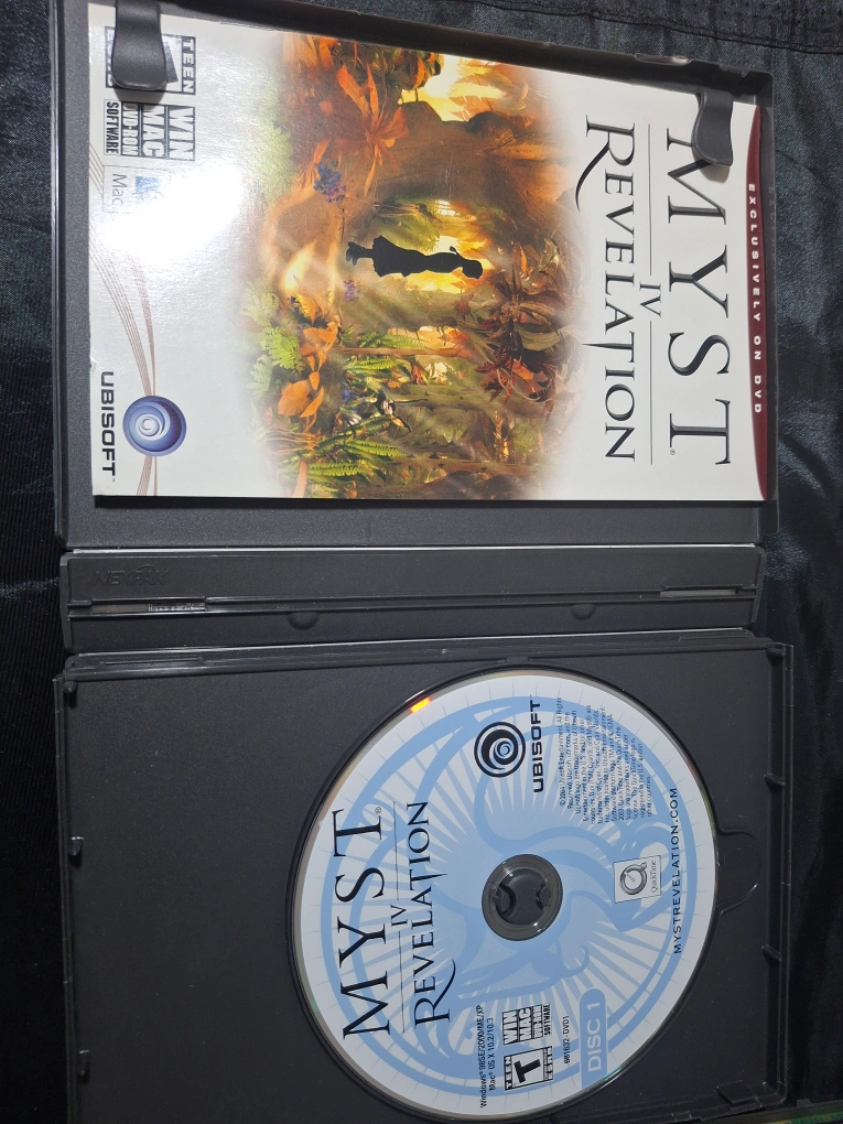 Pre-owned Myst IV Revelation PC game. DVD-ROM version for Windows and Mac. Includes two discs. Game case and discs included.