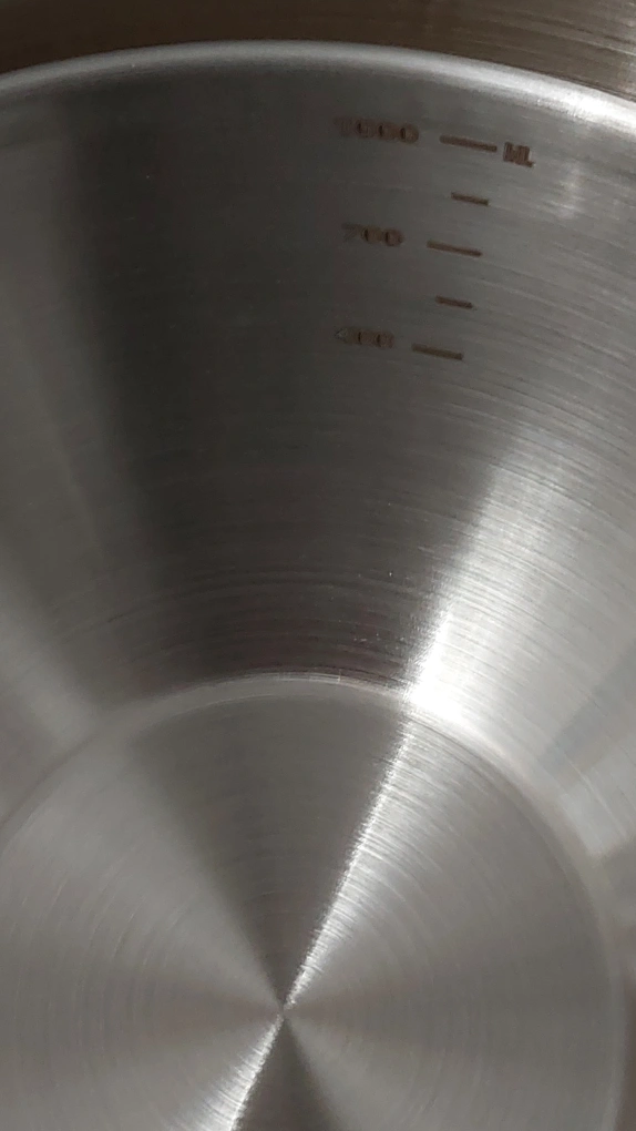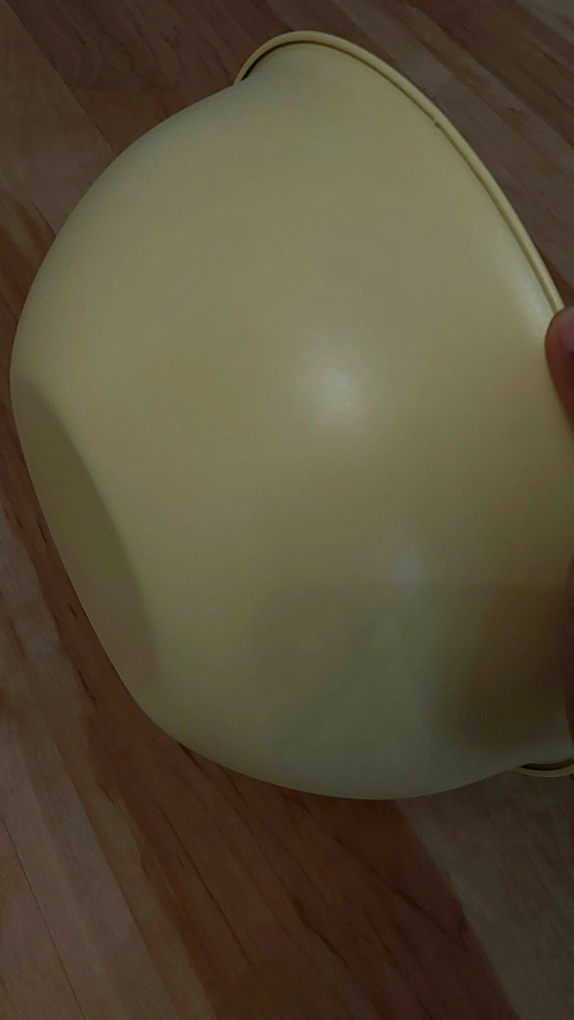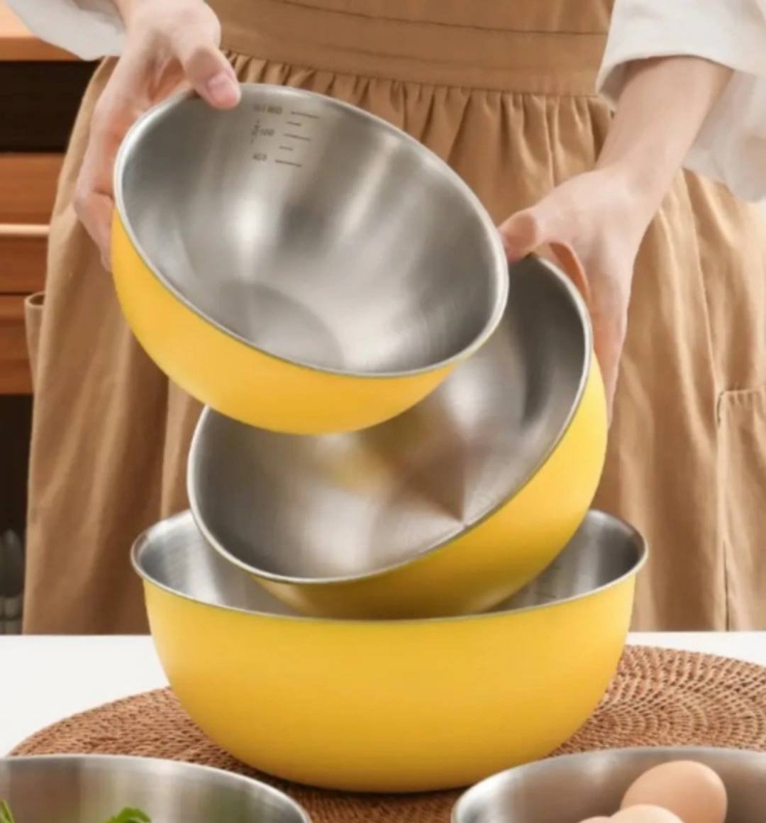 Brand new set of 3 stainless steel mixing bowls. Yellow exterior. Measurements marked inside. Various sizes.