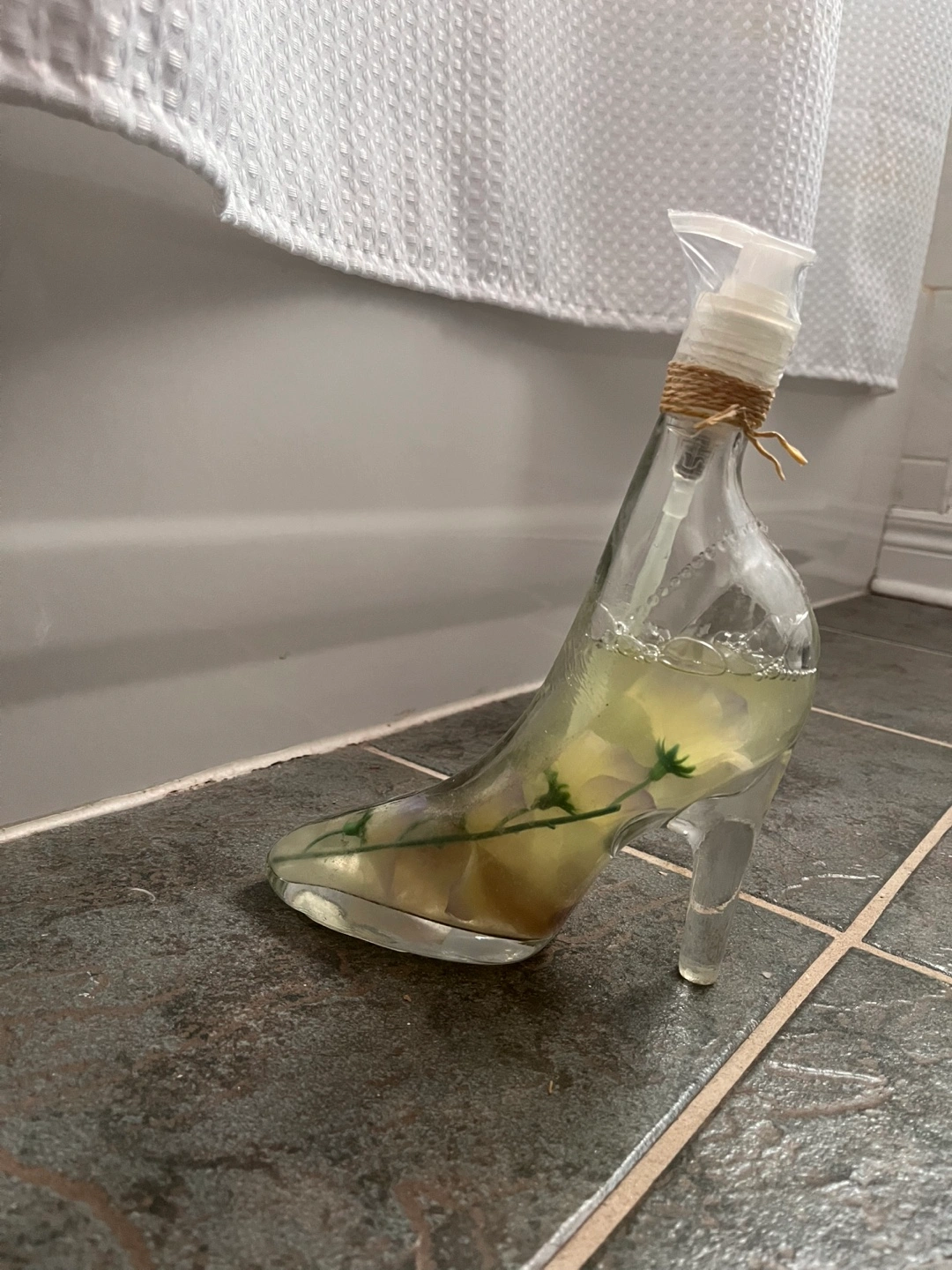 Glass high heel shaped soap dispenser. Clear glass with pump top. Contains liquid soap and decorative dried flowers.