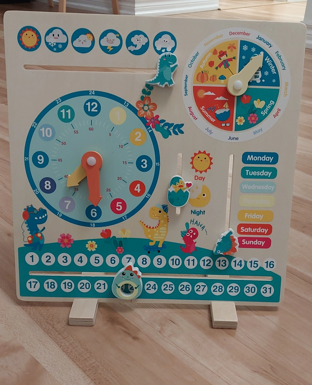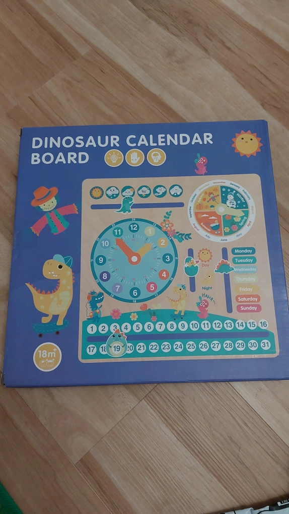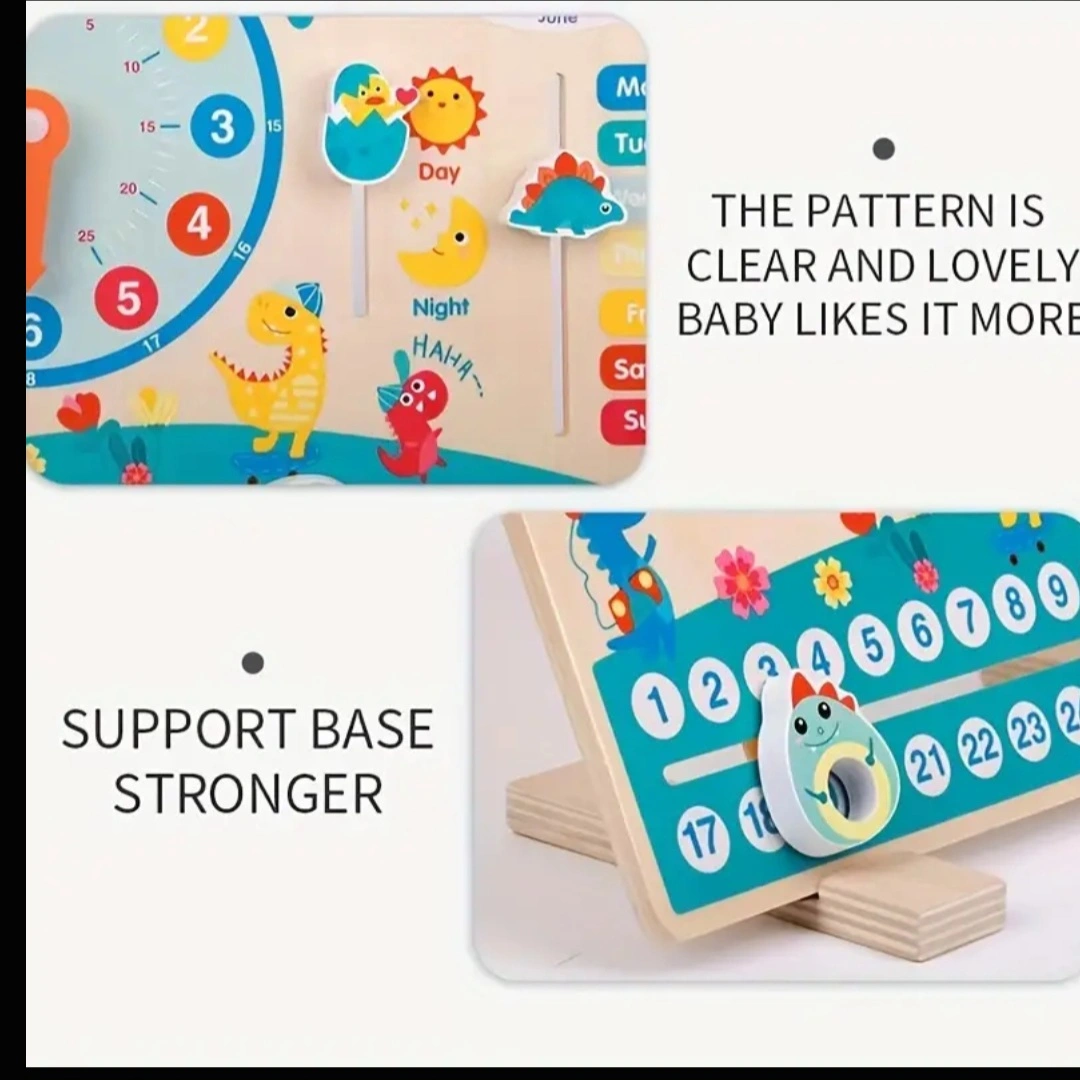 Adorable dinosaur-themed learning toy. Features a clock, calendar, days of the week, months, and seasons. Movable pieces. Great for teaching time and dates. Sturdy wooden construction. Perfect Gift 🎁