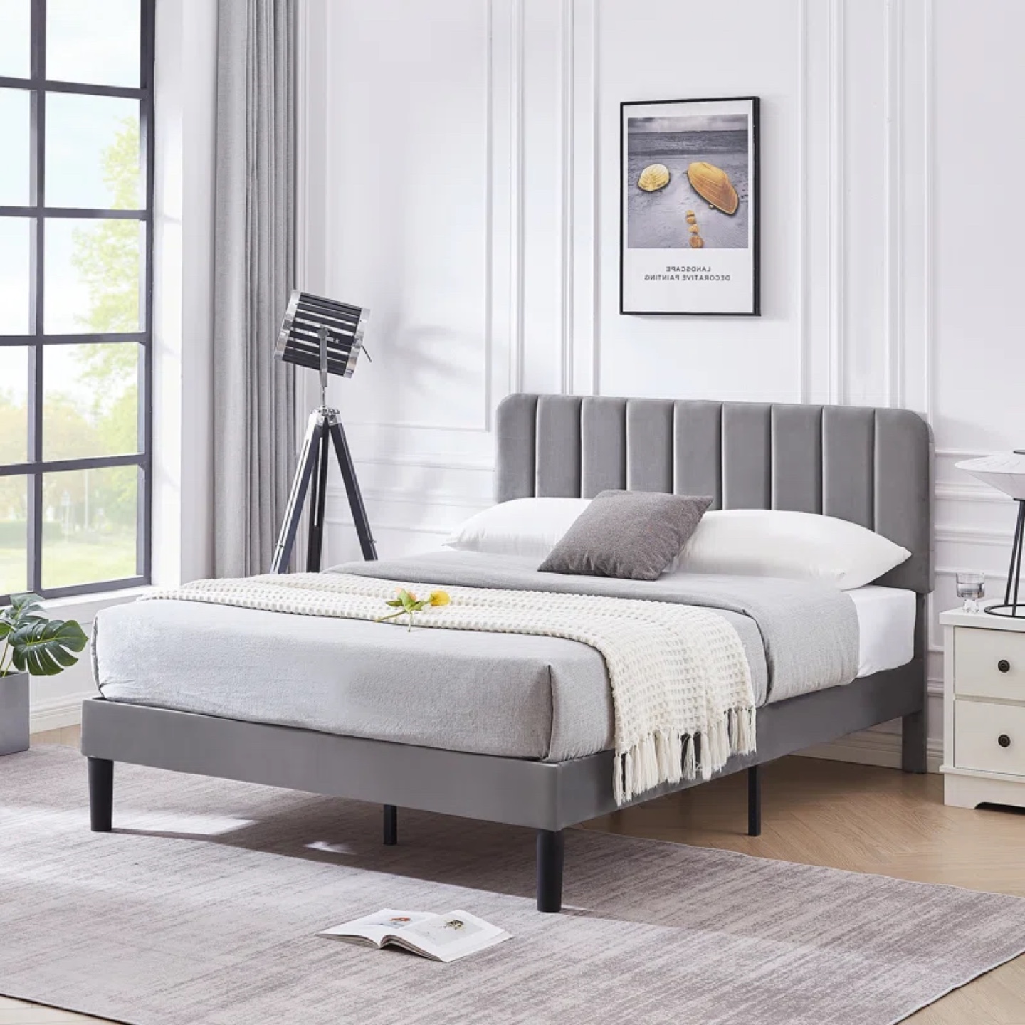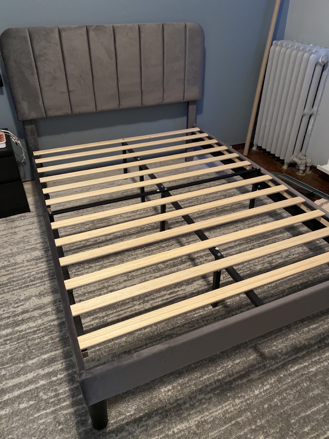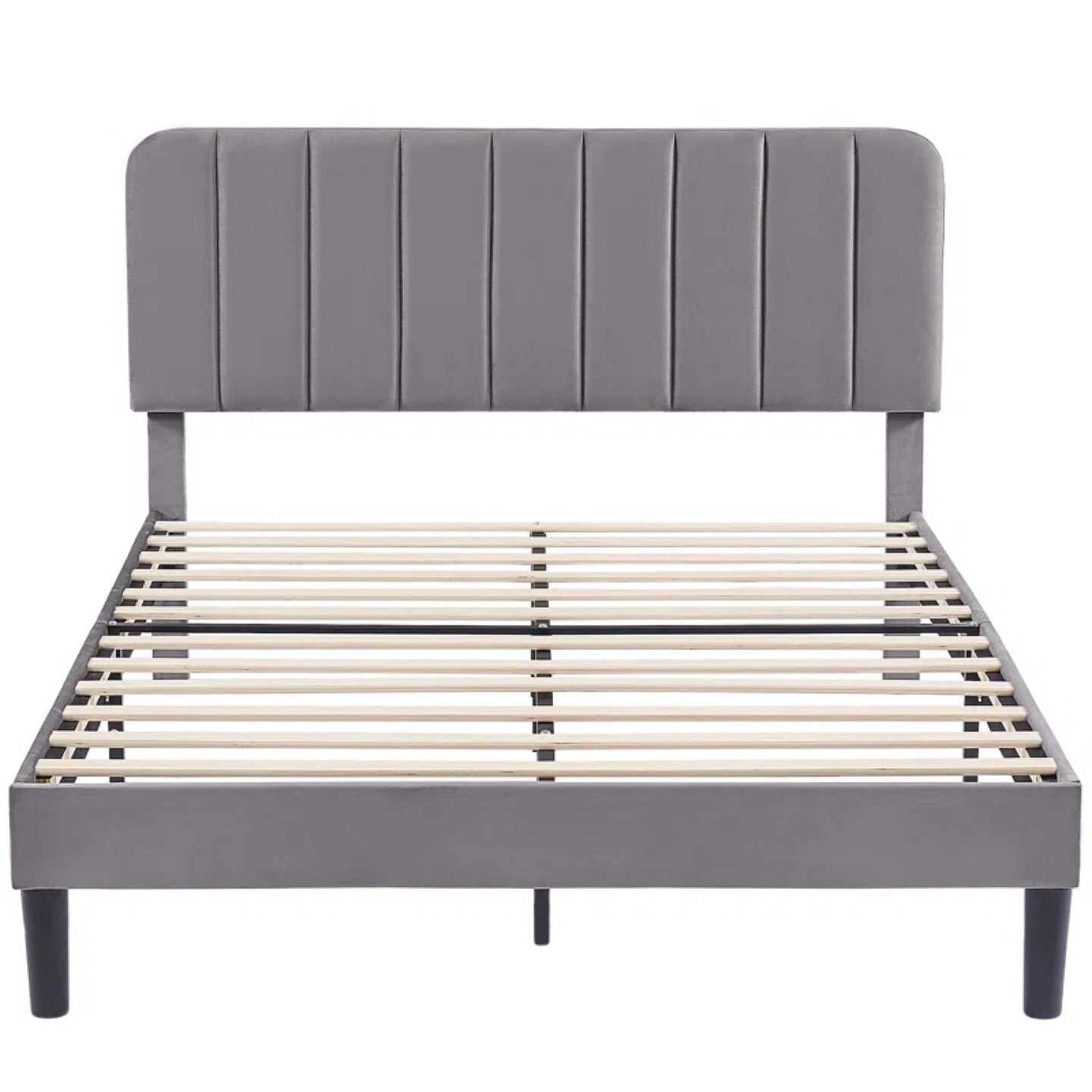 Grey upholstered bed frame.