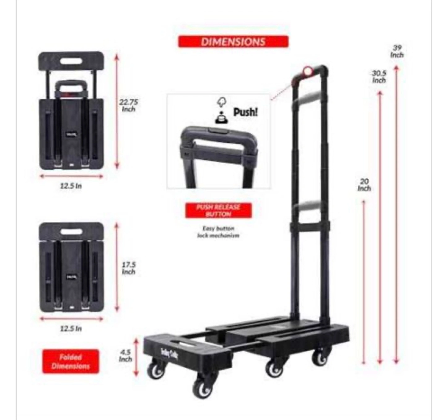 This lightweight and portable dolly features a three-step telescoping handle for easy manoeuvrability, and an expandable toe plate for added space to place bulky objects. It's also built to last, comes with two high-tension bungee cords to help secure your items, and also folds in half for compact storage. • Capacity: up to 500 lbs • Composition: 100% virgin polypropylene