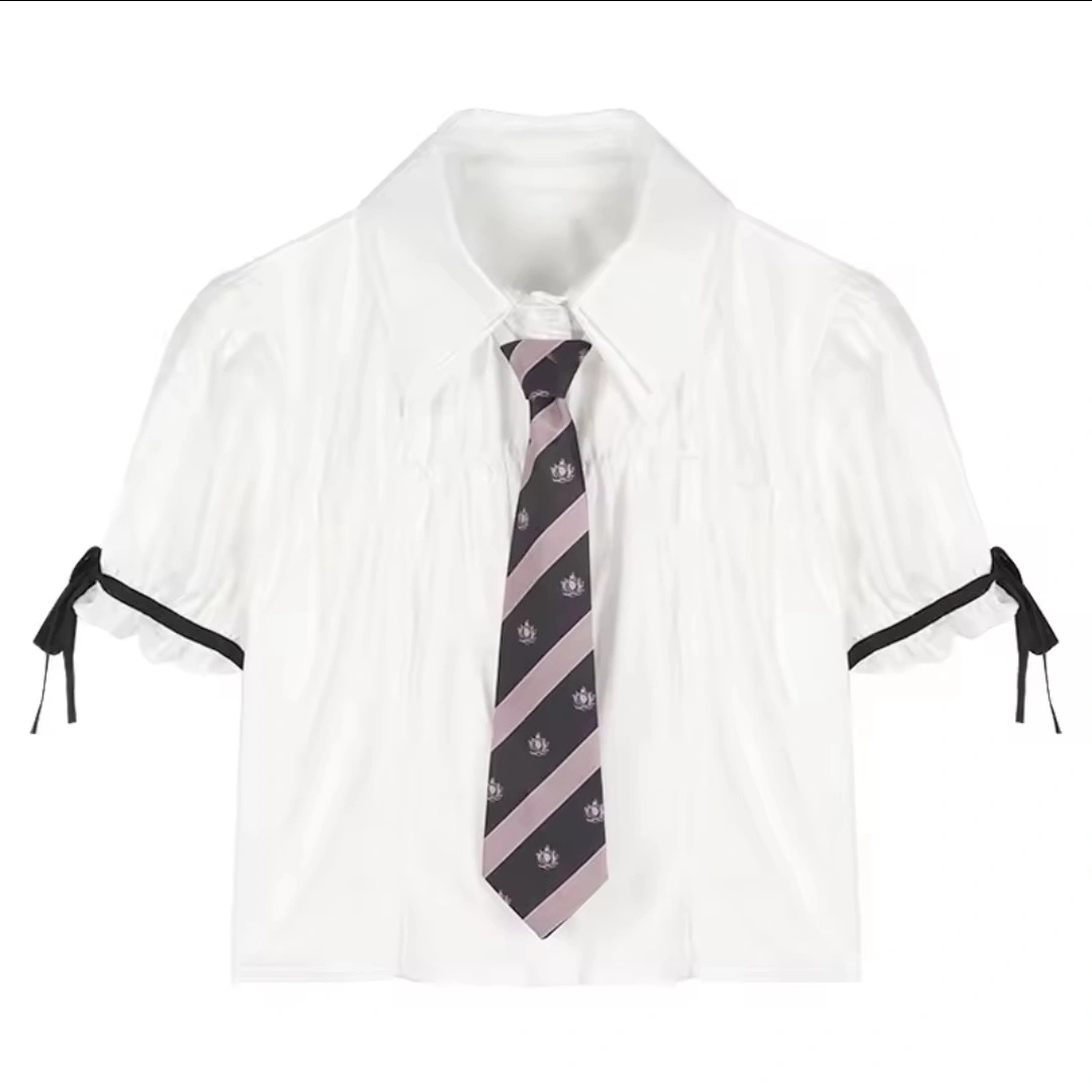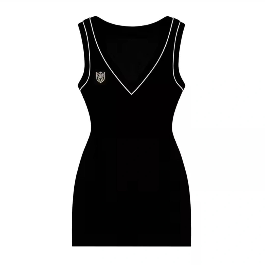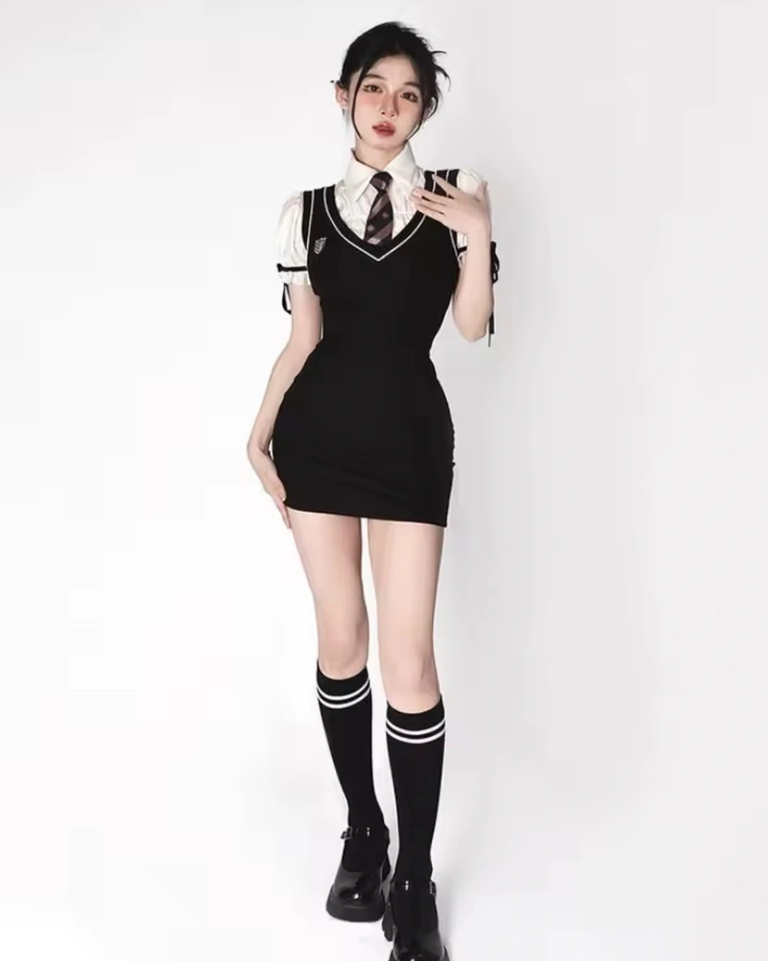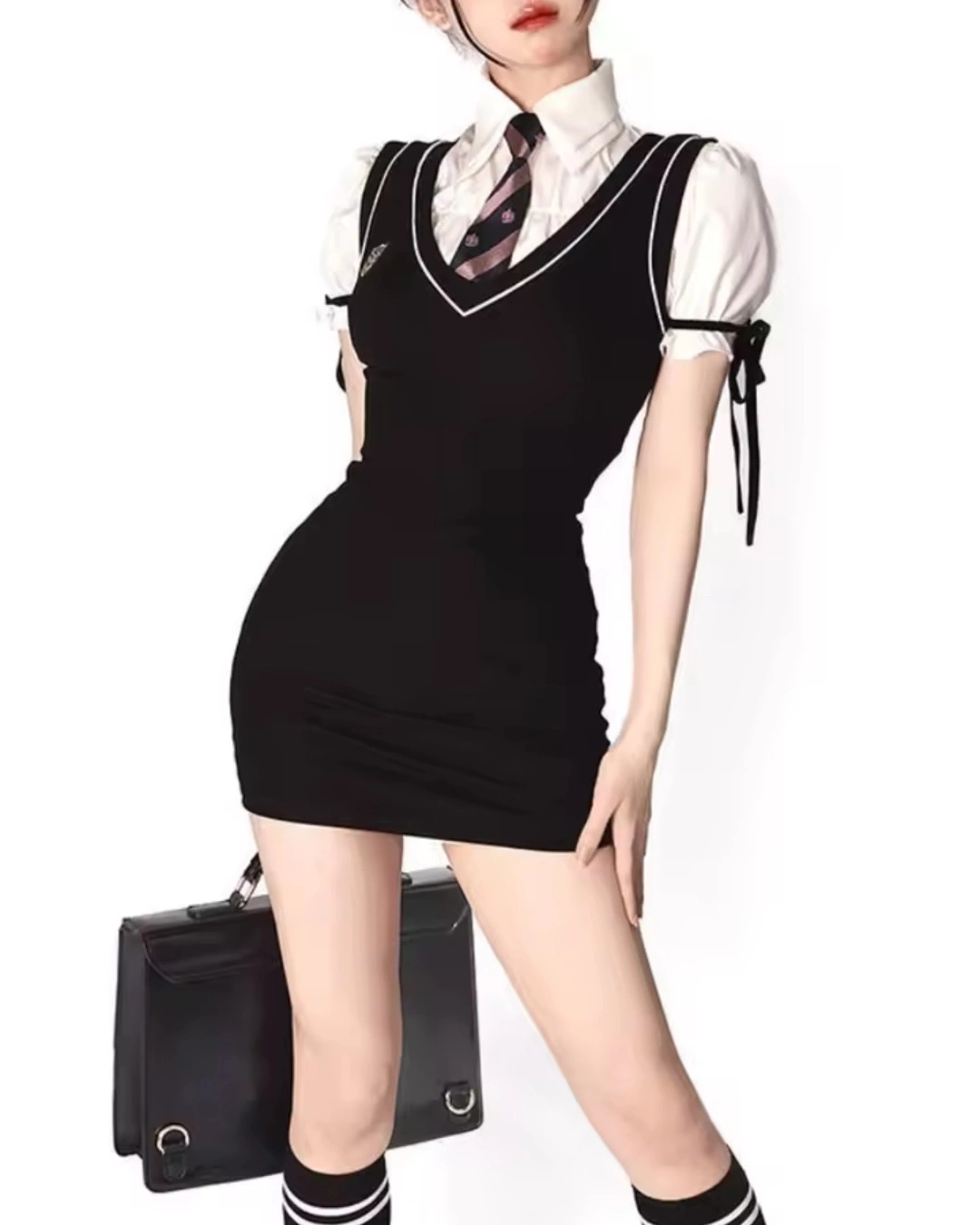 106Stylish black mini dress, V-neck design. Features white trim. Paired with a white short-sleeved blouse and matching striped tie. Form-fitting silhouette. Great for a schoolgirl aesthetic.