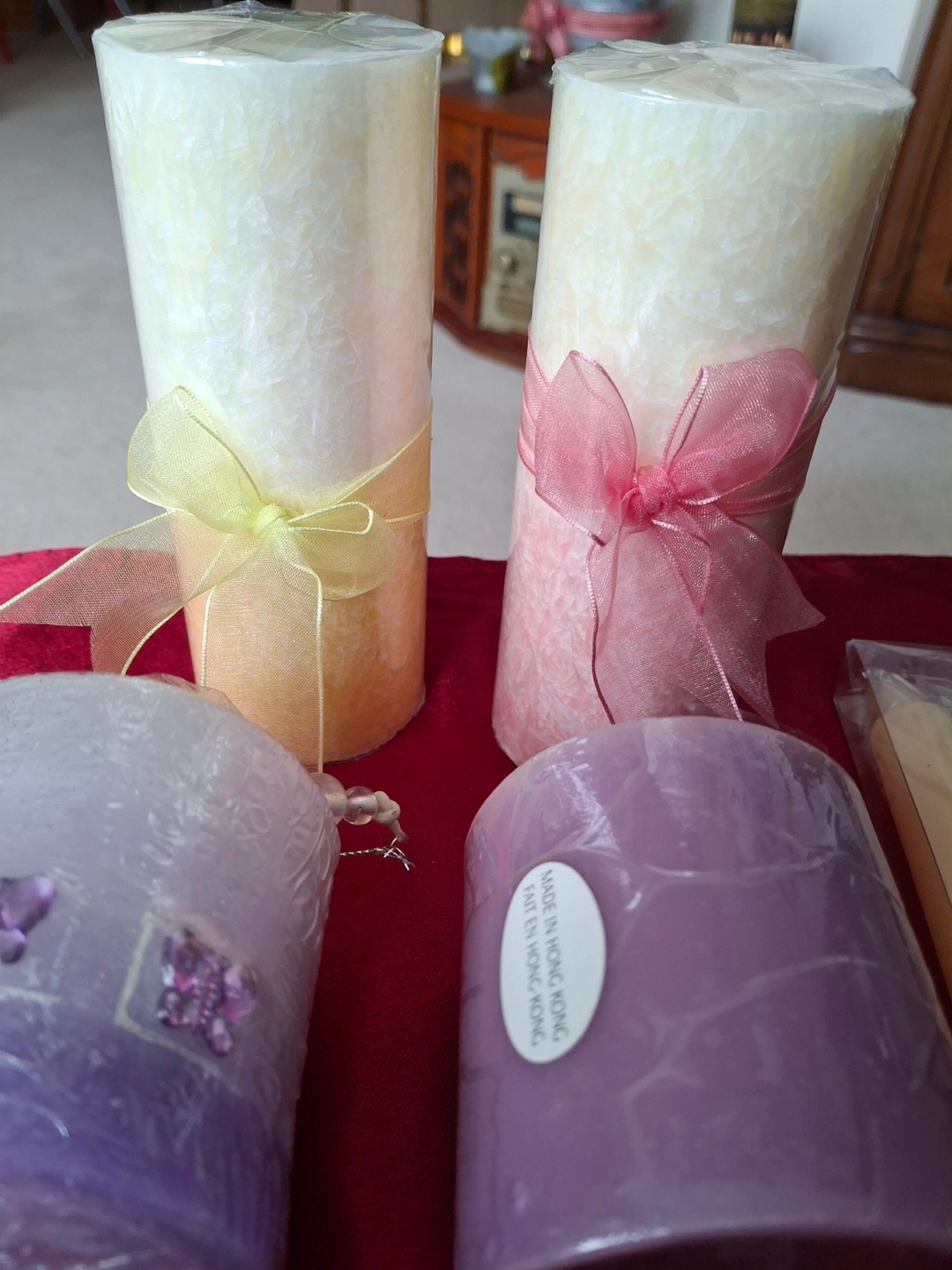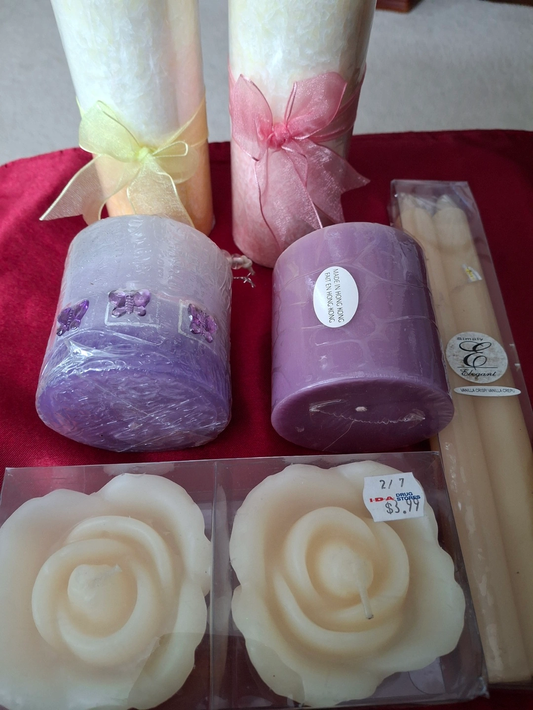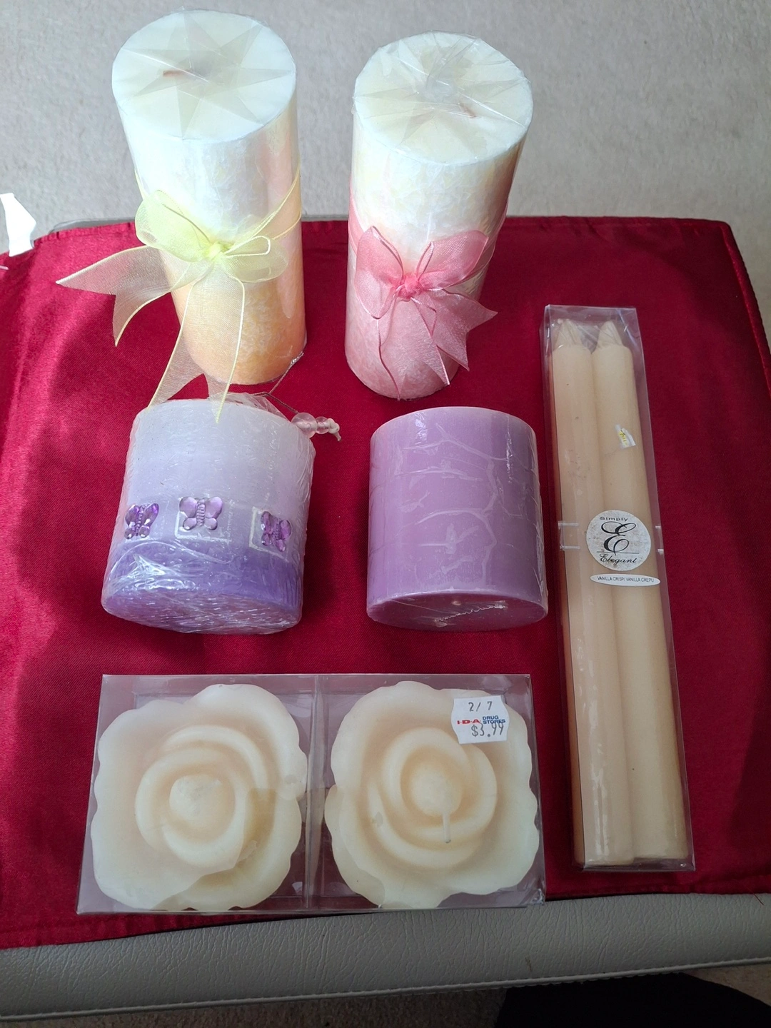 1000+Bundle of a variety of candles, all still in packaging. Includes new package of vanilla scented tapers, floating flowers, and more (unscented). Tallest is 6” and smallest is 3”. Price is for everything. Available for pickup in Markland Wood.