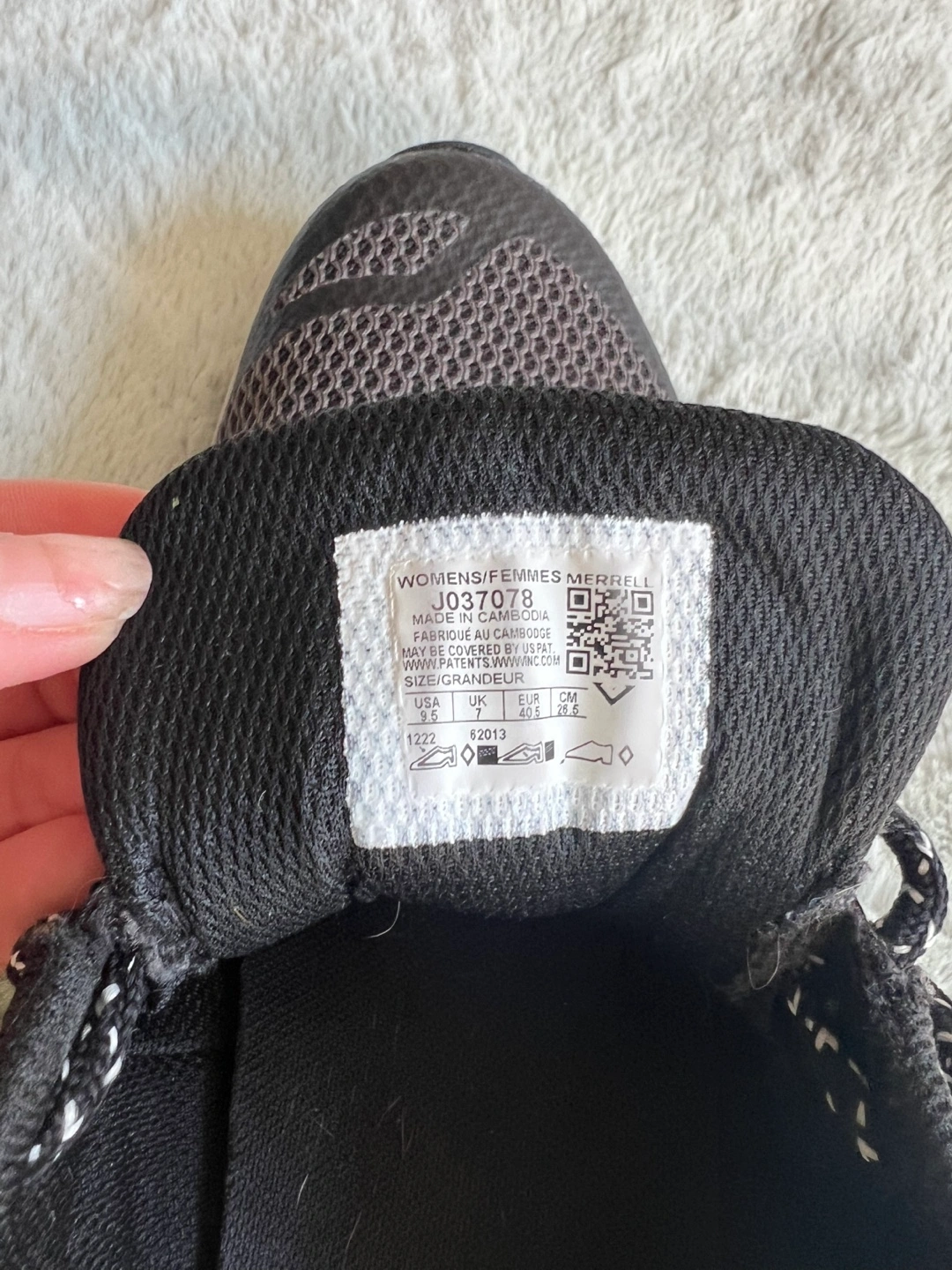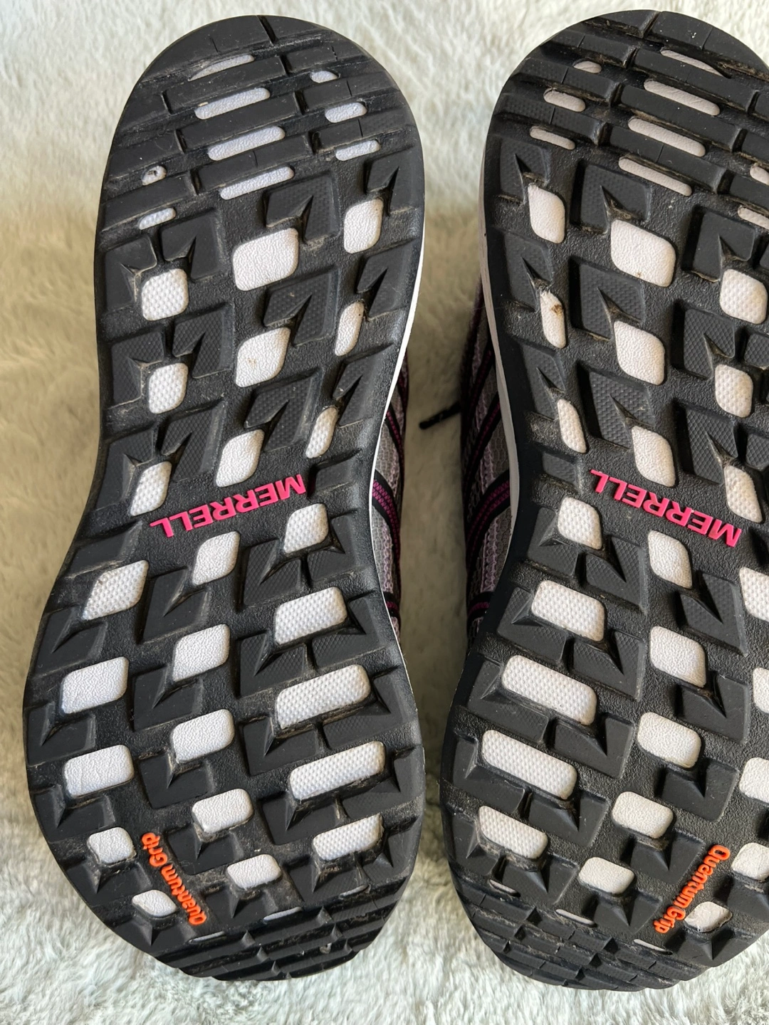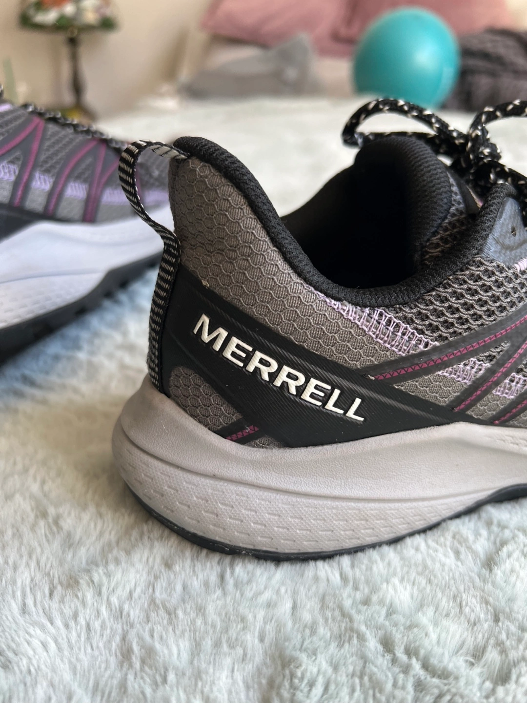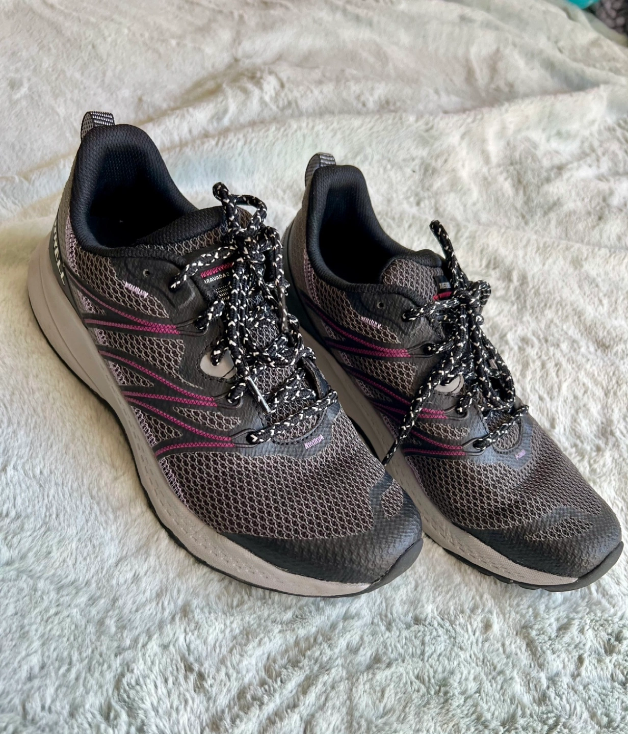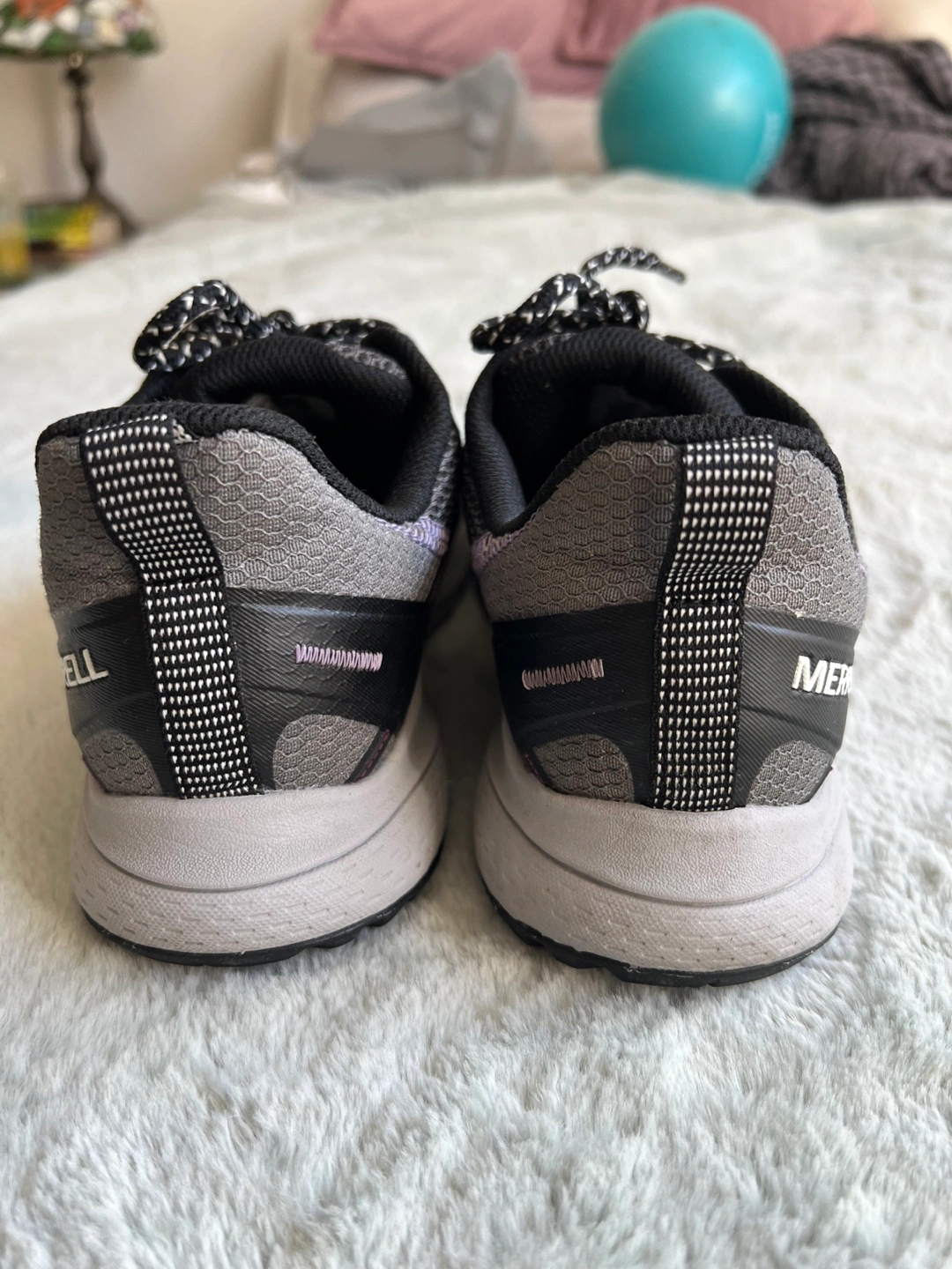 Gray and black mesh running shoes. Purple accents. Lace-up closure. Lightweight and comfortable. Great for trail running or everyday wear.