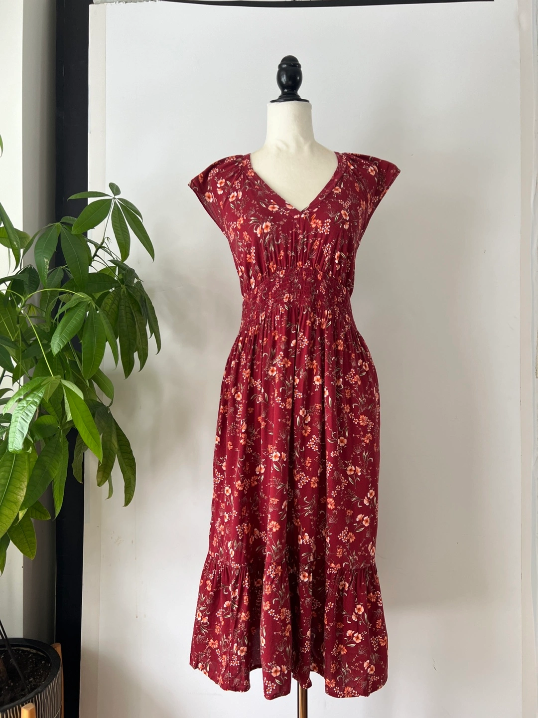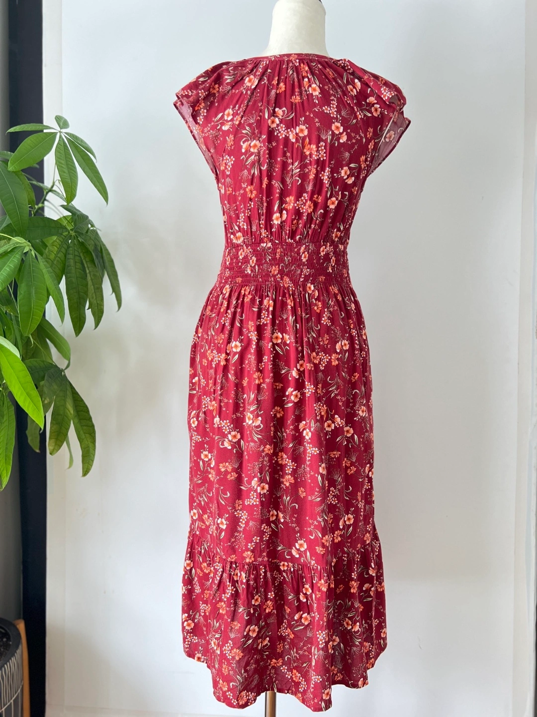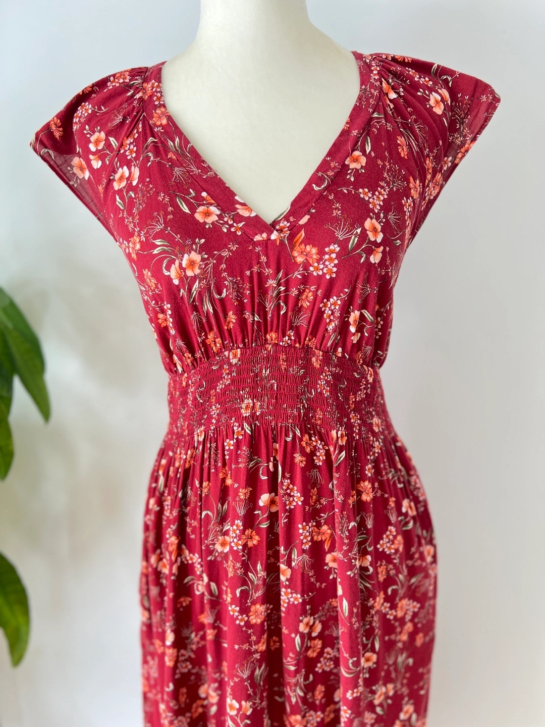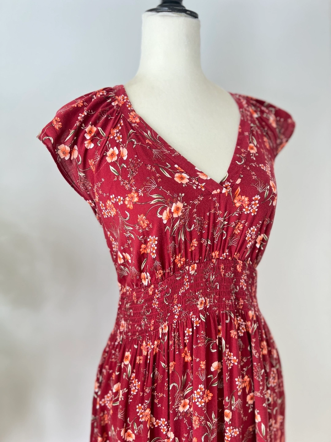 Pretty burgundy floral long dress. Features a V-neck, short sleeves, smocked waist, and tiered skirt. Perfect for any occasion.