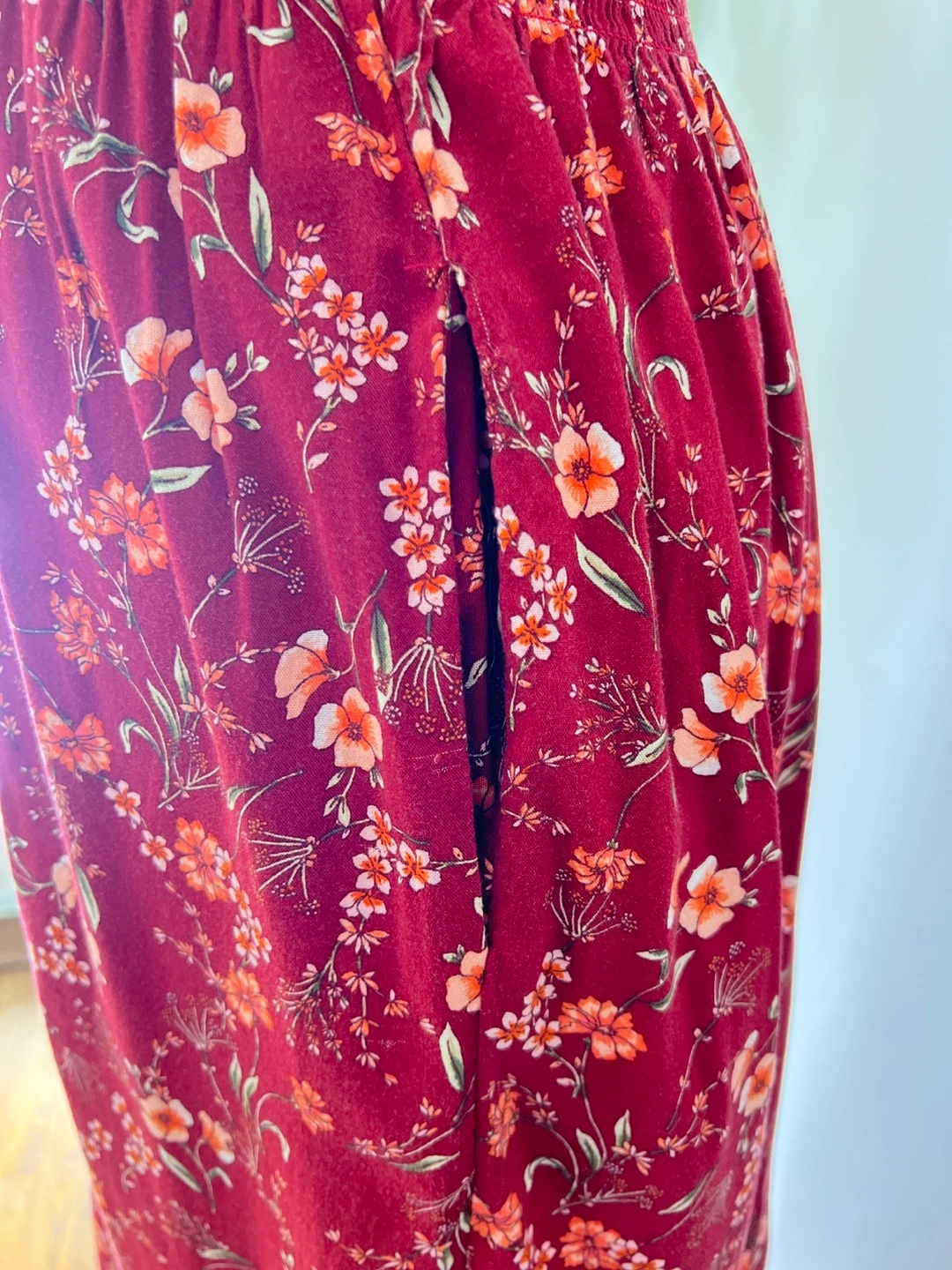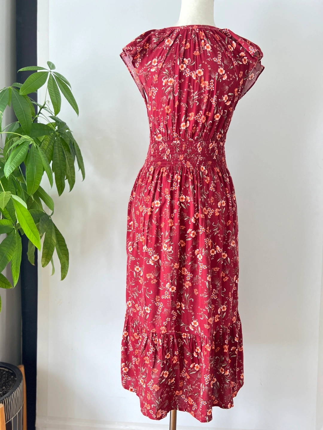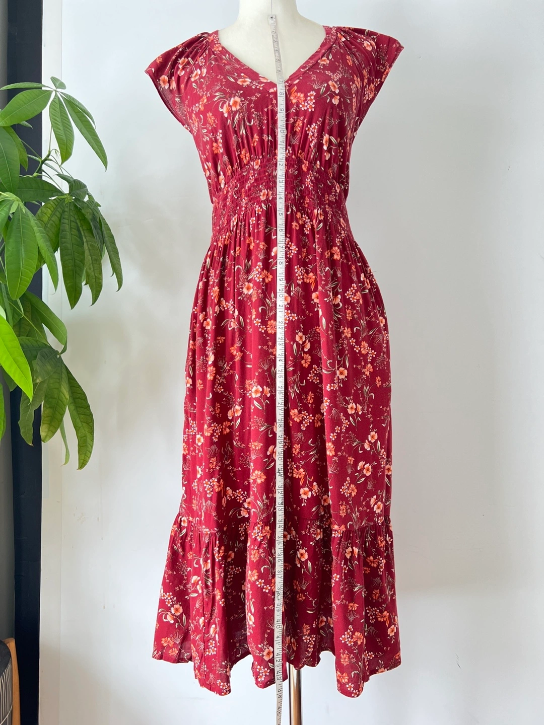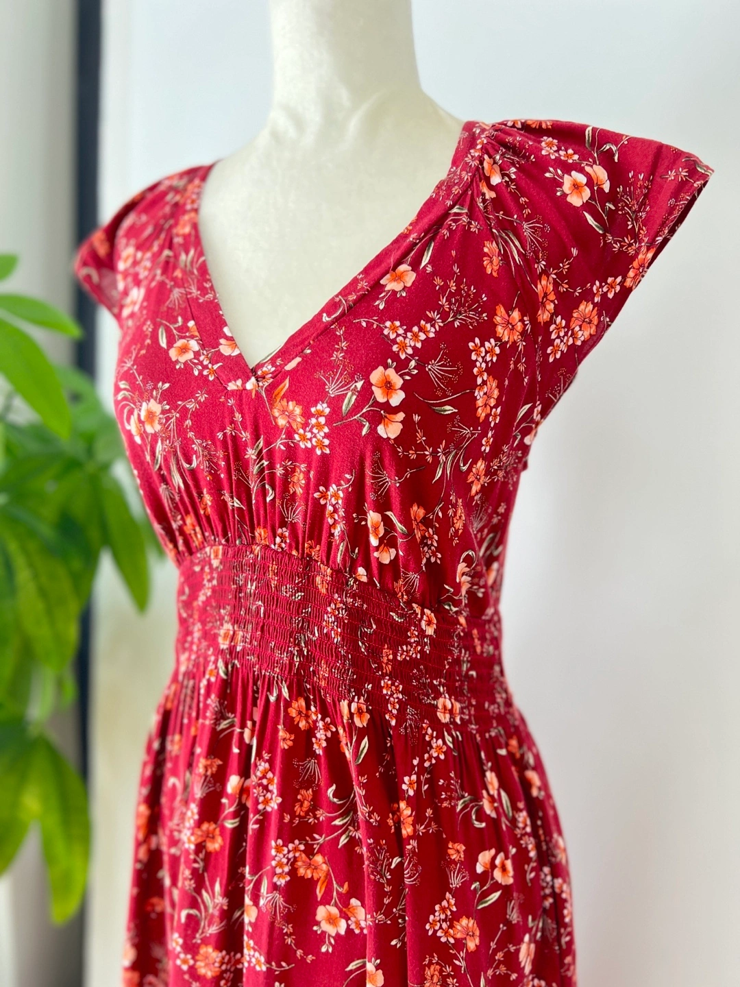 Pretty burgundy floral long dress. Features a V-neck, short sleeves, smocked waist, and tiered skirt. Perfect for any occasion.