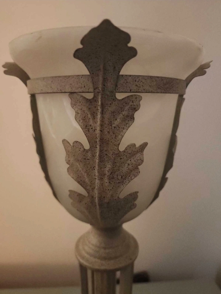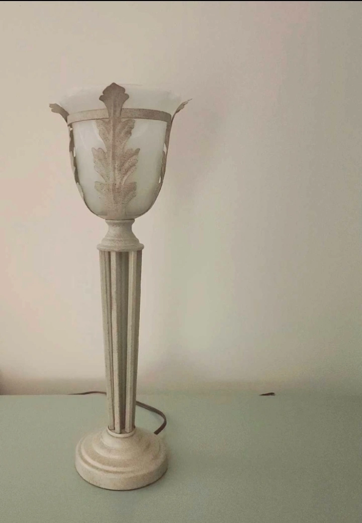 Beautiful table lamp. Features a frosted glass shade and ornate metal base. Neutral colour palette. Adds a touch of sophistication to any room. Excellent condition.