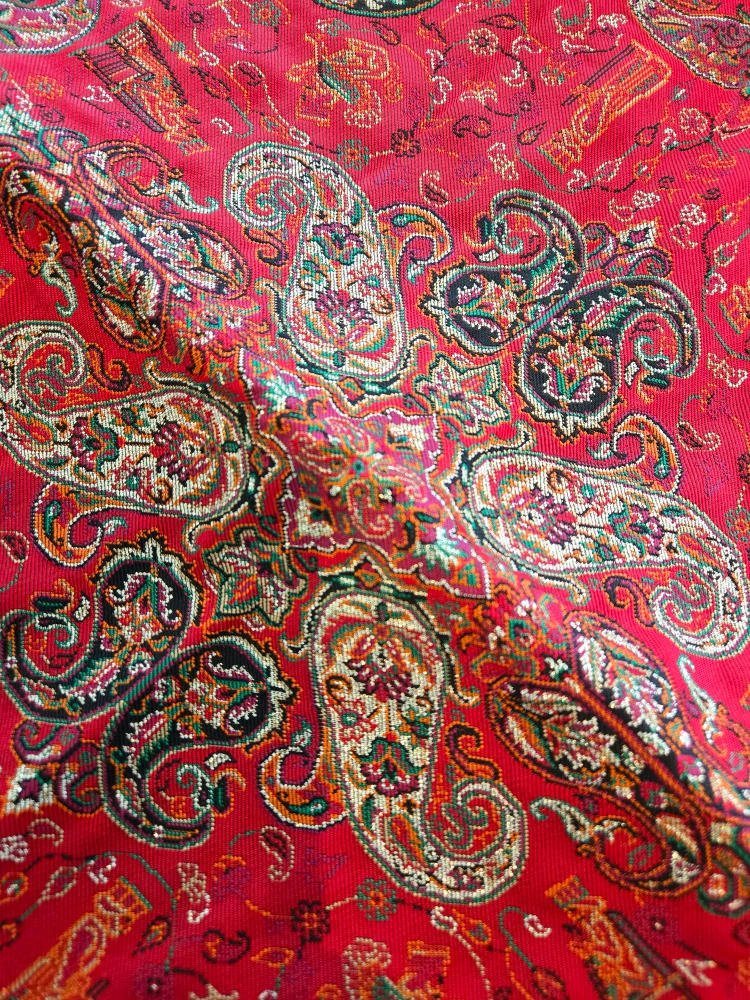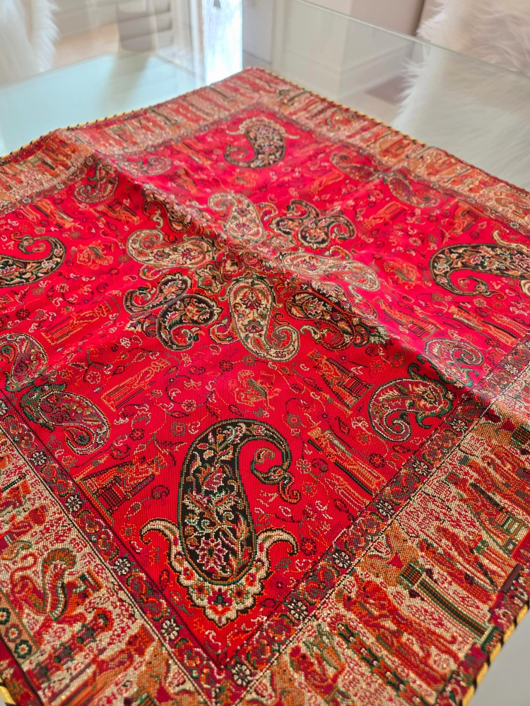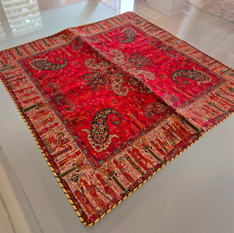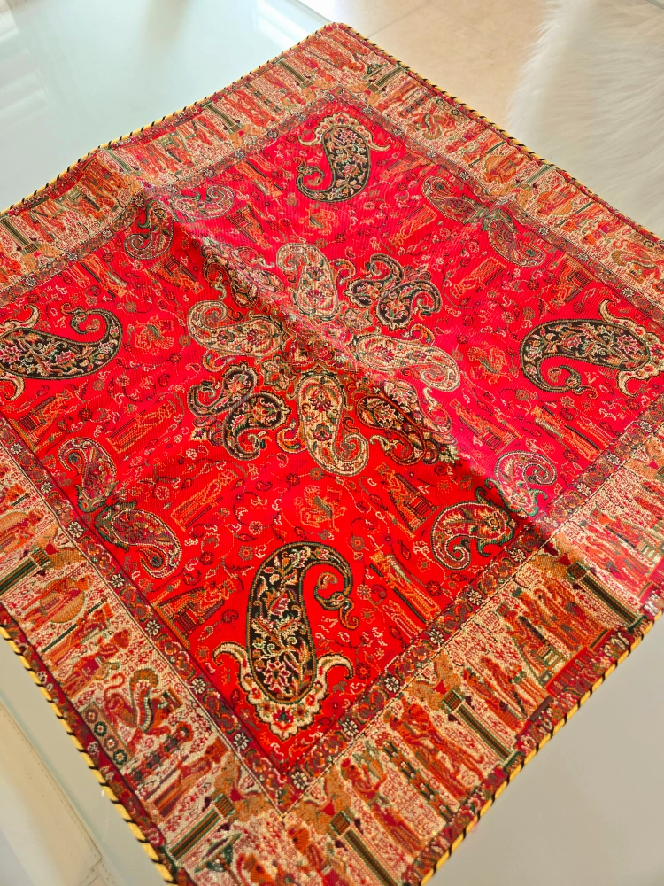 Square table runner. Red background with paisley pattern. Features a detailed border. Looks great on a table.