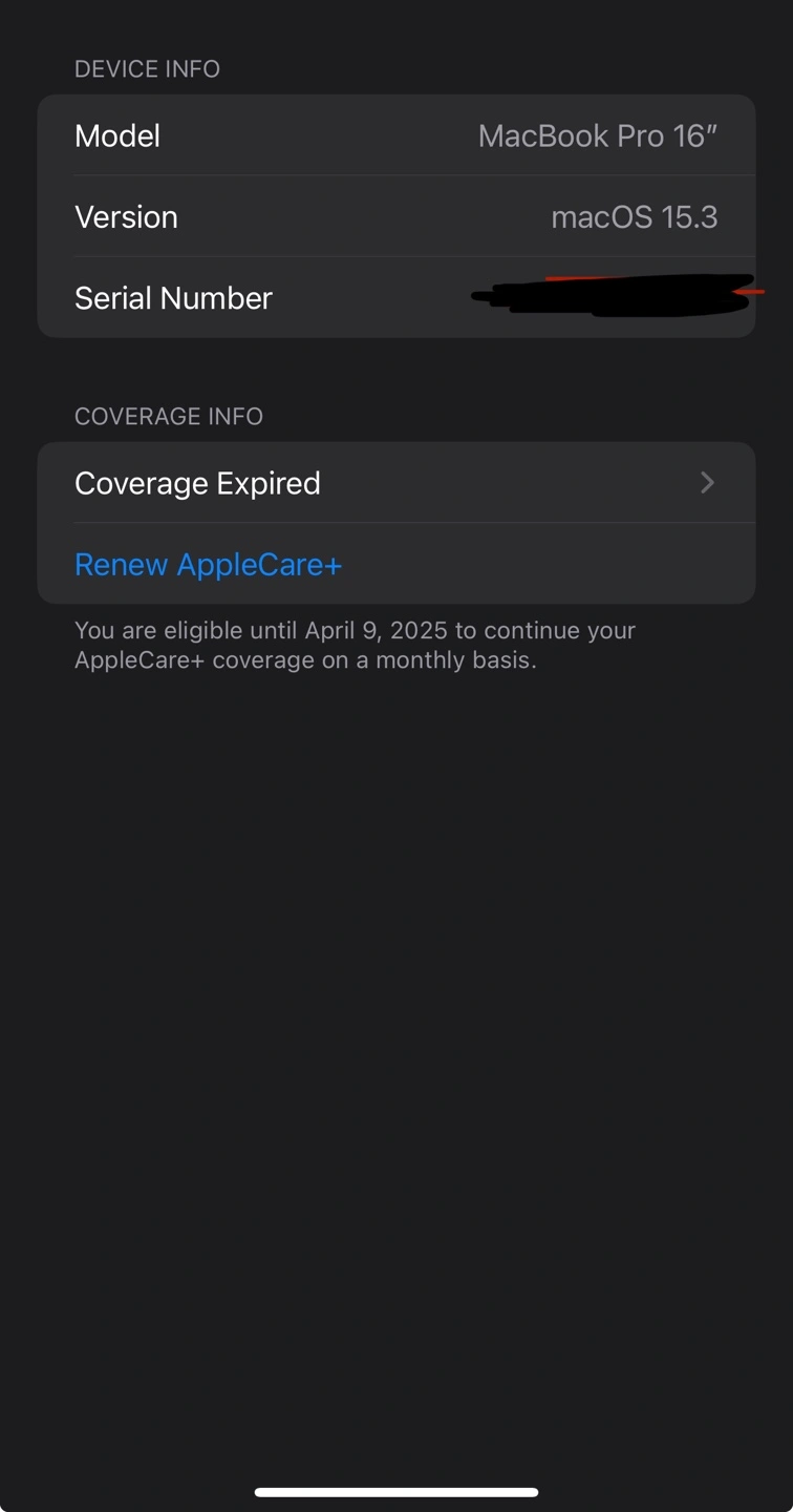 AppleCare+ coverage expired but eligible for renewal until April 9, 2025.