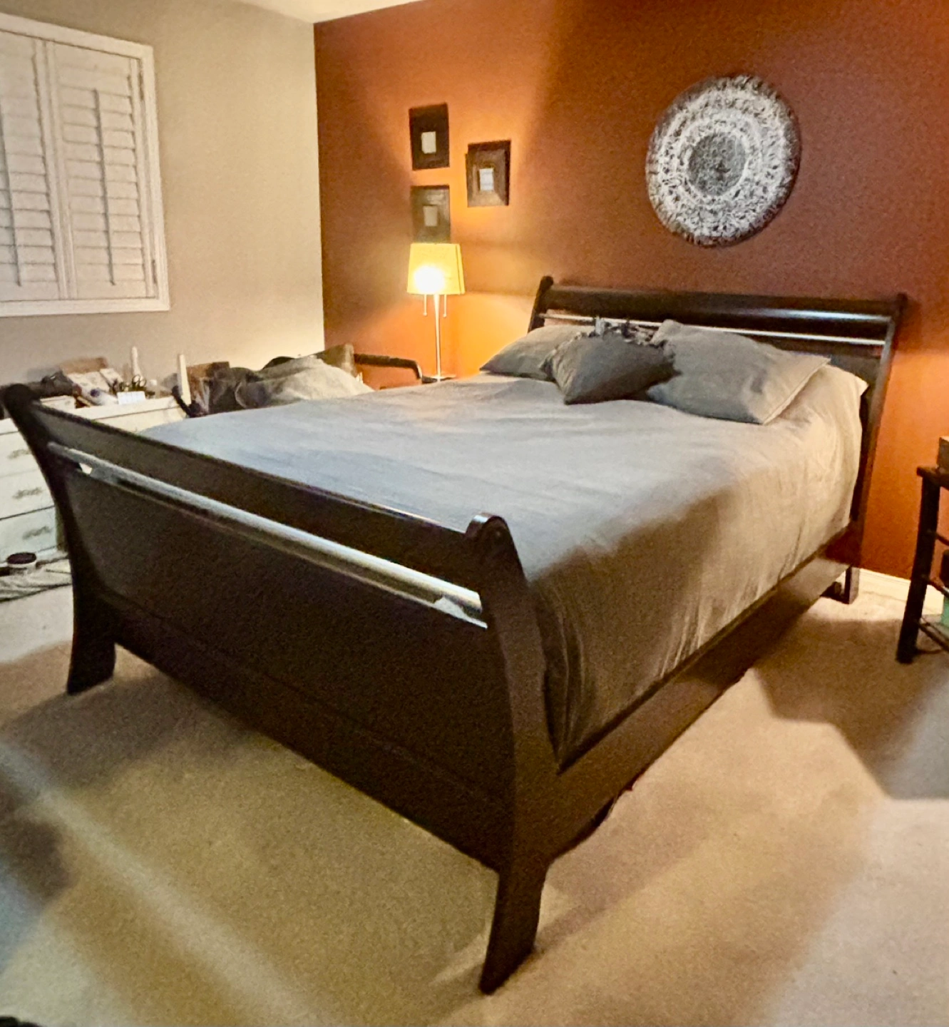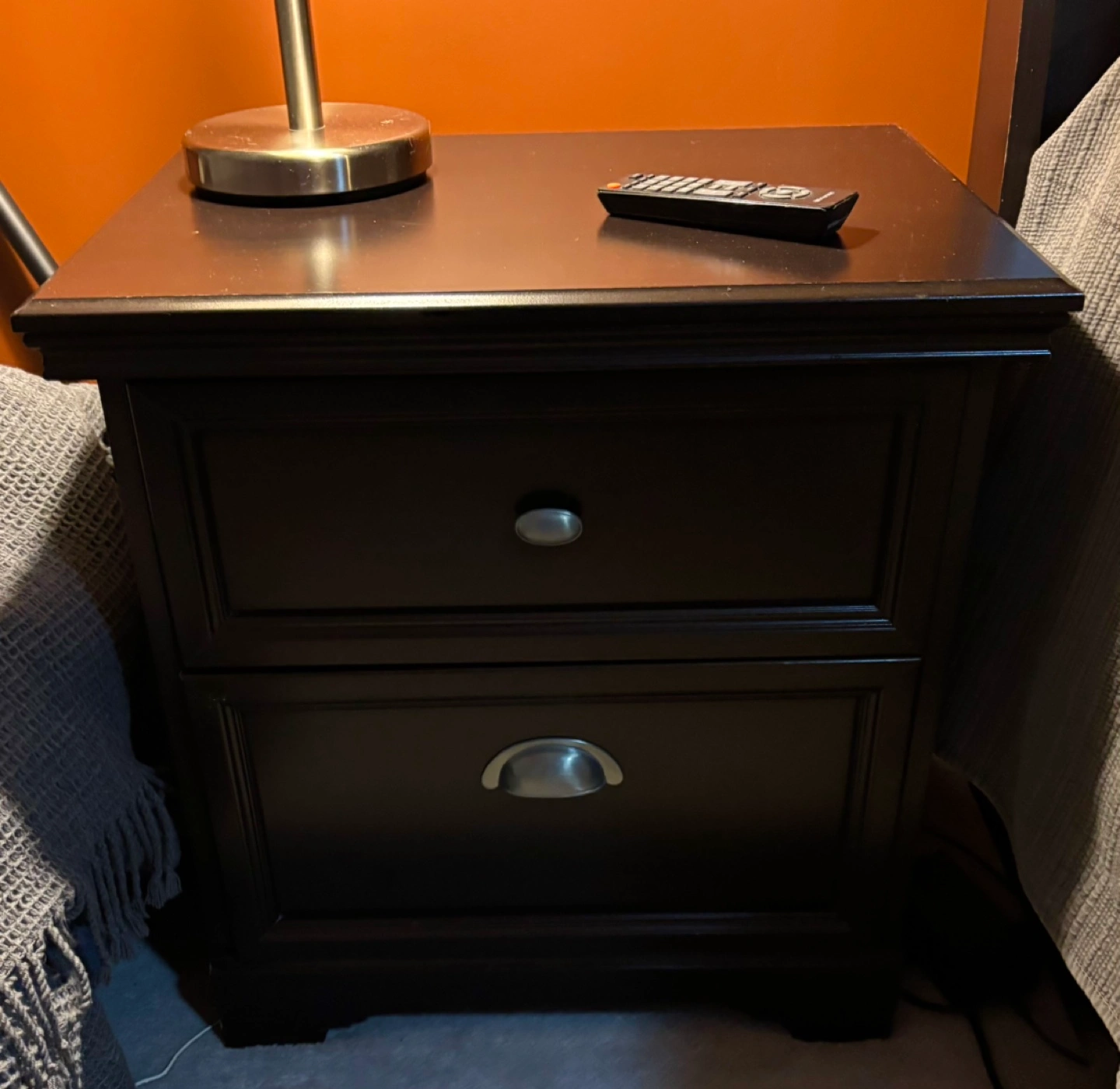 Dark brown sleigh bed, includes headboard and footboard. Matching nightstand with two drawers. Both in good condition. Selling as a set. Make an offer. Quick pick up preferred, Better price for quick pickup.