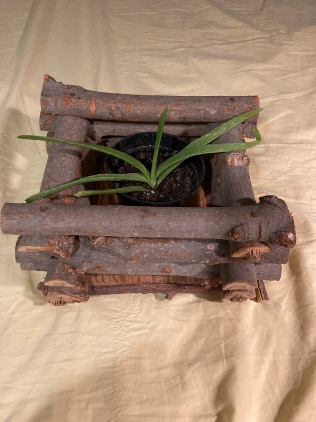 Charming square planter crafted from natural wood logs. Small aloe vera plant included if you would like. Take both for $4 3 x 6 x 6 cm