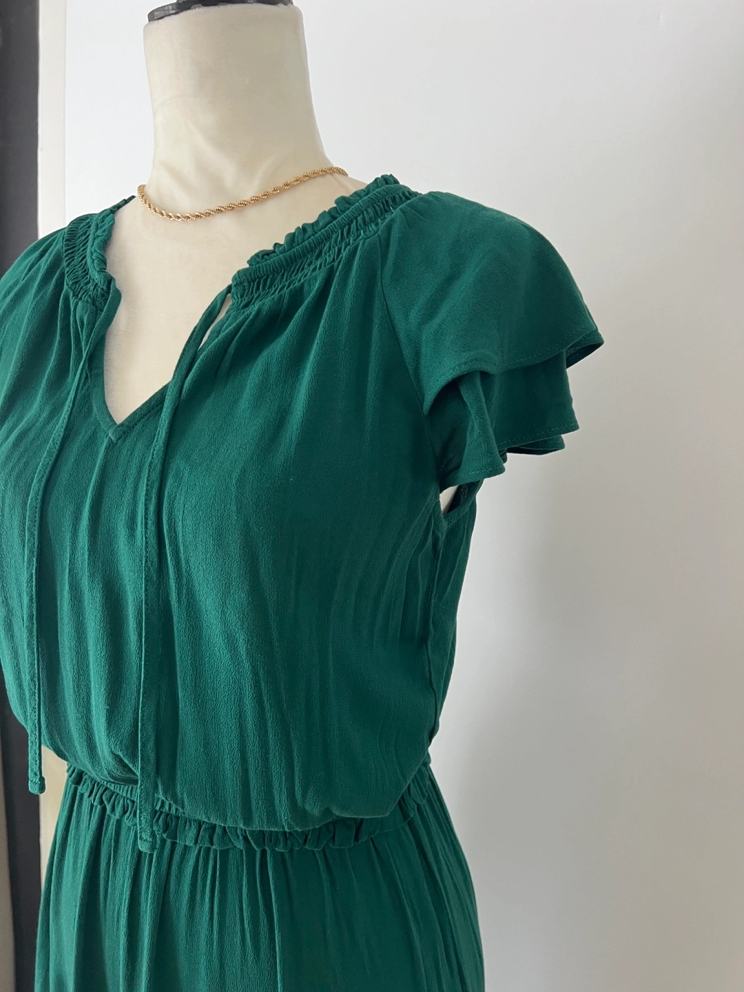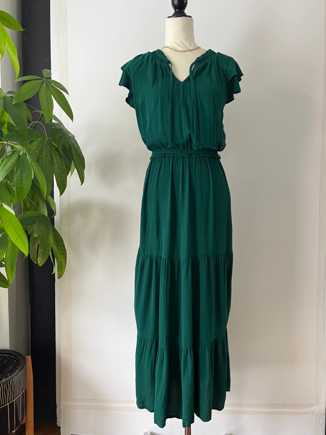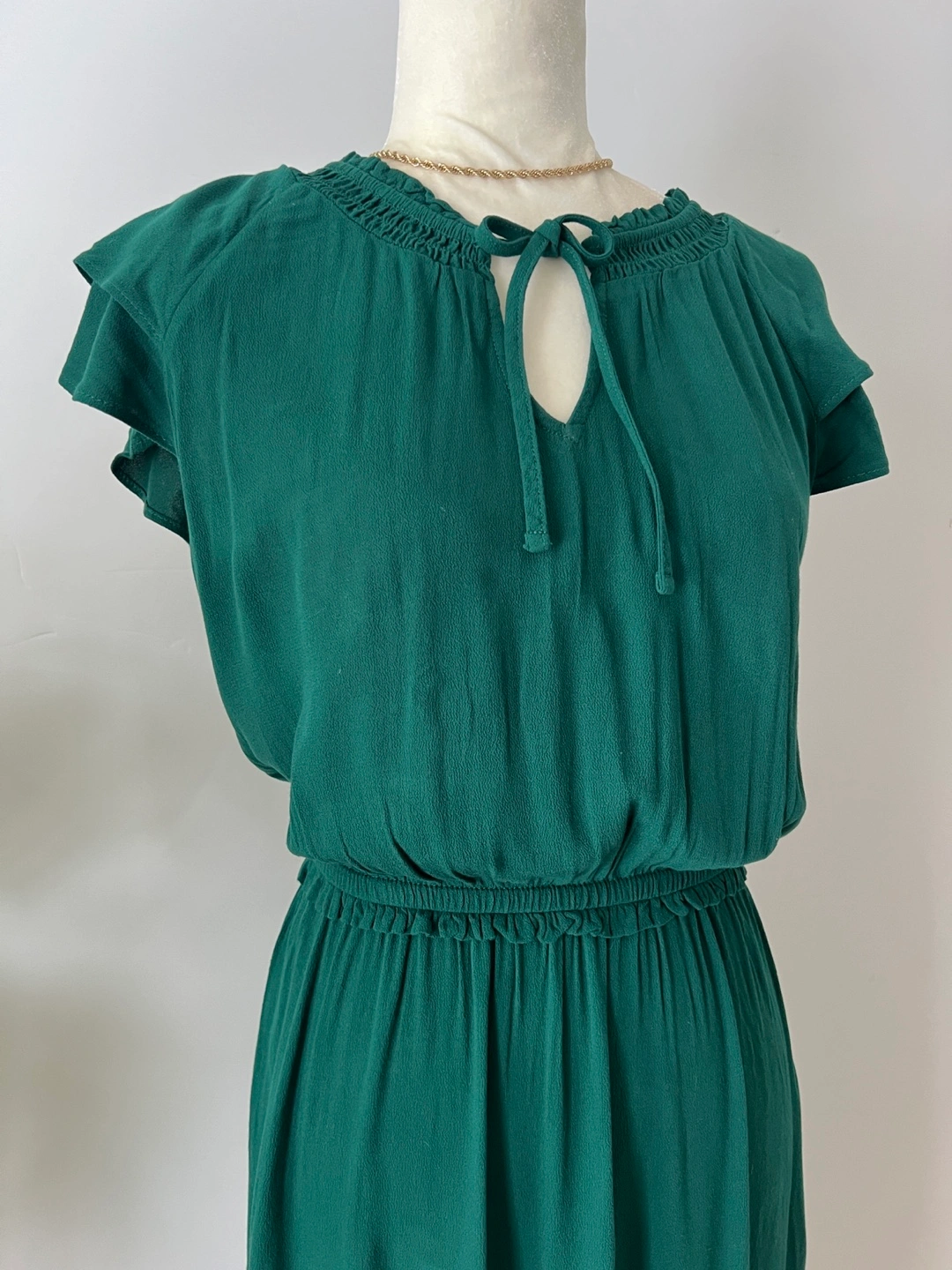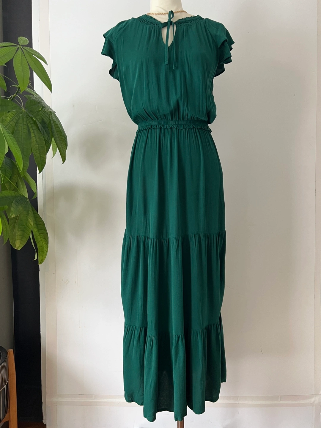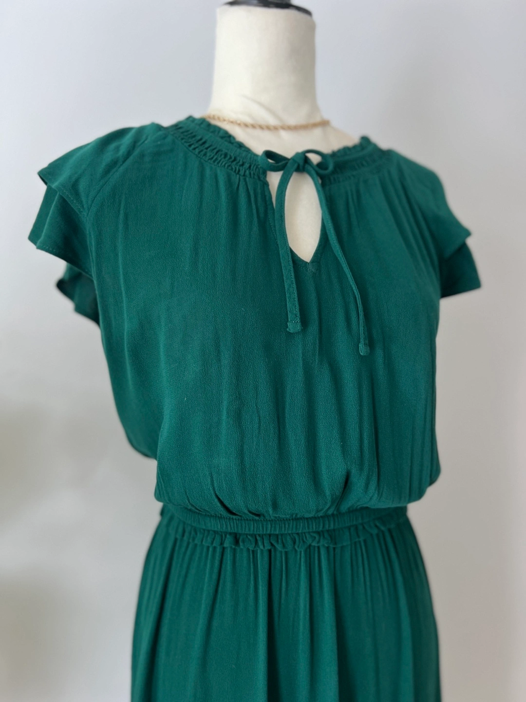 Beautiful dark green midi dress. Features short flutter sleeves, a keyhole neckline with a tie, and a tiered skirt. Elastic waistband. Perfect for any occasion.