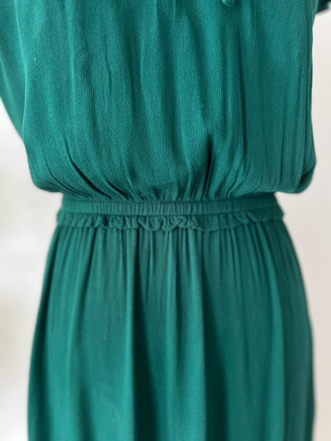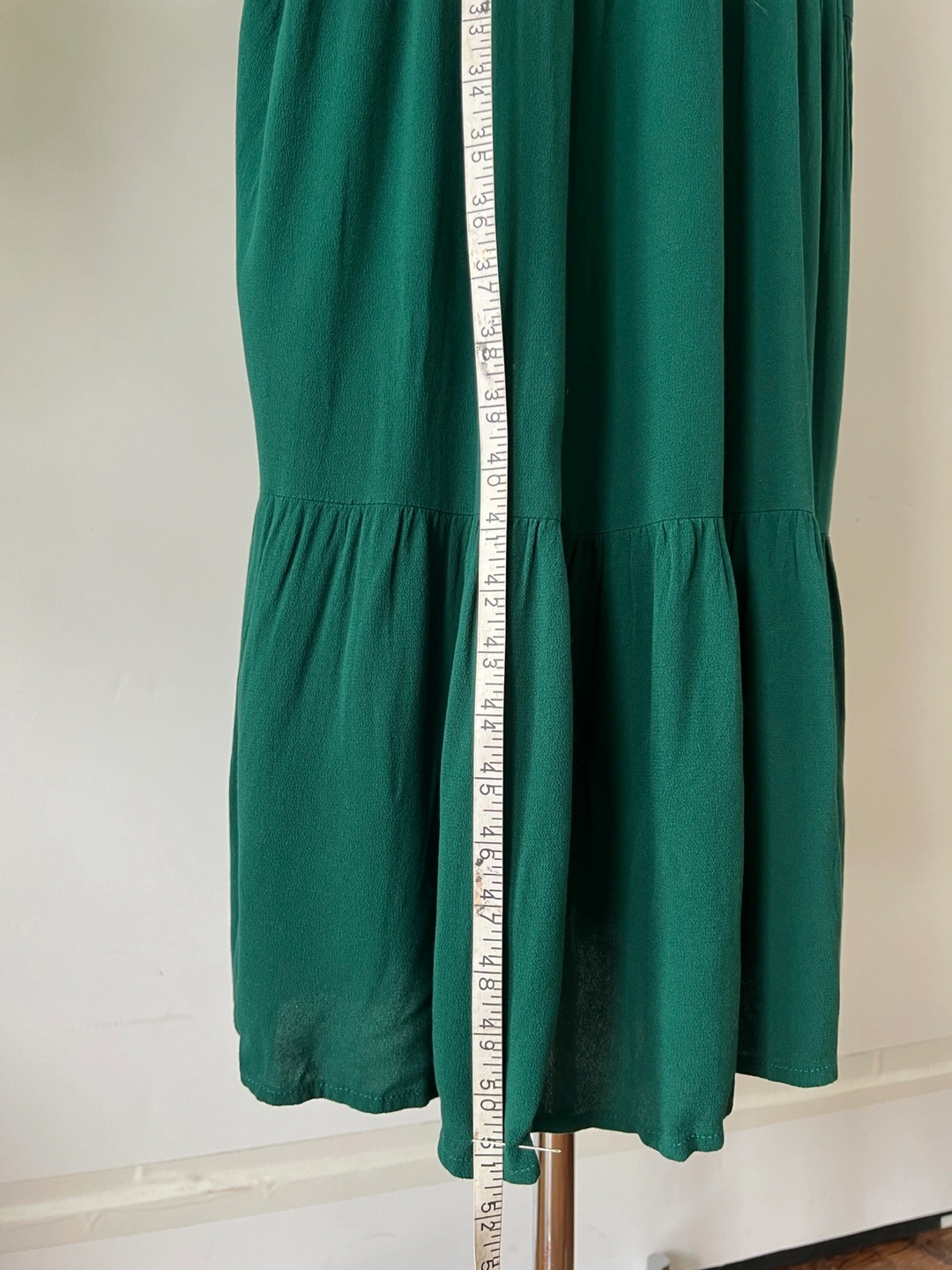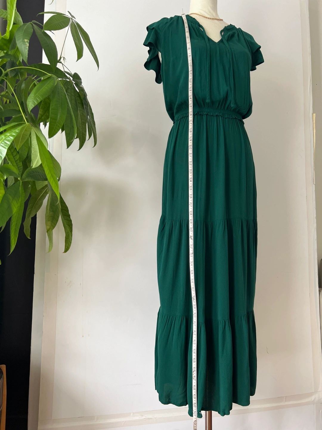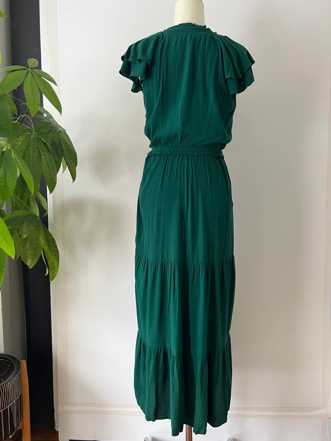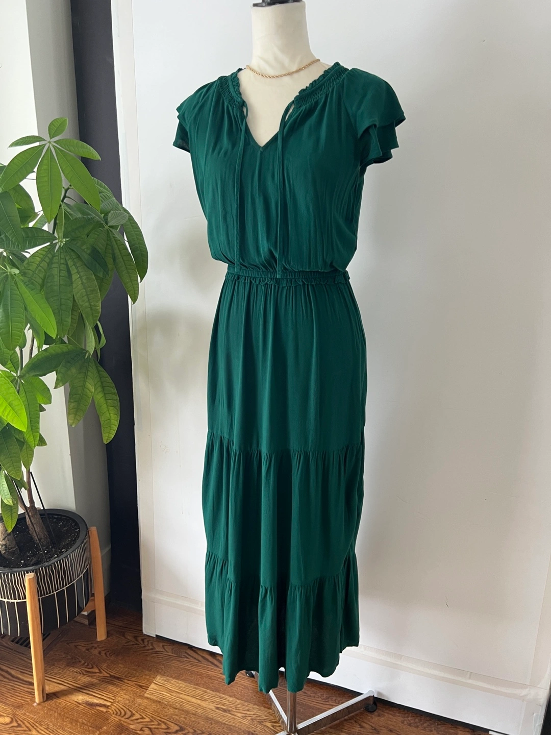 Beautiful dark green midi dress. Features short flutter sleeves, a keyhole neckline with a tie, and a tiered skirt. Elastic waistband. Perfect for any occasion.