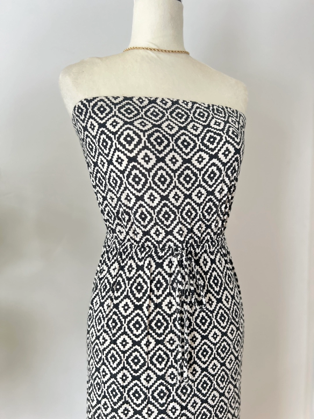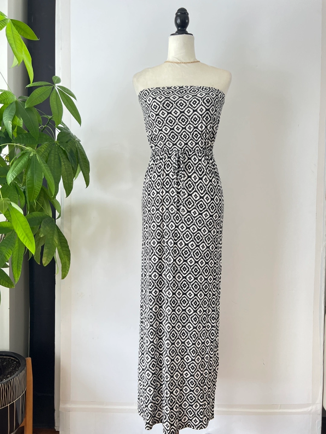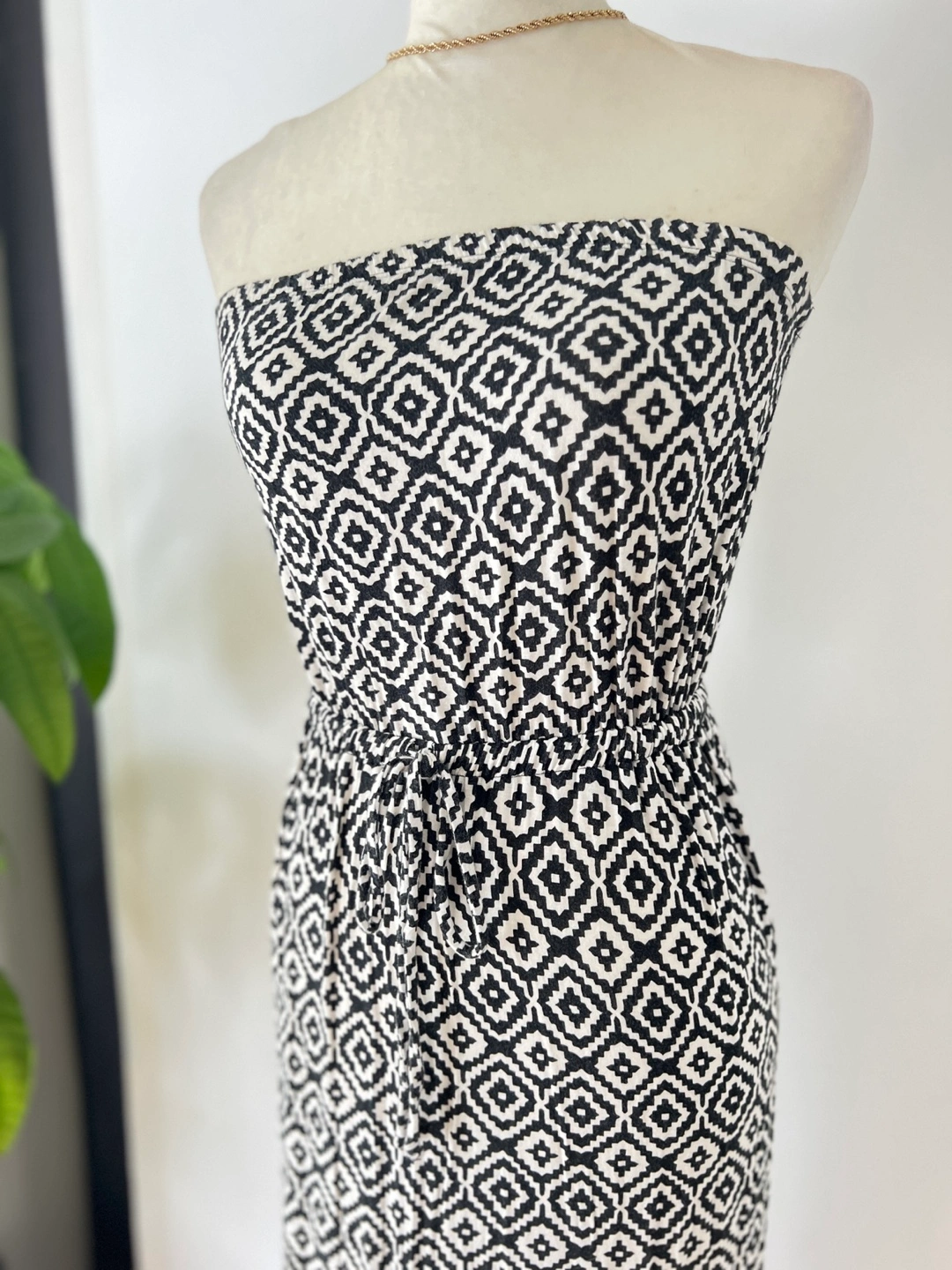 Flowy strapless maxi dress. Black and white geometric print. Elastic waistband. Perfect for summer.