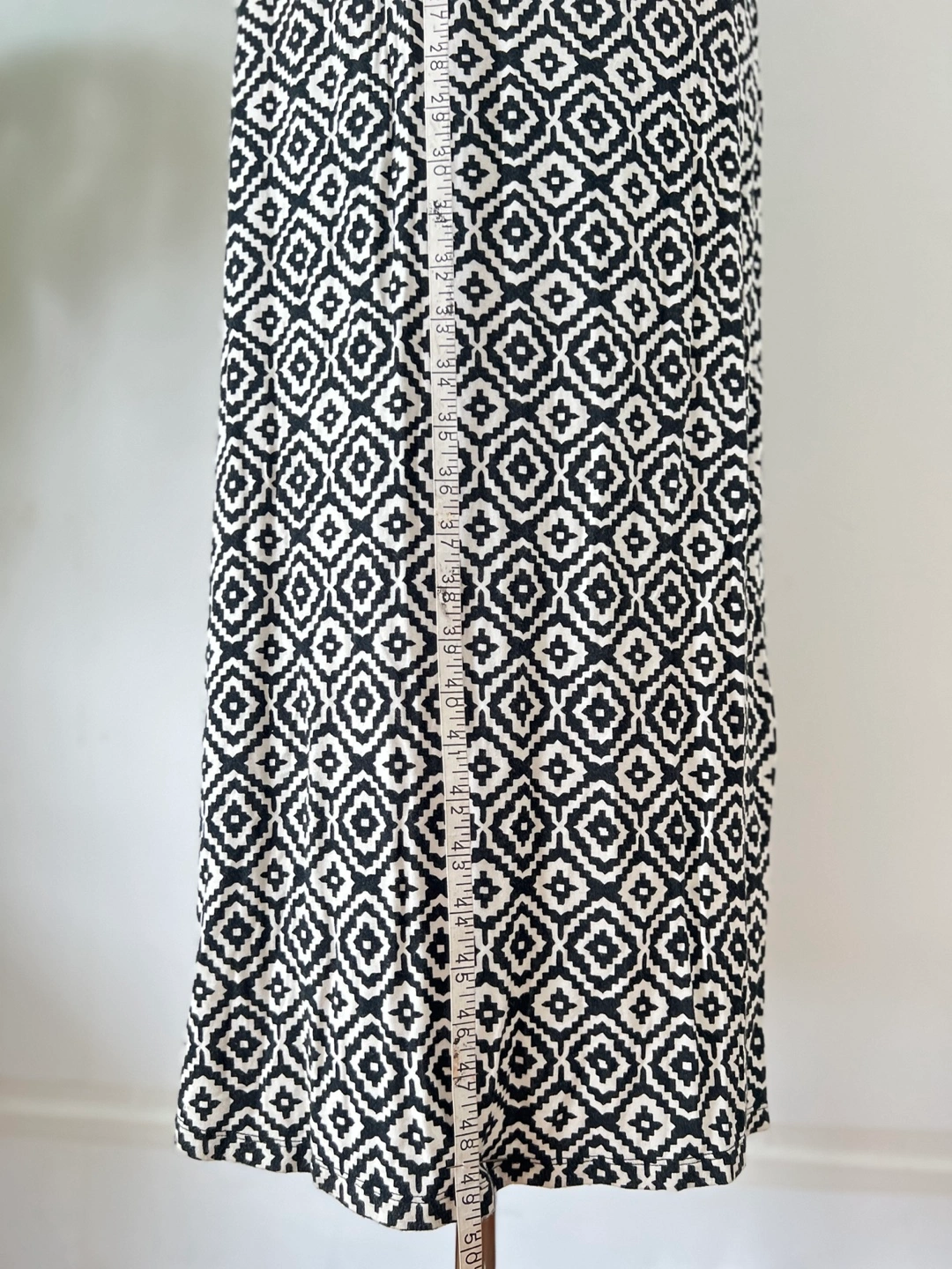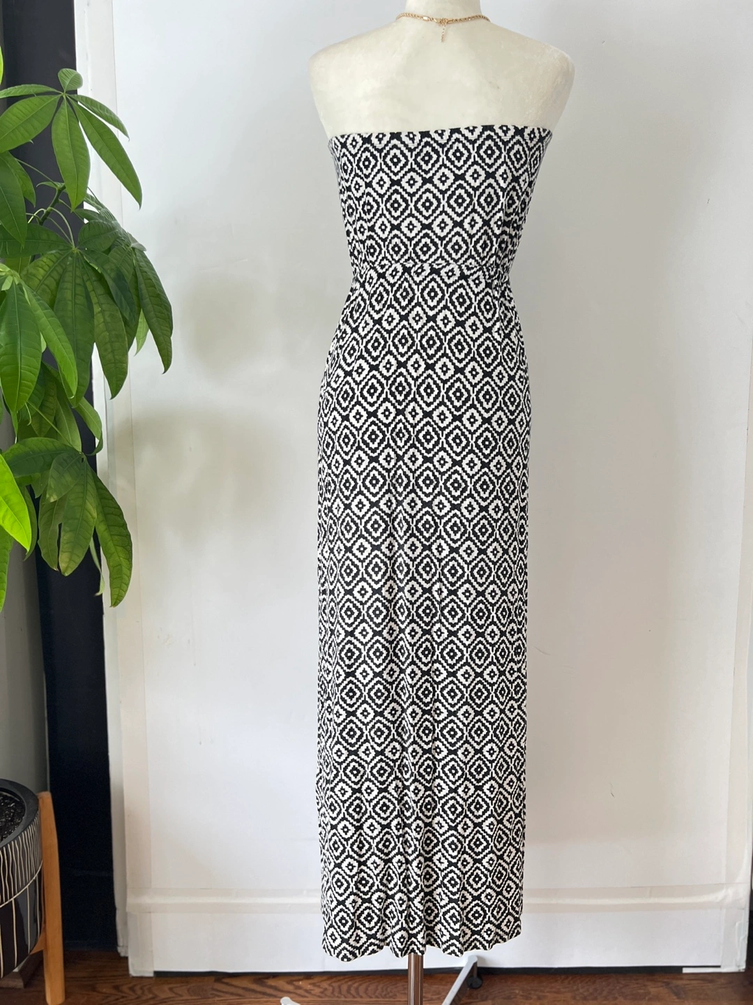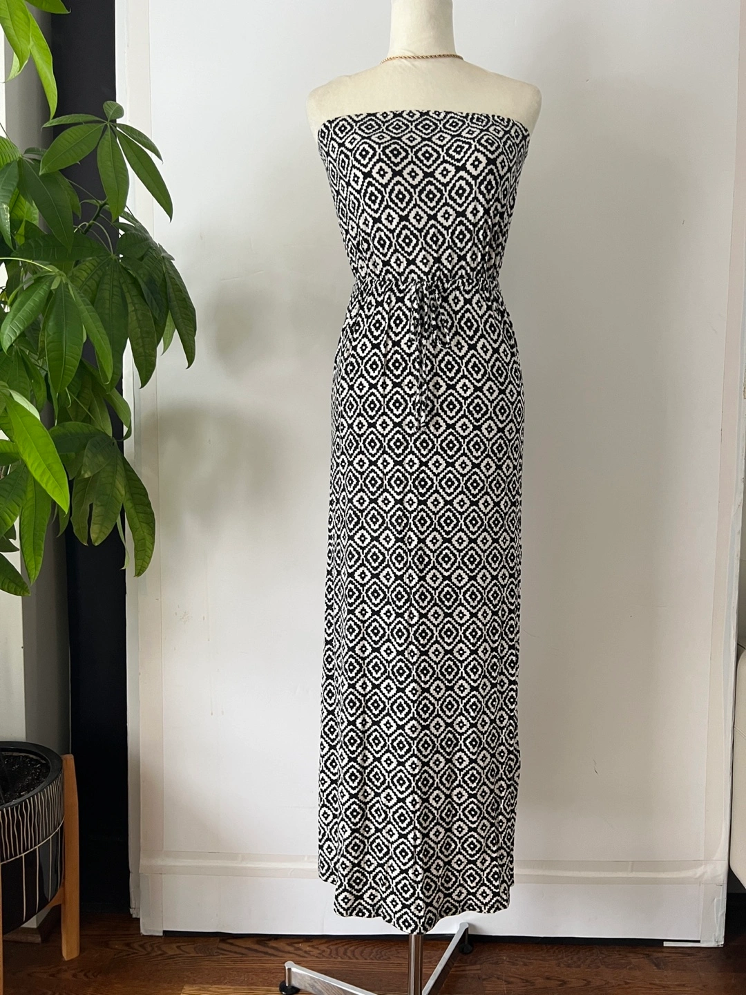Flowy strapless maxi dress. Black and white geometric print. Elastic waistband. Perfect for summer.