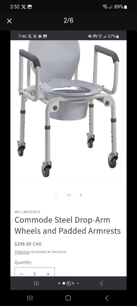 Steel commode, drop-arm design. Features padded armrests and wheels for mobility. Grey colour. Like new condition.