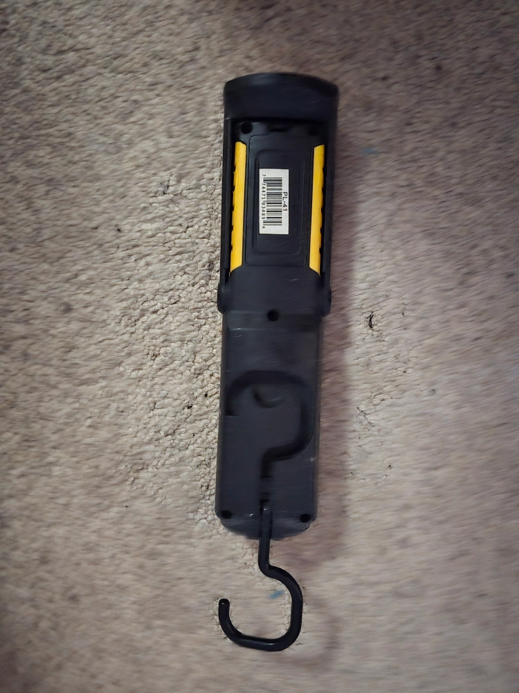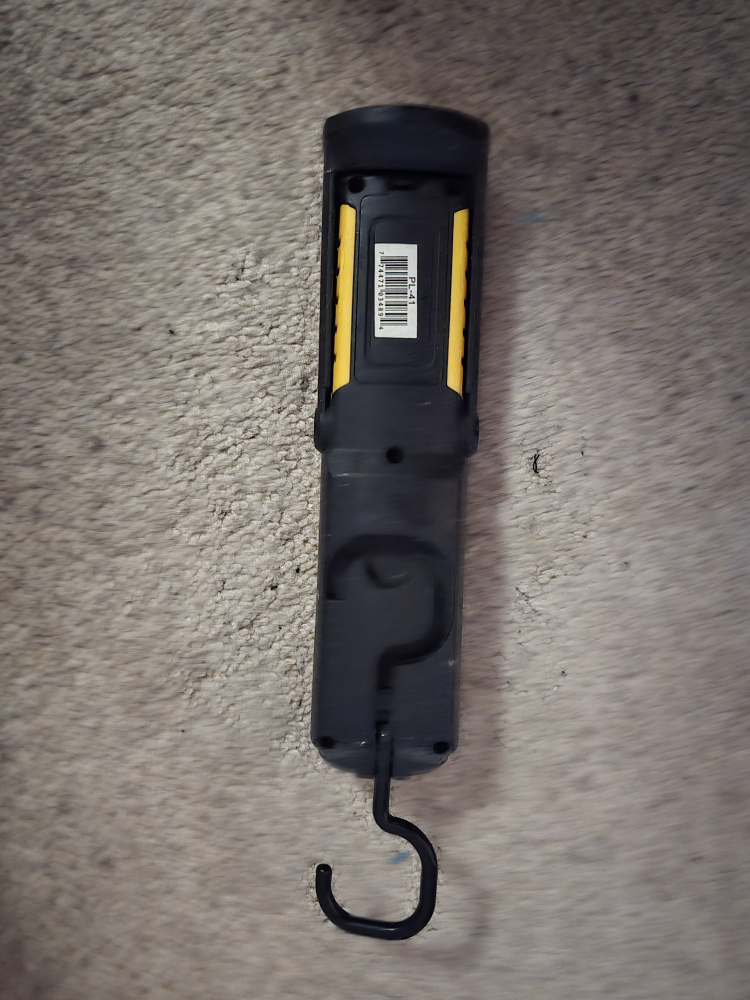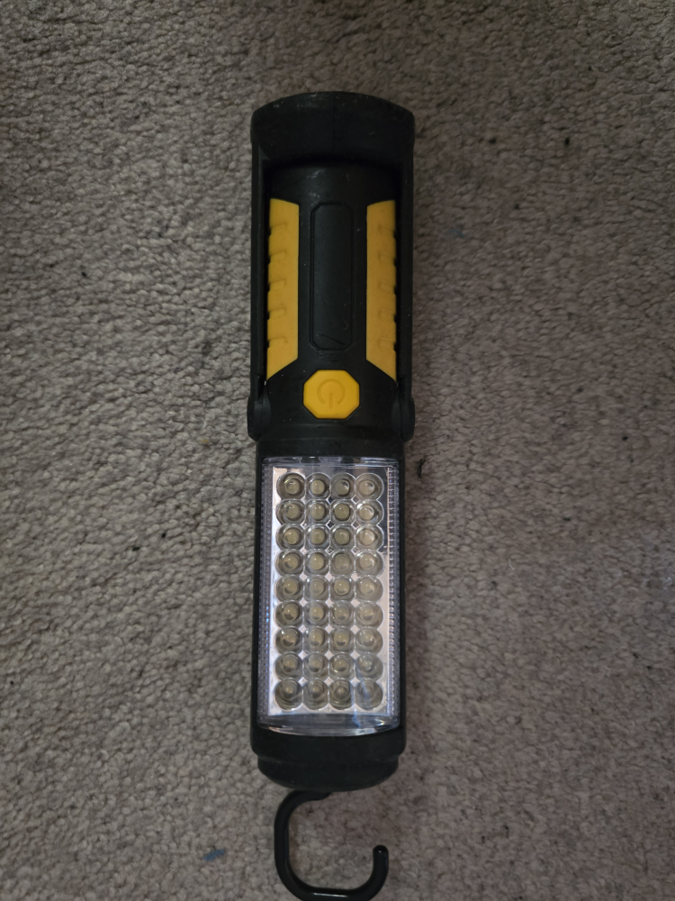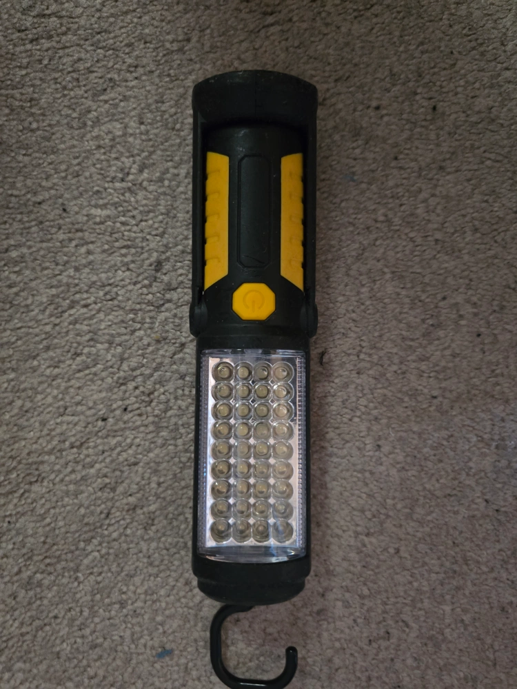 Portable LED work light. Multiple LEDs. Foldable design. Includes hanging hook. Compact and lightweight.