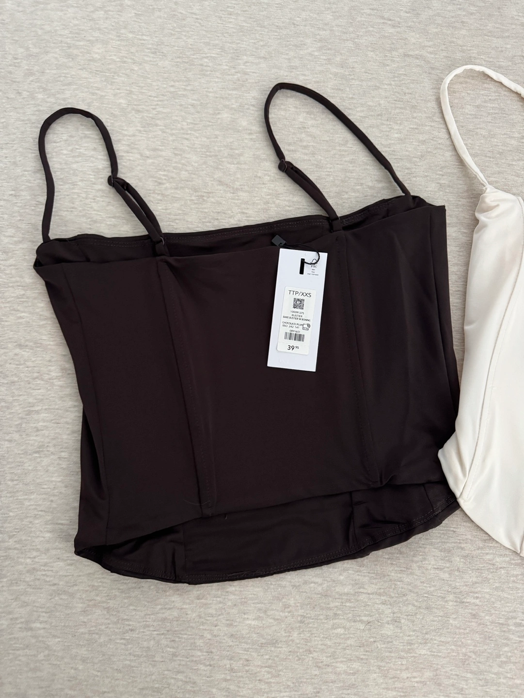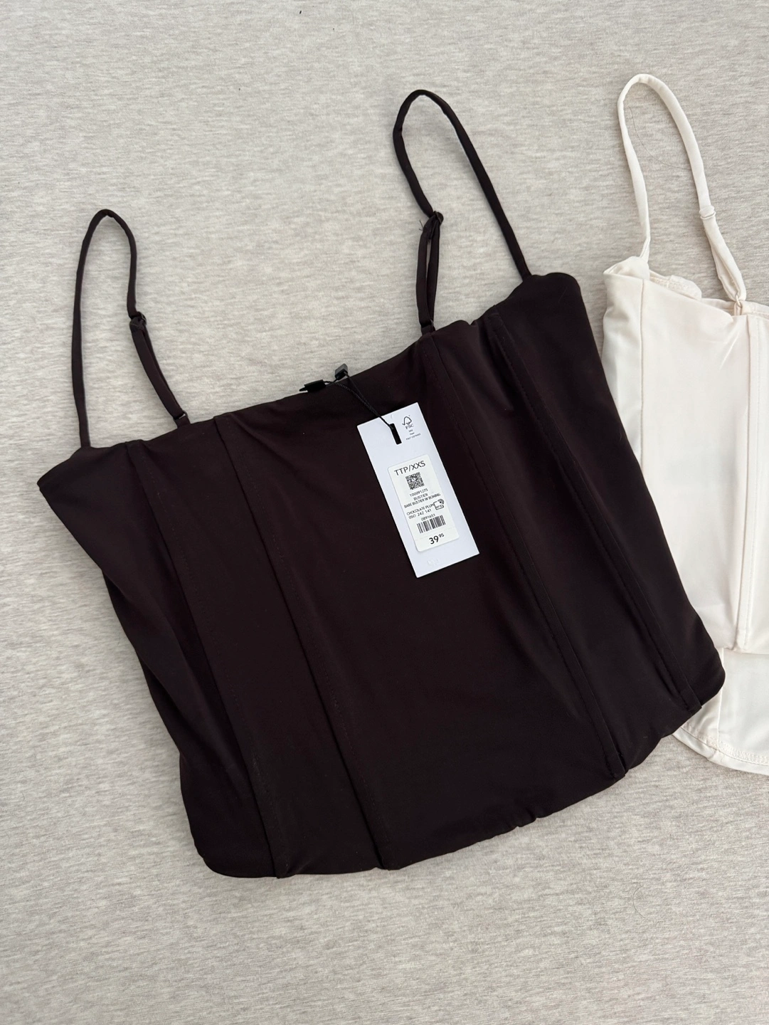 Brand new with tags. Two corset tops, one dark brown and one off-white. Size XXS. Adjustable straps. Classic style.