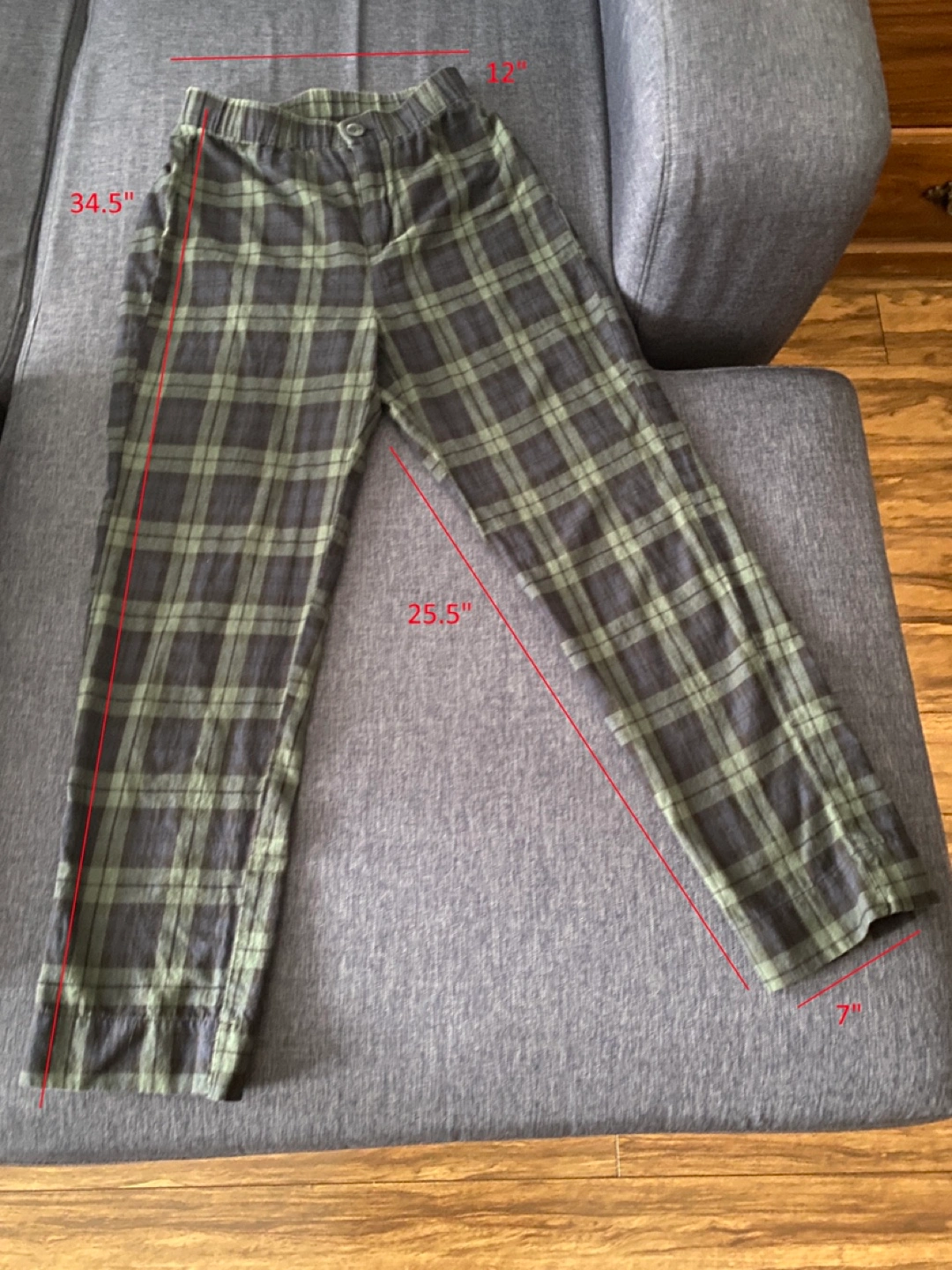 Green and black plaid pants. Elastic waistband, some stretch. Measurements included in image. Like new condition.