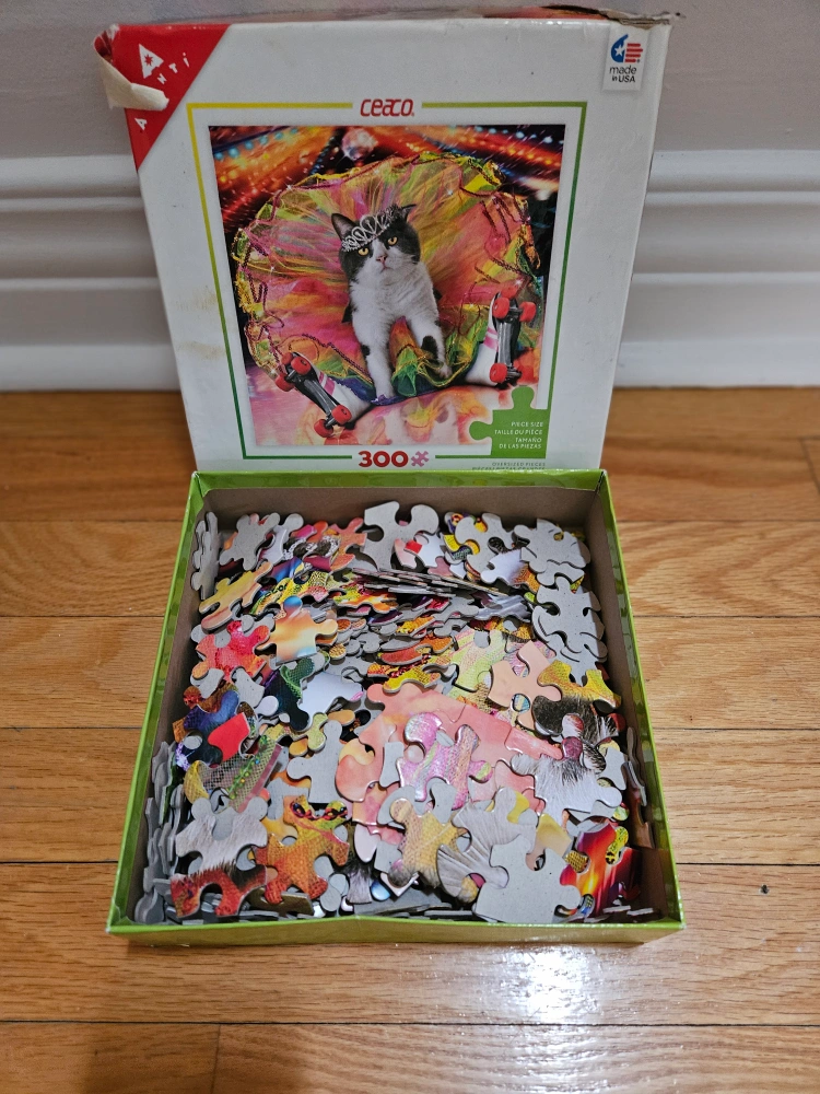300-piece jigsaw puzzle featuring a cat in roller skates. Image shows a tuxedo cat wearing a tutu and crown., pieces are loose in the box. only best offer pls.