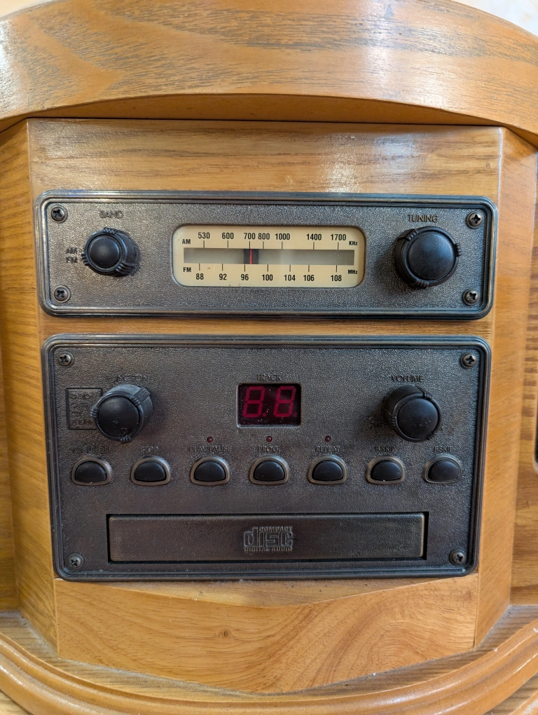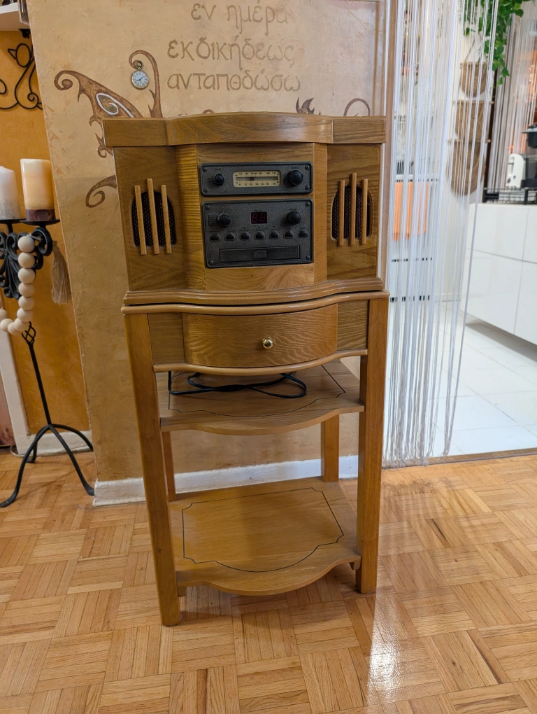 Retro-style wooden record console. Features AM/FM radio, CD player, tape player and 33/45/78 speed record player. Includes a small drawer for storage. Nice stand with two shelves.