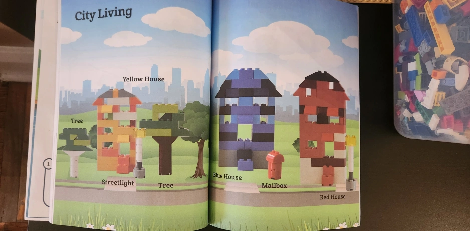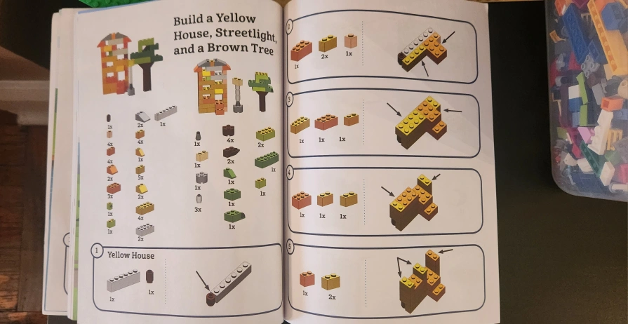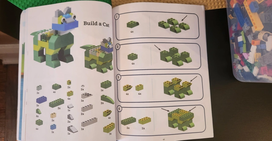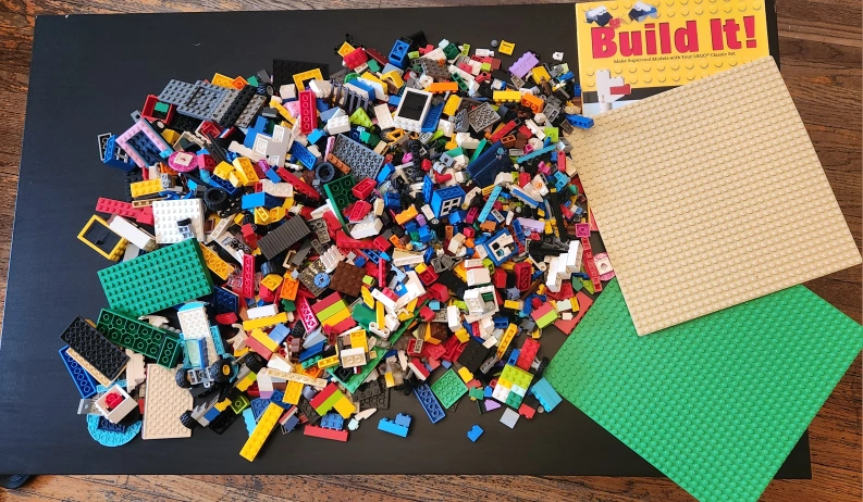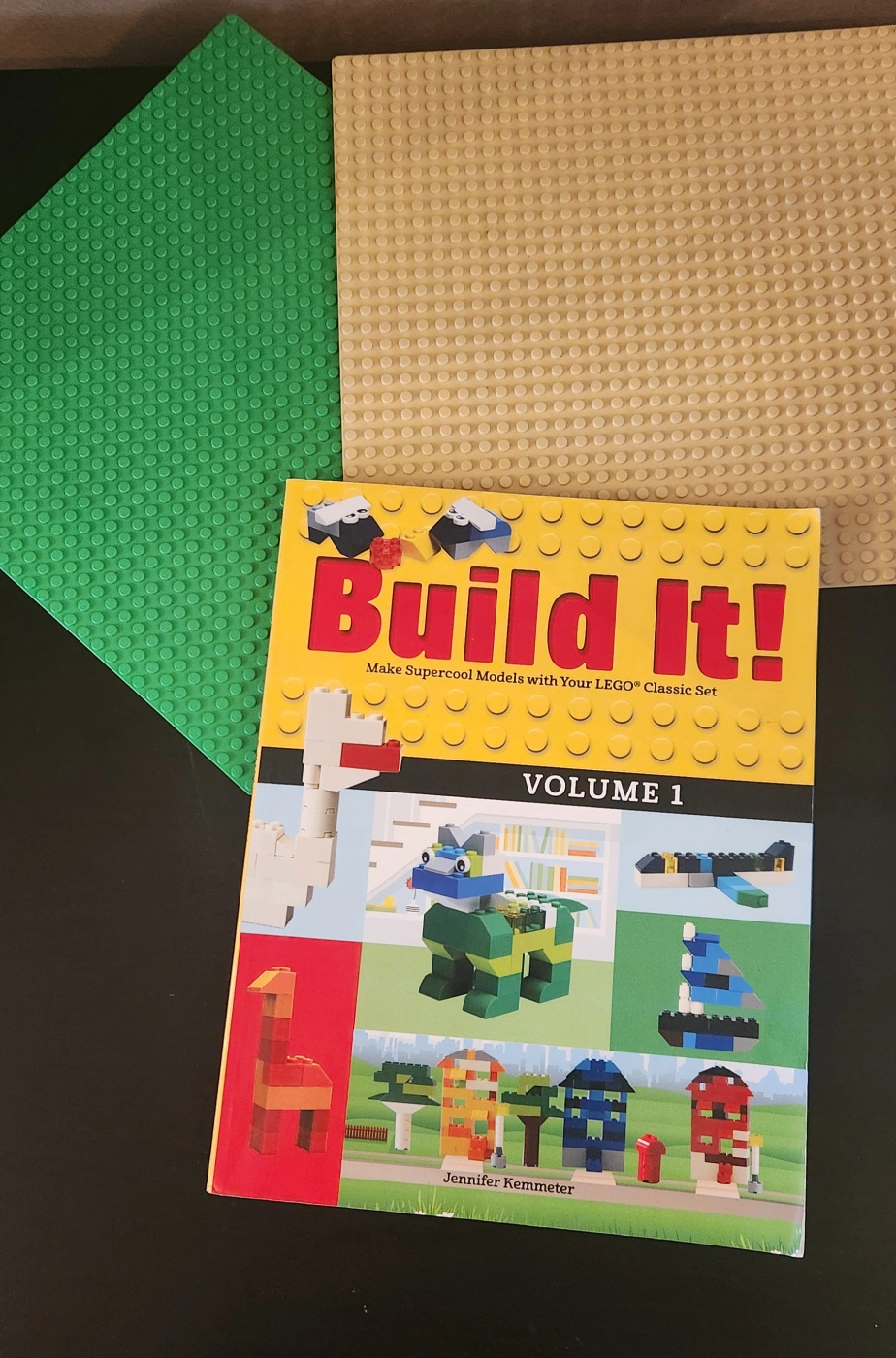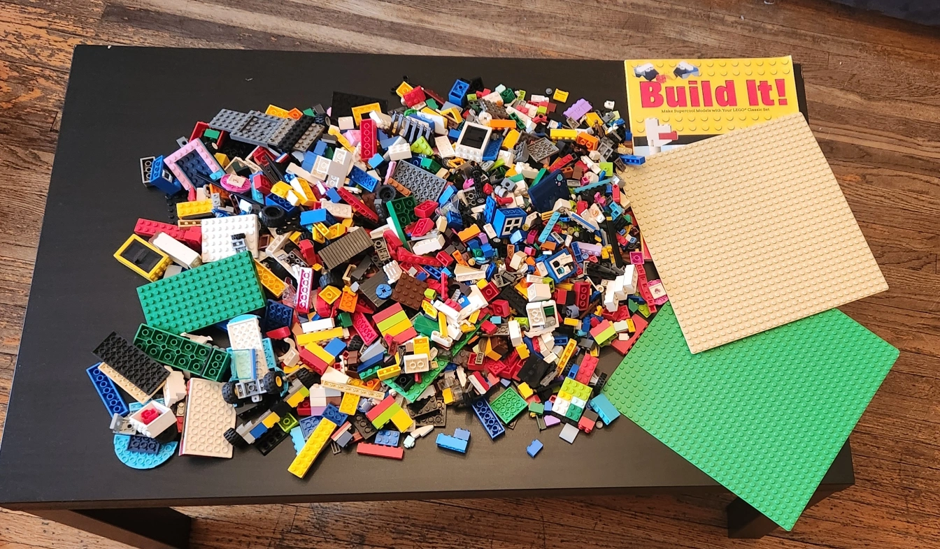 Large collection of LEGO bricks, various colours and sizes. Includes two baseplates, one green and one beige. Build It! Volume 1 instruction book included. Great for creative building. CLEAR BIN NOT INCLUDED