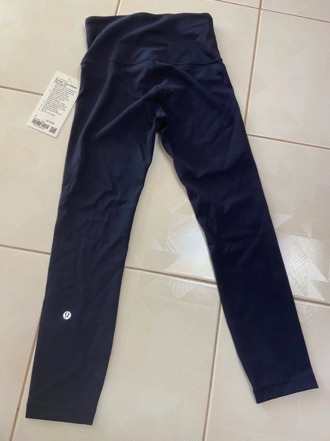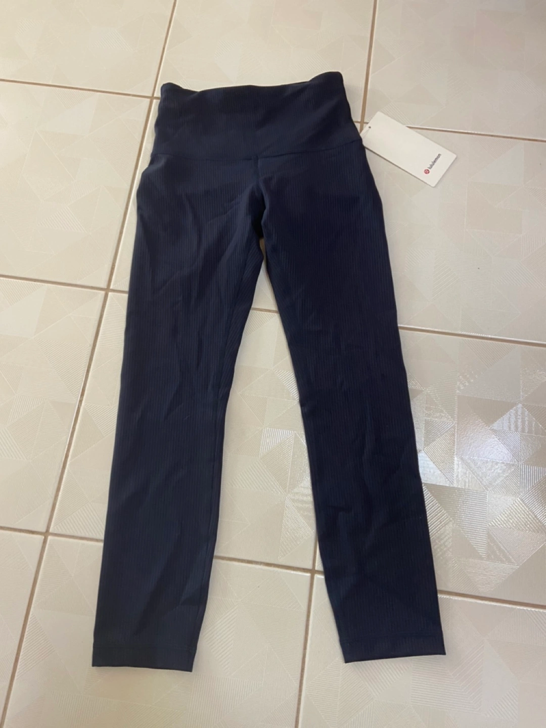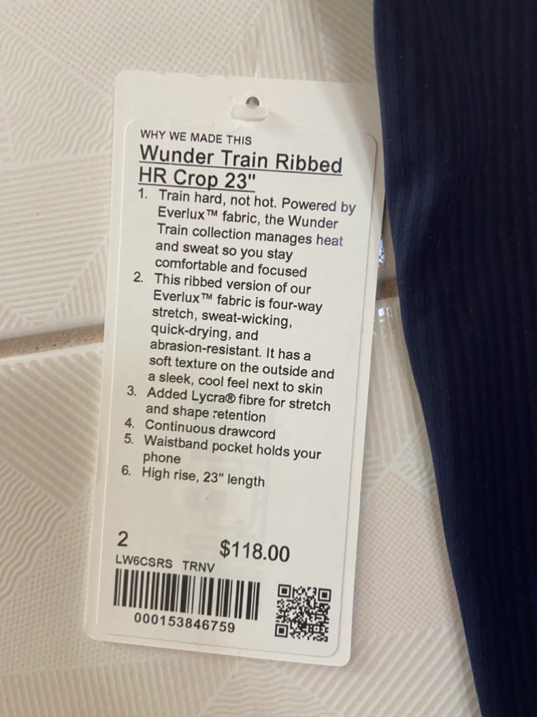 Brand new with tags. Wunder Train Ribbed HR Crop 23" leggings. Size 2. Navy Blue colour. High rise, 23" length. Four-way stretch. Quick-drying and sweat-wicking. Soft texture. Bought for $118