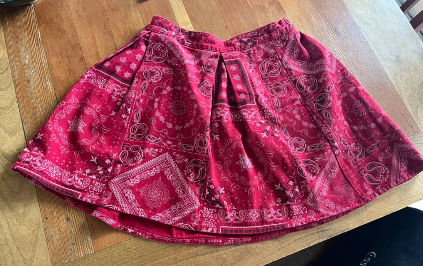 773Women's red bandana print corduroy skirt with a pleated design and elastic waistband. Comfy and cute! Fits size s-m. Note: we have a cat. Pick up close to Hastings and Boundary or at the downtown campus of Vancouver Community College (Monday to Thursday only).