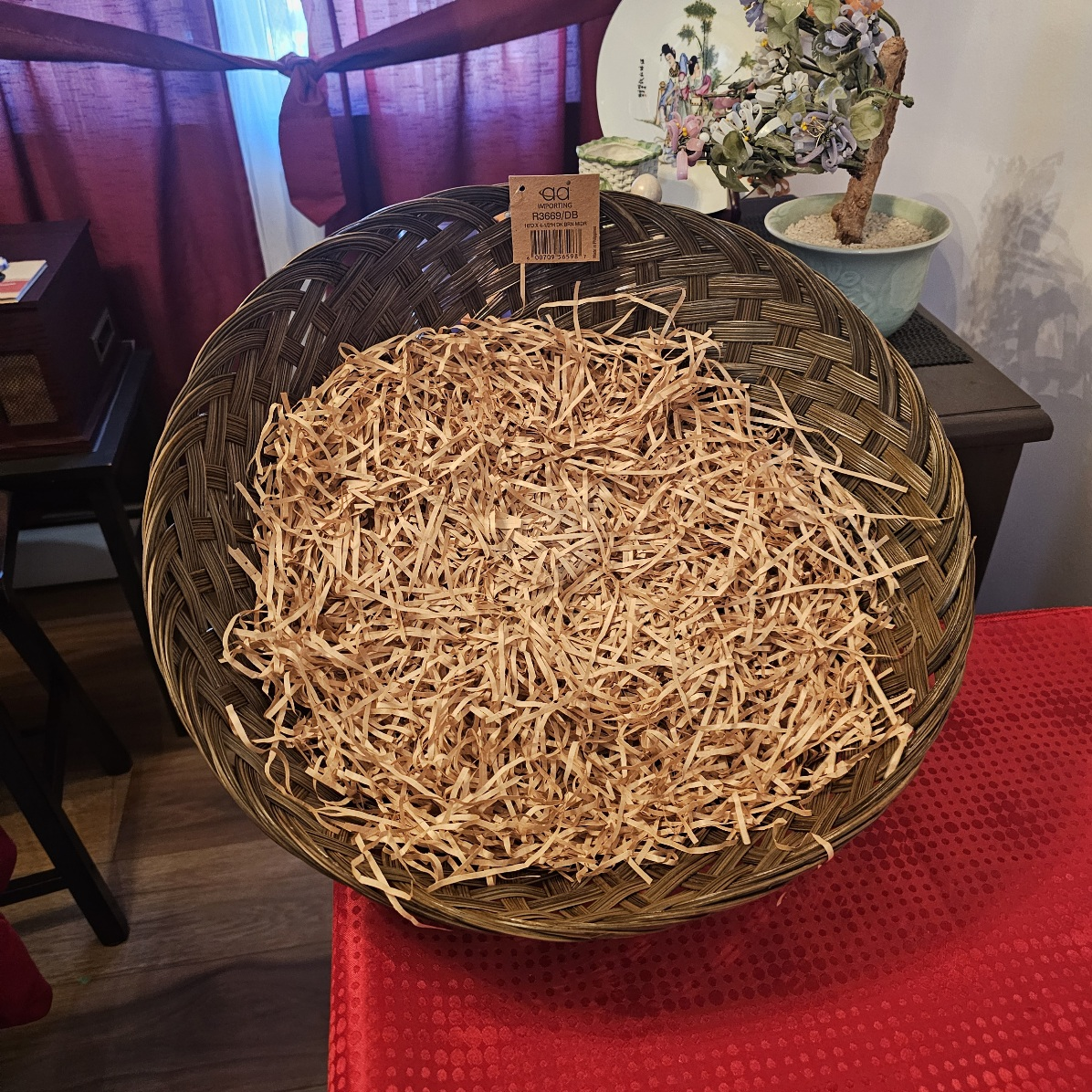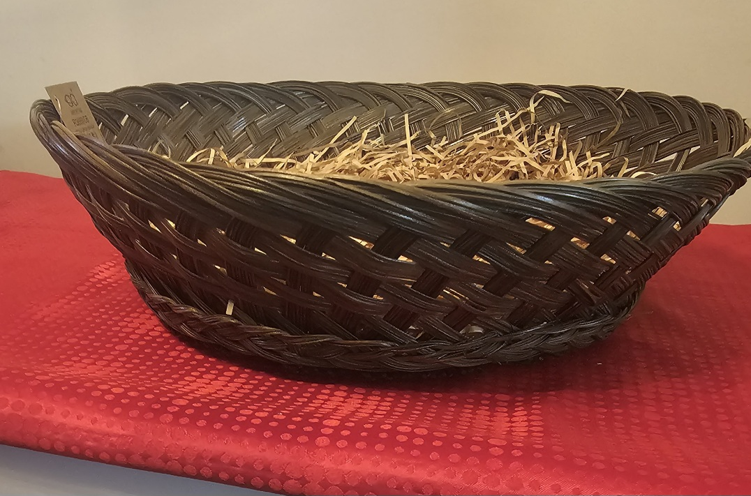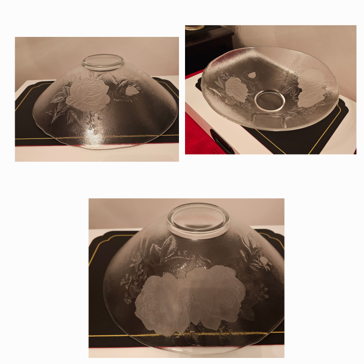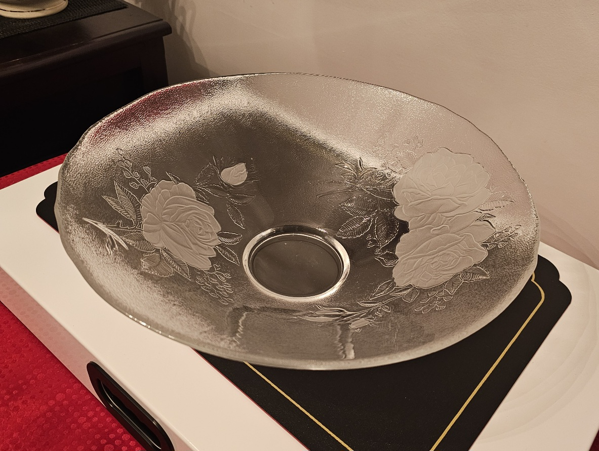 - Large glass serving bowl with etched rose design. Slightly scalloped edges. (VGUC)
