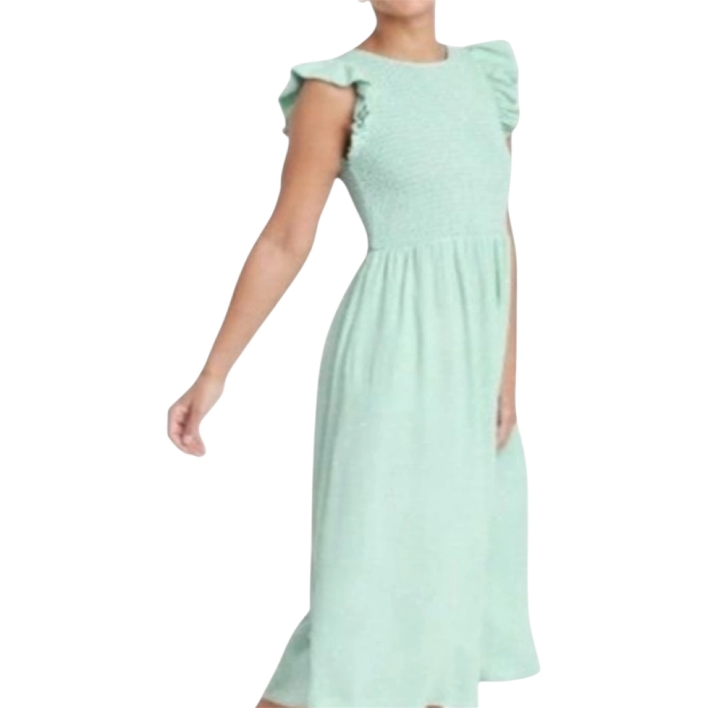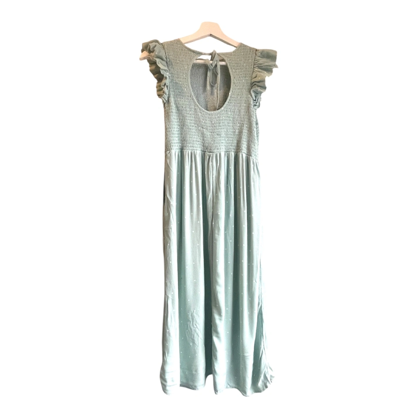 a new day Mint Green Polka Dot Ruffle Shoulder Sleeveless Smocked Dress Size Small Excellent condition Smocked chest and modest neckline. Back tie closure with keyhole detailing ensures easy wear. Flutter sleeves. Side inner pockets add functional style. Lightweight fabric keeps you in breathable comfort. 100% Rayon. Midi length. Length: 44.5" approx More measurements available upon request. Styles: beach bright casual cocktail contemporary cottagecore cruise date night feminine flowy pastel print spring stretch summer sun travel vacation wedding guest