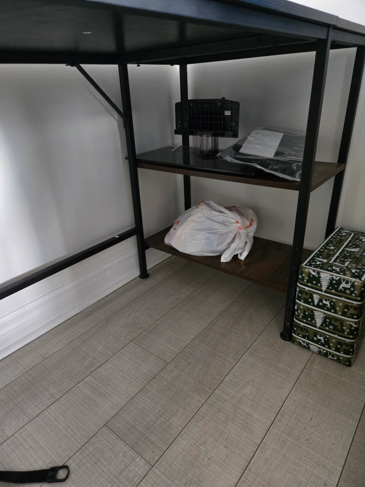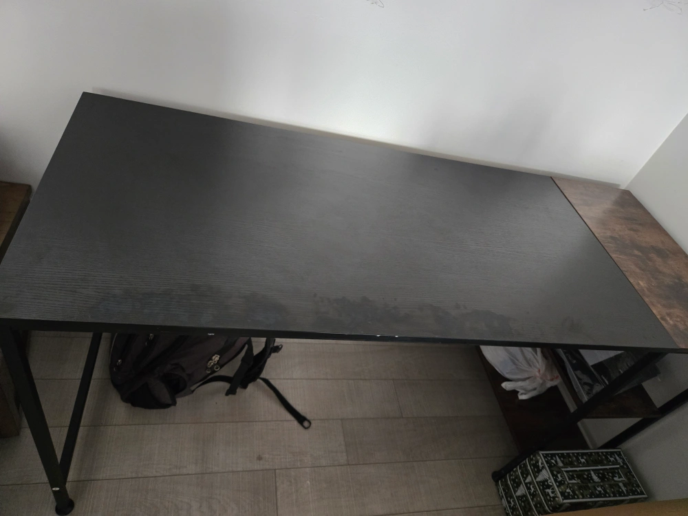 Rustic brown and black computer desk with two shelves. Includes a large work surface and a smaller side shelf. Features a spacious work surface and a lower shelf for storage. Metal frame