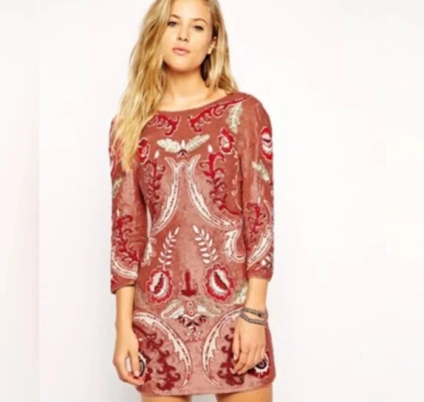 Stunning sequined mini dress. Features three-quarter sleeves, a low back, and beautiful red and rose gold embroidery. Perfect for a special occasion.